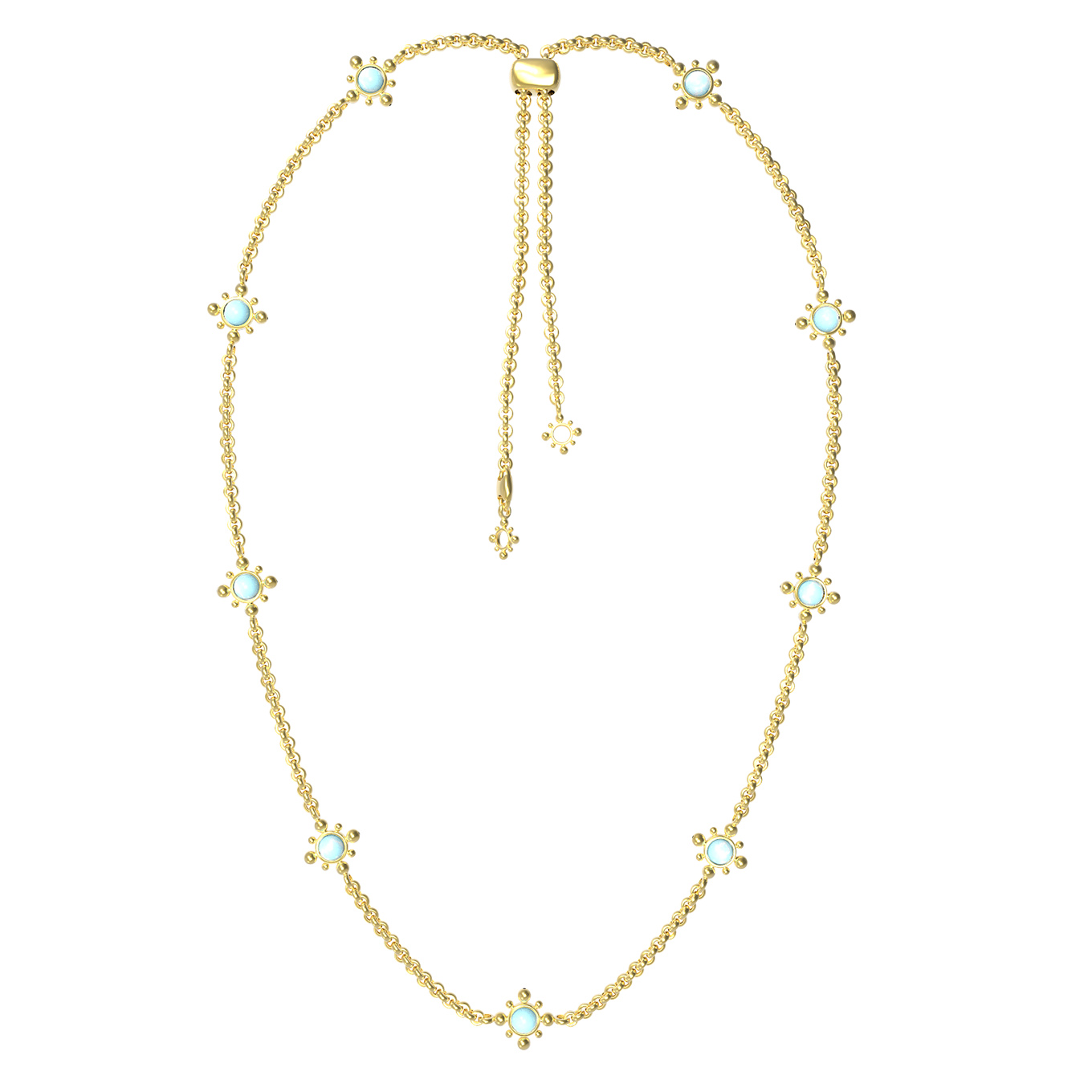 В центре композиции и по всей длине цепочки расположены 9 бирюзовых вставок, имеющих классическую форму бусины. Деликатная оправа каждой бусины повторяет восточные мотивы, создавая единый стилистический ансамбль. Благодаря лаконичному и при этом выразительному дизайну, данное колье универсально: оно подойдет как для женщин, так и для мужчин, предпочитающих утонченные аксессуары.