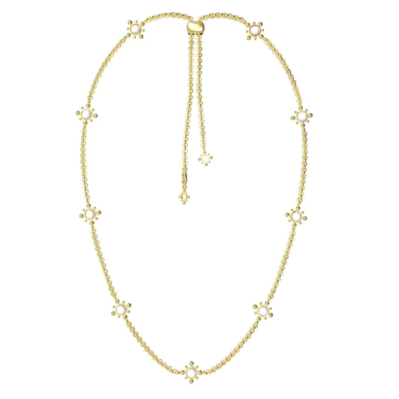 Центральным элементом композиции стали вставки из натурального агата. Девять вставок выполнены в форме аккуратных бусин белого цвета, что создает гармоничный контраст с золотой оправой. Такая сдержанная цветовая палитра позволяет колье легко сочетаться с любым гардеробом, от делового костюма до вечернего наряда. Регулируемая конструкция цепи делает посадку комфортной, а дизайн изделия позволяет носить его как самостоятельный аксессуар, так и в качестве части комплекта.