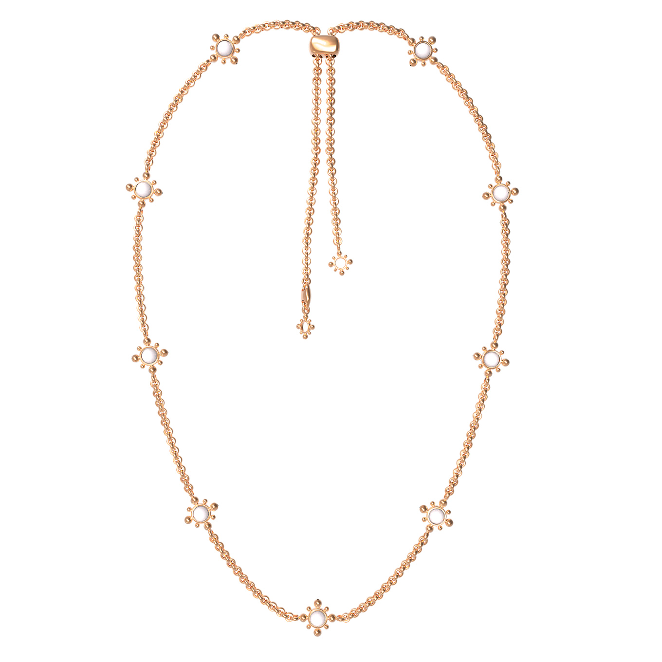 Центральным акцентом дизайна стали 9 вставок из натурального агата. Камни белого цвета имеют изящную форму бусины, аккуратно интегрированную в цепочное плетение. Белоснежная чистота агата эффектно контрастирует с теплым красным золотом, создавая гармоничную и привлекательную композицию. Каждое звено тщательно проработано, обеспечивая удобство и грацию при ношении.