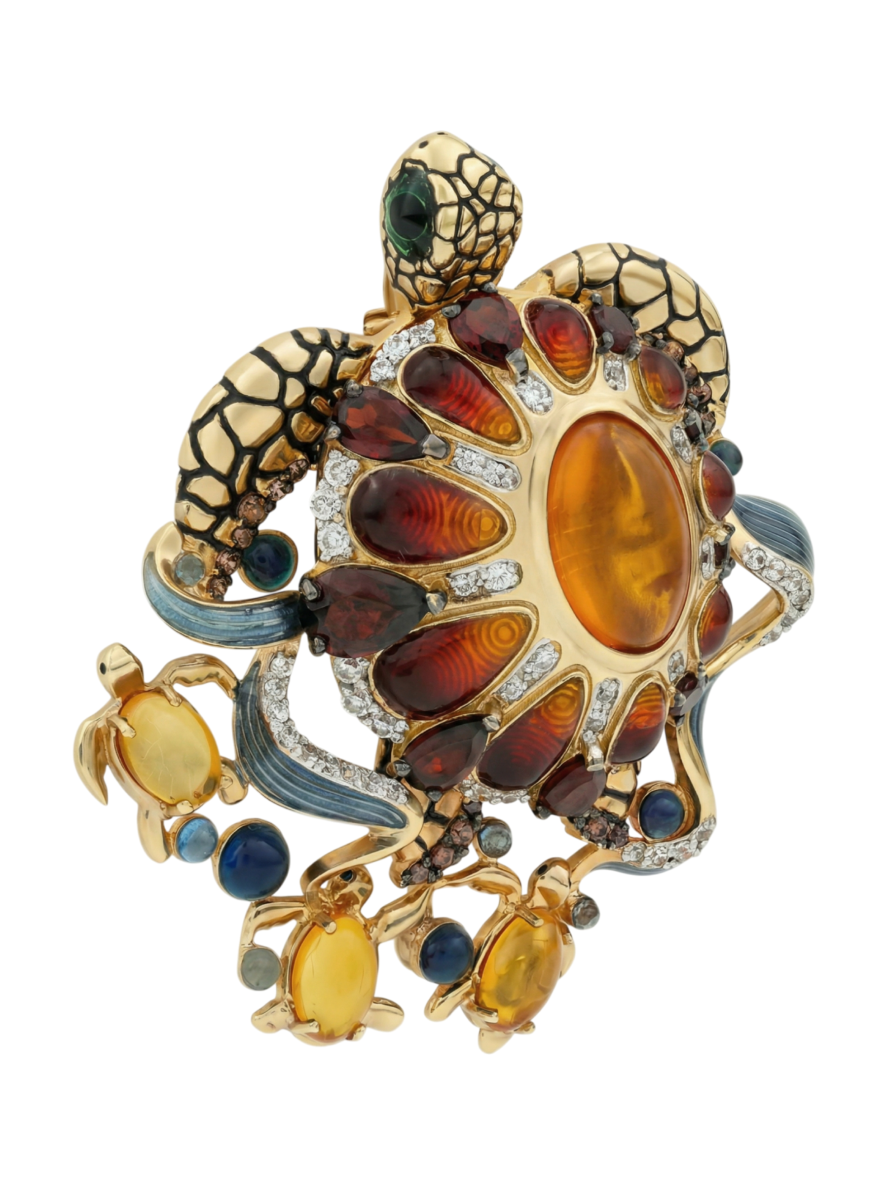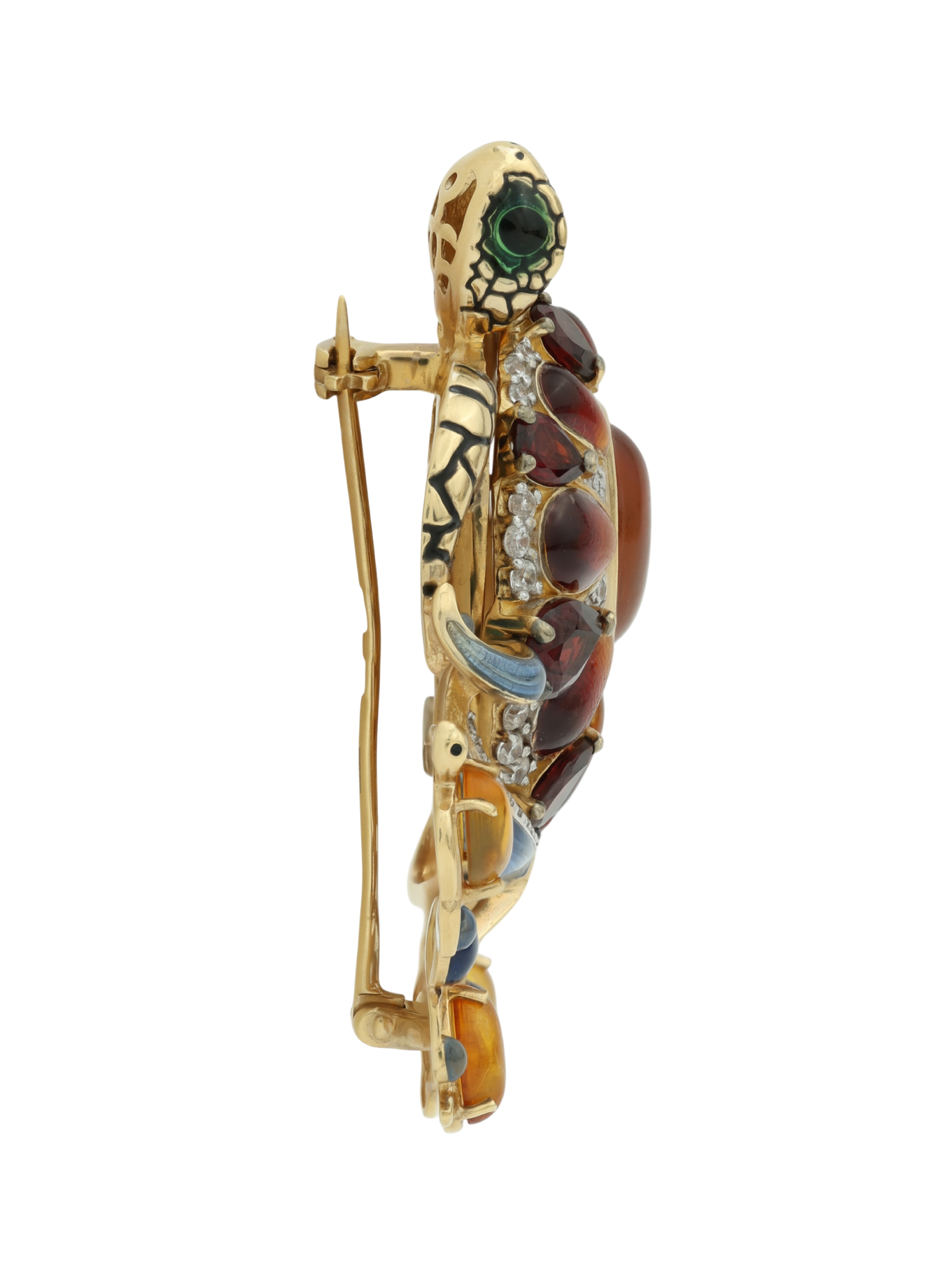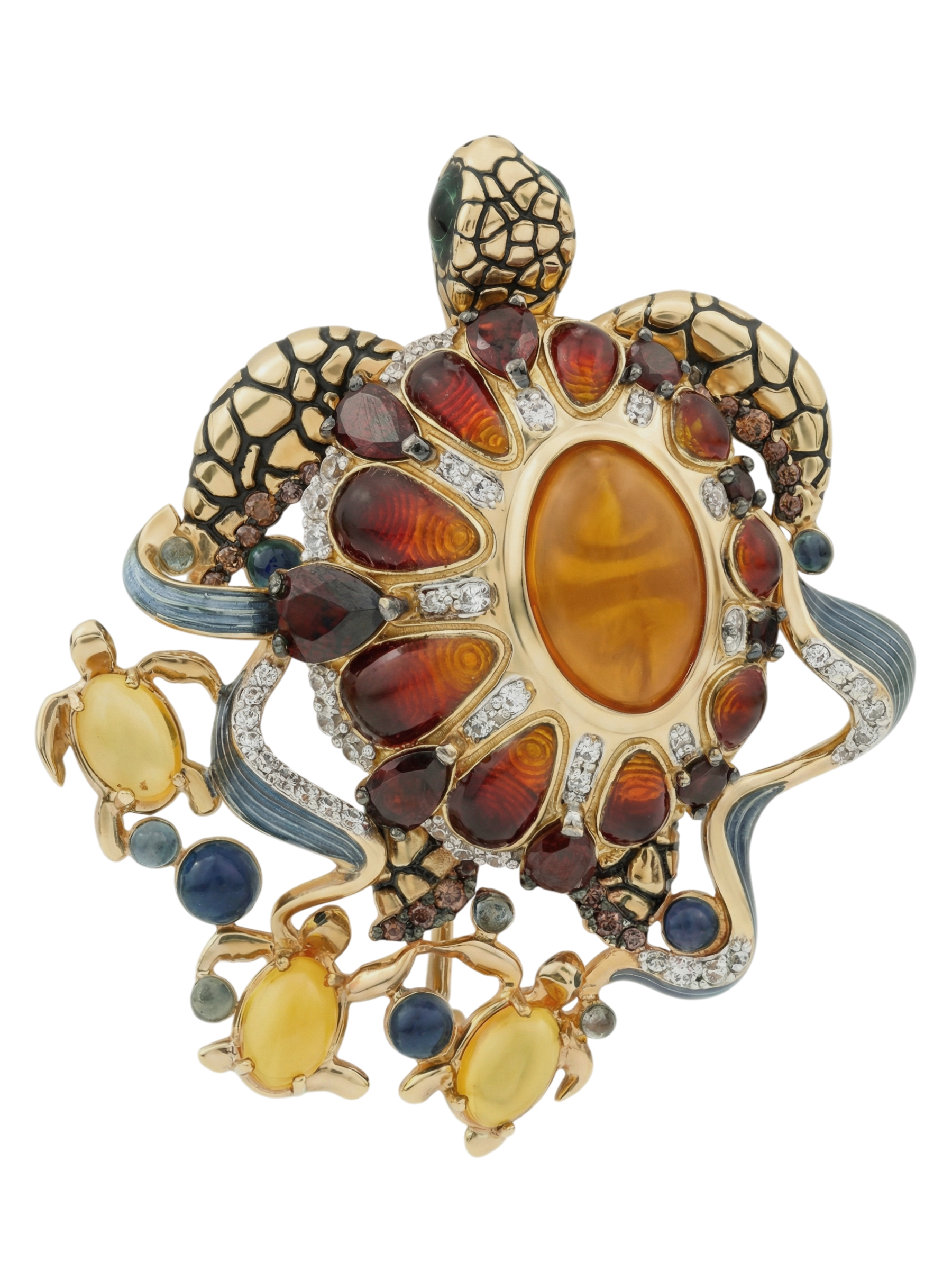 Брошь из лимонного золота c эмалью, фианитом, гранатом и янтарём