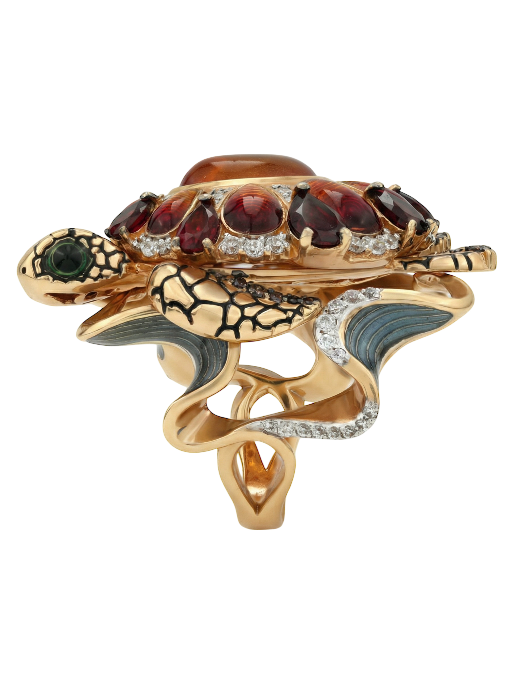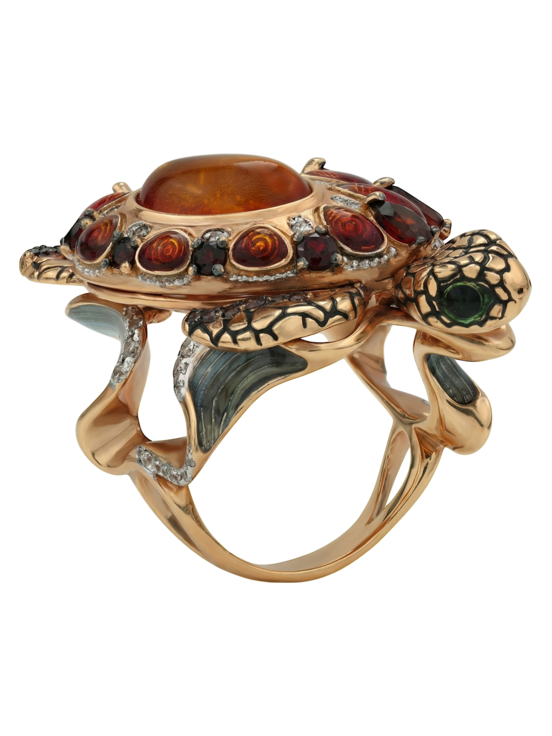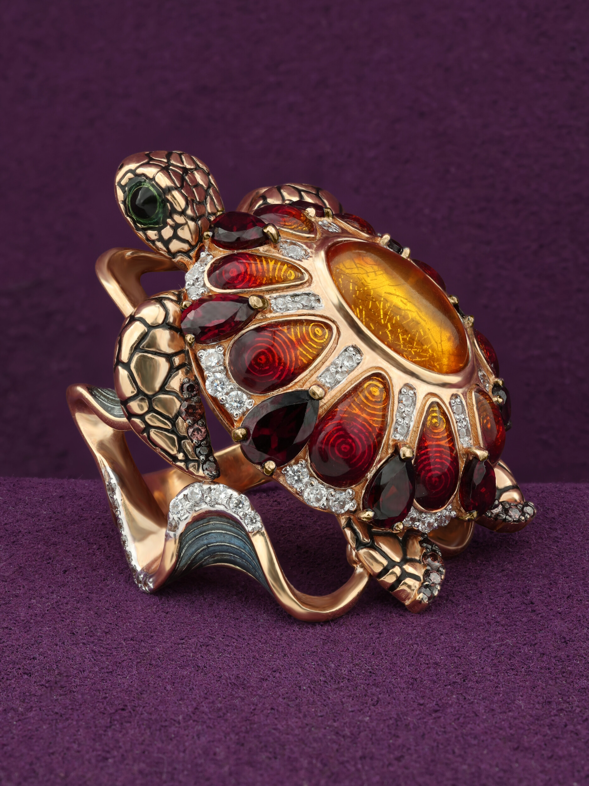 Центральным элементом композиции выступает крупный янтарь, окруженный россыпью из 85 вставок. Искусное сочетание красного граната, прозрачного фианита и яркой эмали создает сложный, многогранный рисунок на панцире. Использованные вставки разнообразных форм — груша, круг и овал — придают изделию динамику, а их цветовая палитра, включающая коричневые, красные, оранжевые и разноцветные оттенки, притягивает взгляд и завораживает блеском.