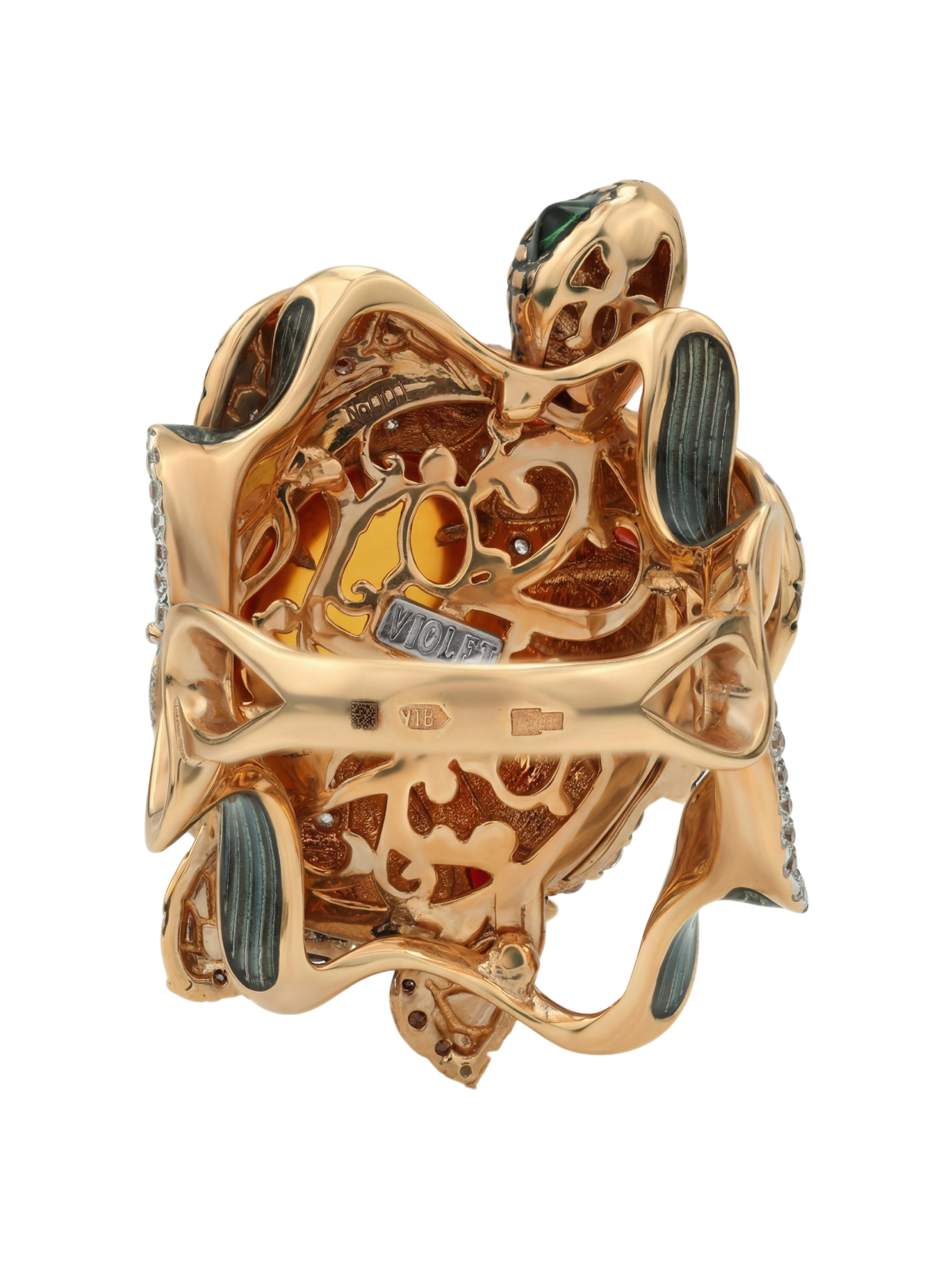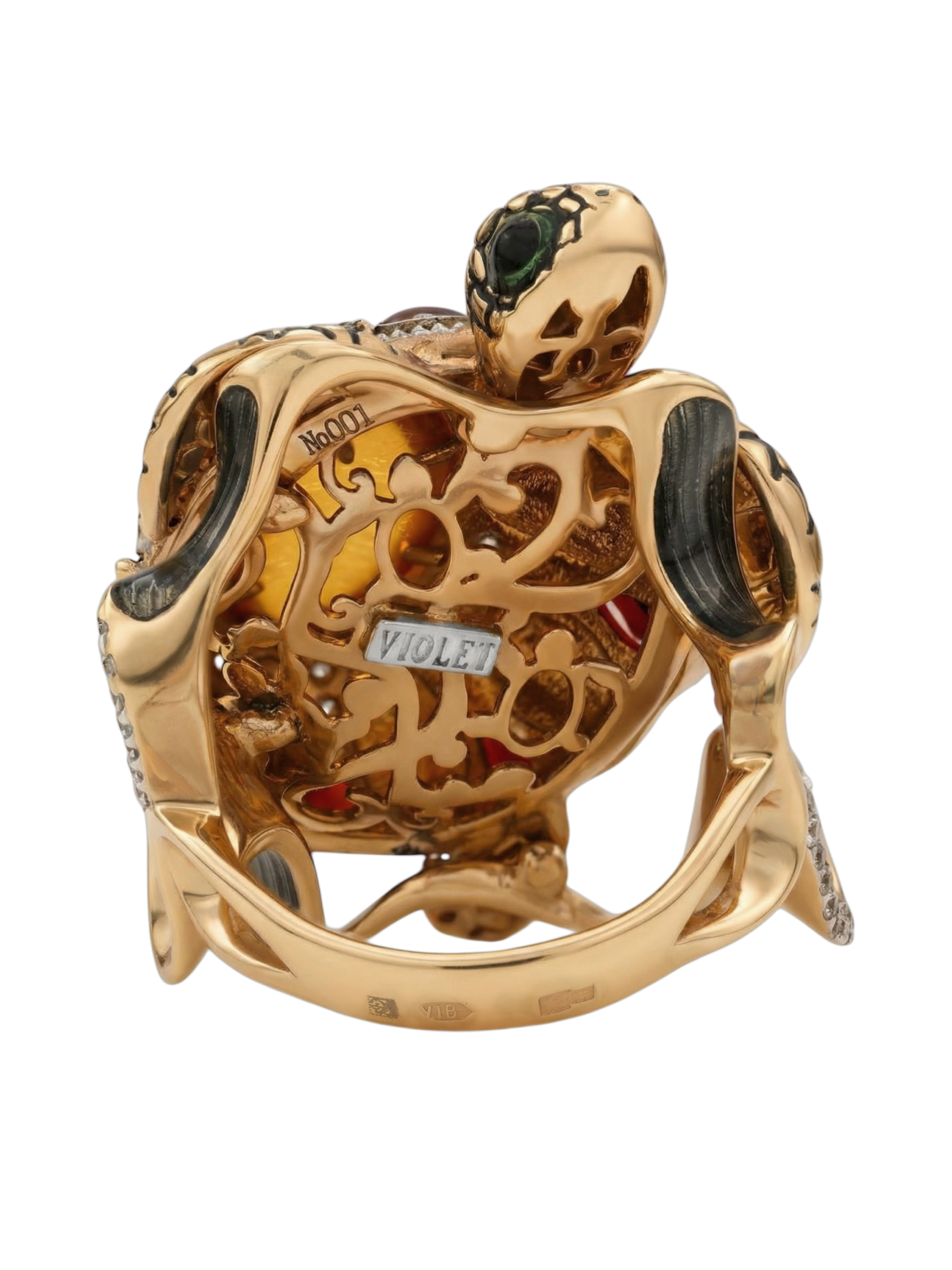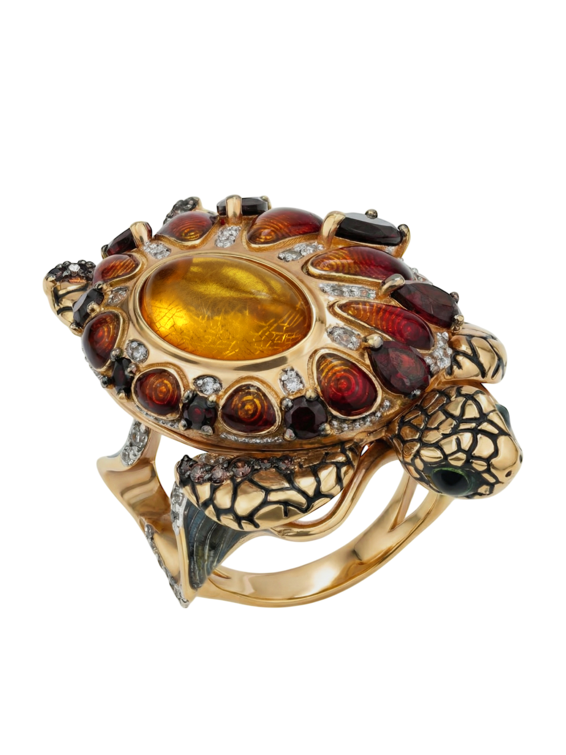 Центральным элементом композиции выступает крупный янтарь, окруженный россыпью из 85 вставок. Искусное сочетание красного граната, прозрачного фианита и яркой эмали создает сложный, многогранный рисунок на панцире. Использованные вставки разнообразных форм — груша, круг и овал — придают изделию динамику, а их цветовая палитра, включающая коричневые, красные, оранжевые и разноцветные оттенки, притягивает взгляд и завораживает блеском.