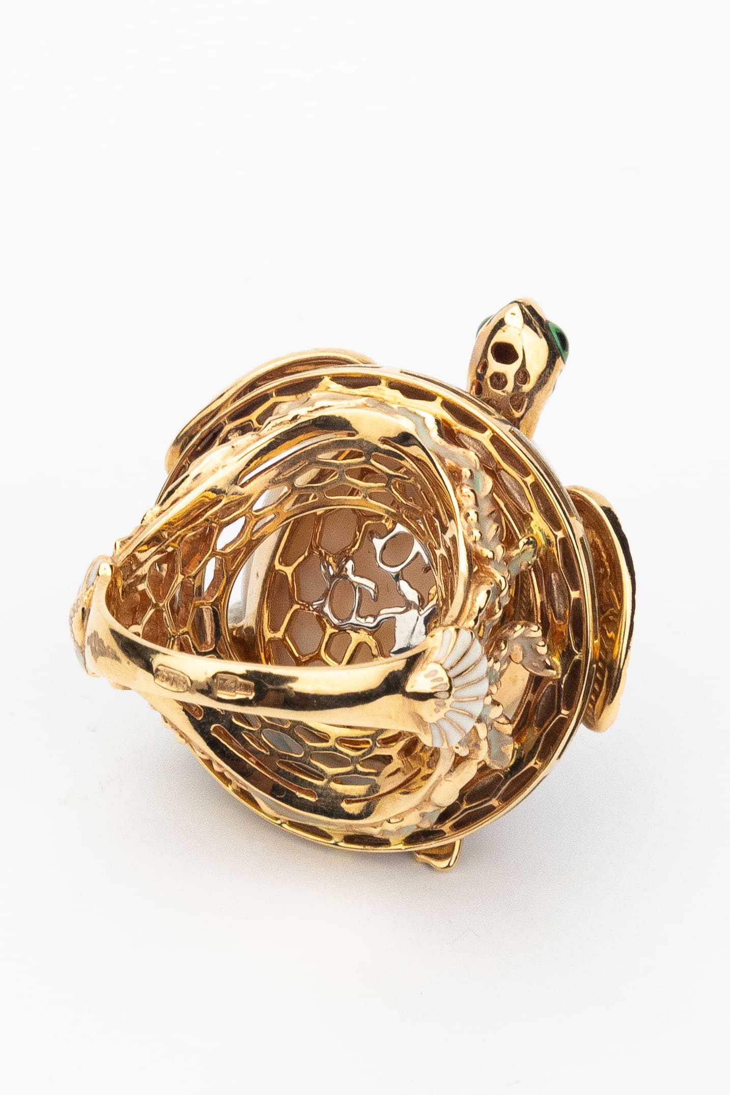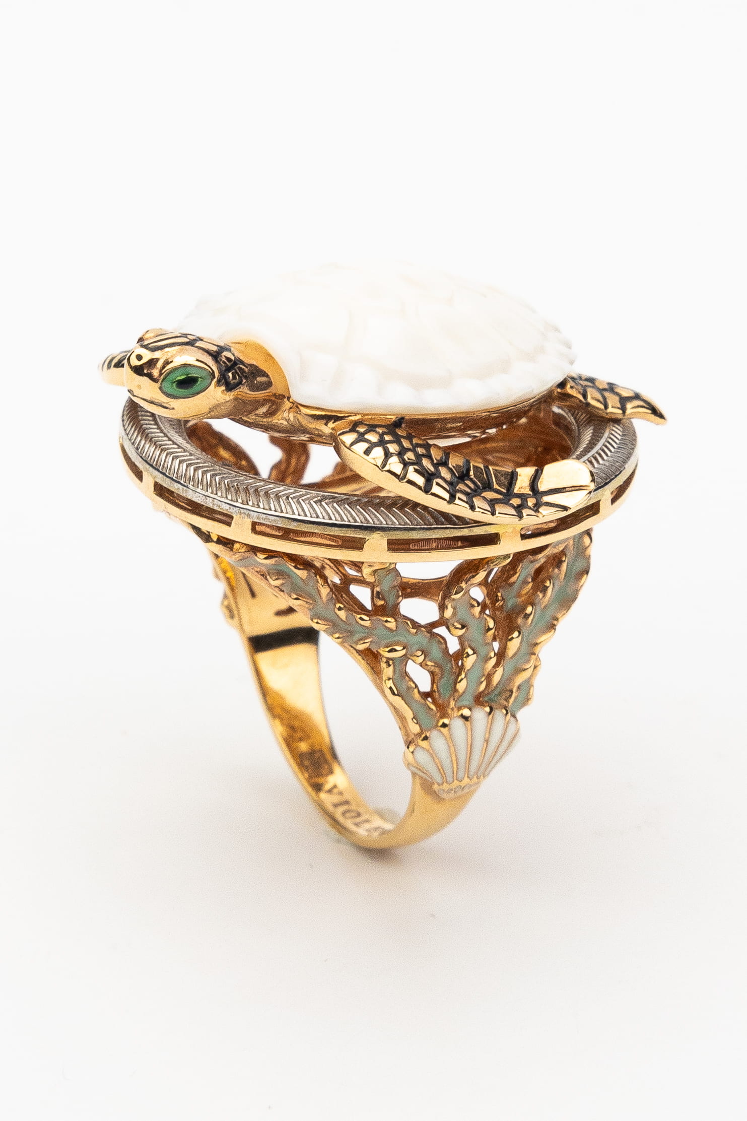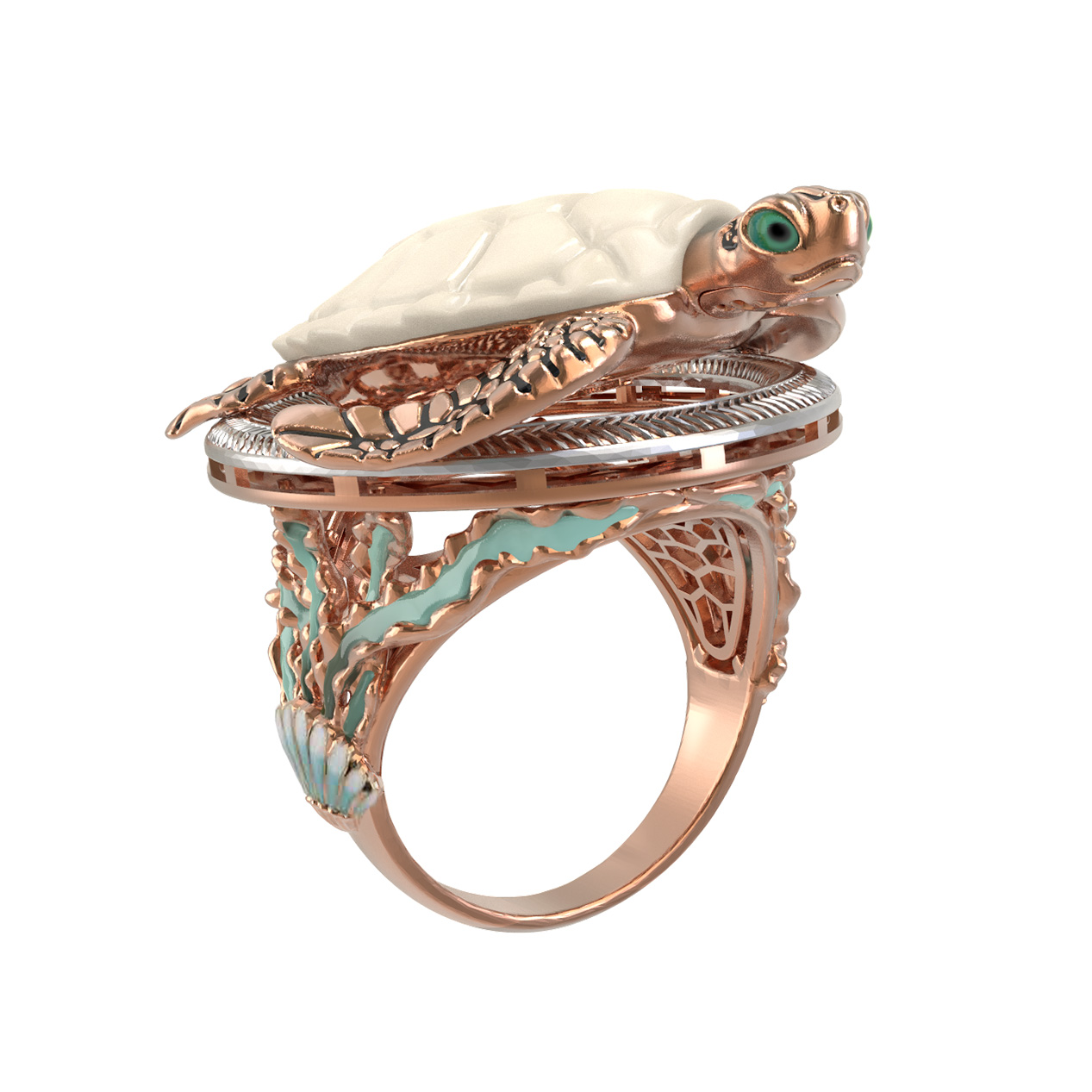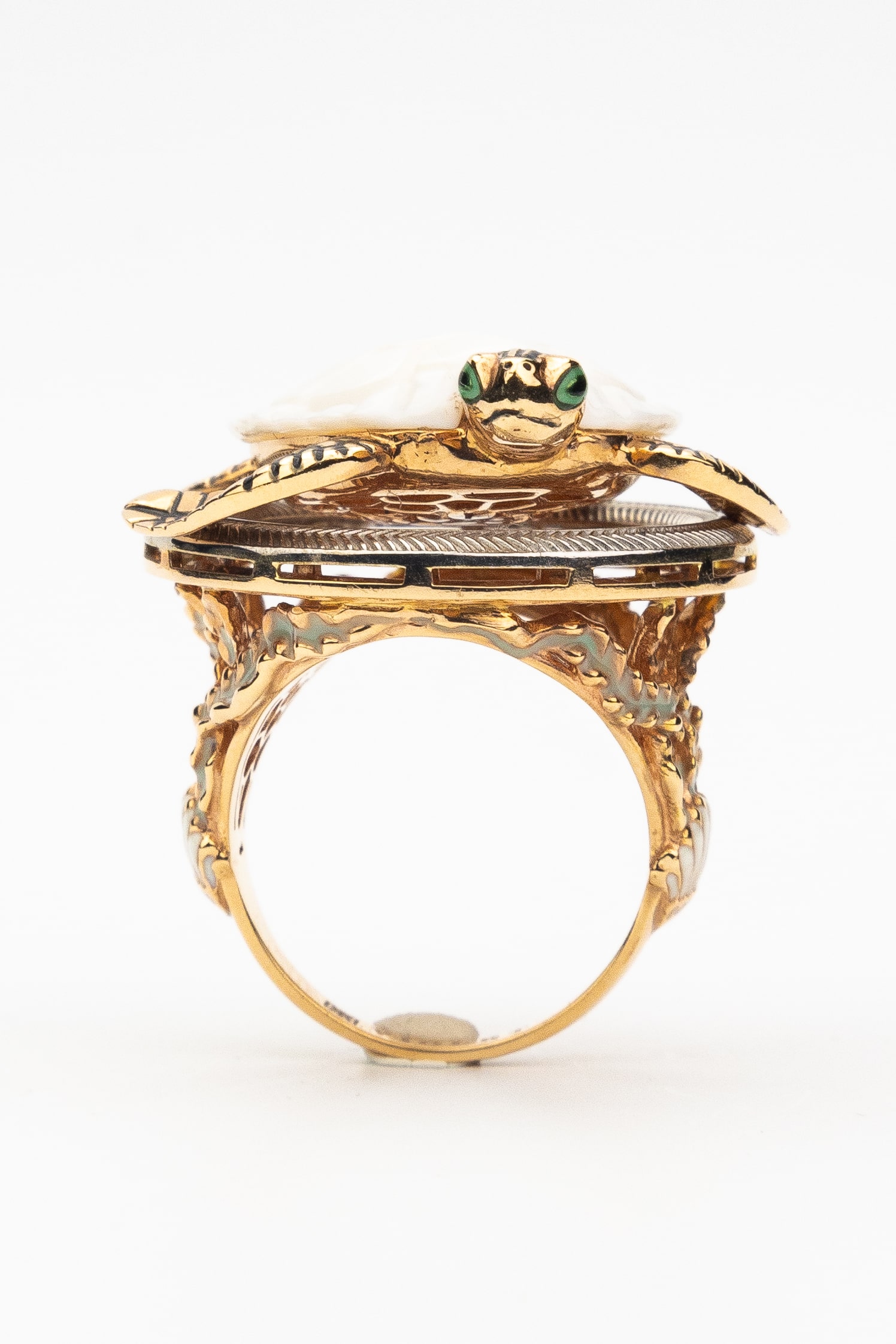 Основой изделия служит качественное красное золото 585 пробы, которое придает украшению теплый, благородный оттенок. Мастерское сочетание материалов создает неповторимый визуальный эффект: панцирь черепахи выполнен из натурального бивня мамонта белого цвета, что придает кольцу особый шарм, а декоративная эмаль разноцветных оттенков добавляет яркие и живые акценты. Каждая деталь проработана с максимальной тщательностью, чтобы подчеркнуть природную грацию выбранного образа.