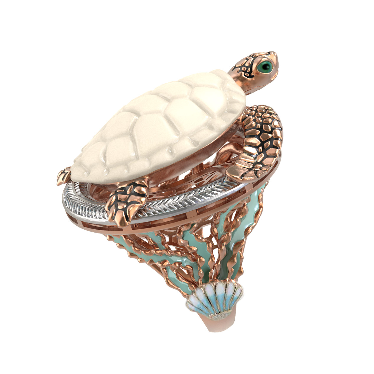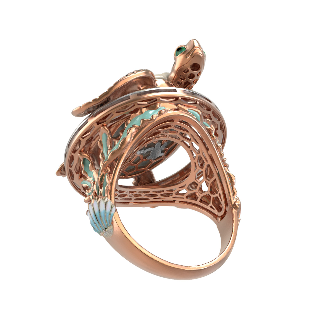 Это кольцо с дизайном черепахи является частью комплекта, что позволяет собрать полноценный гарнитур для завершенного образа. Широкий размерный ряд, включающий размеры от 15 до 23, позволяет подобрать идеальный вариант для любого пальца. Выбирая это украшение, вы приобретаете ювелирный шедевр, который сочетает в себе классические традиции обработки красного золота, эксклюзивные вставки из бивня мамонта и мастерство работы с эмалью. Такое кольцо станет достойным пополнением вашей коллекции драгоценностей или роскошным подарком для ценителя эксклюзивных изделий.