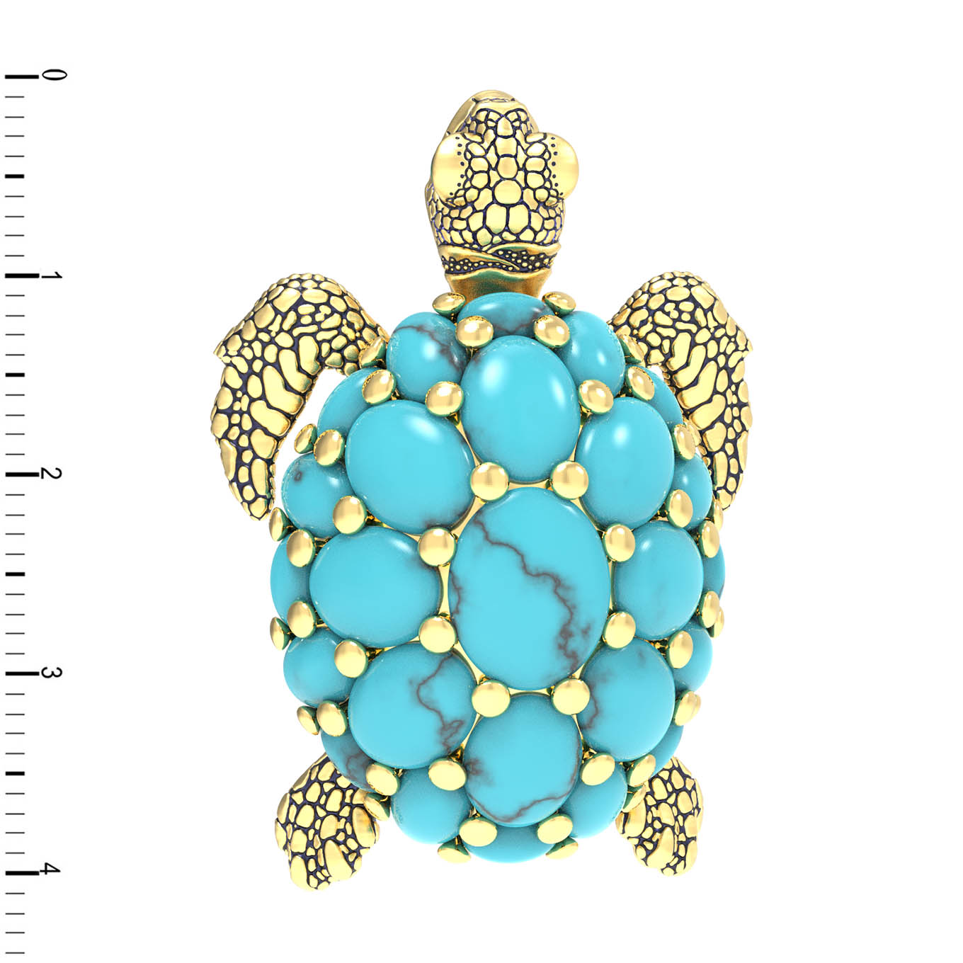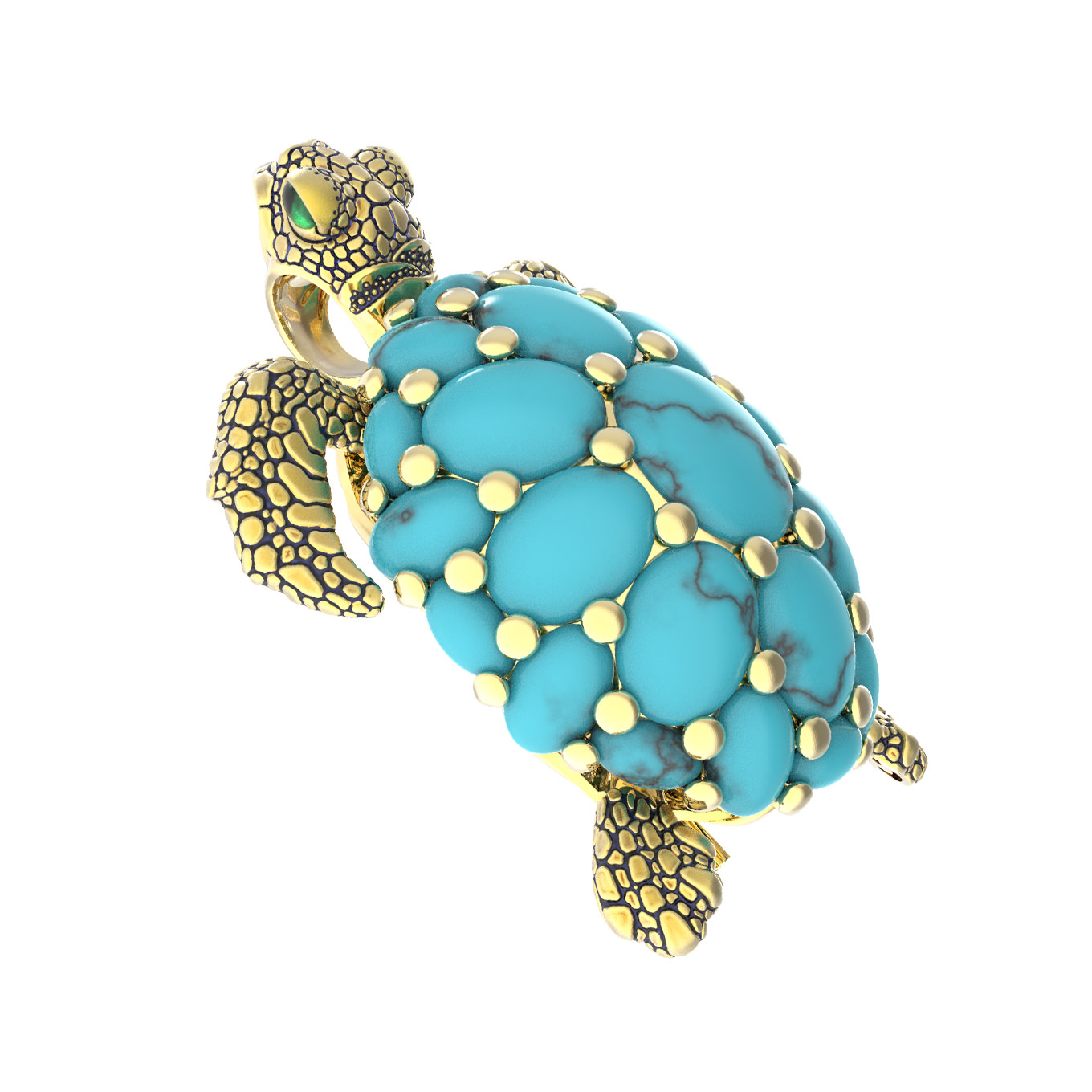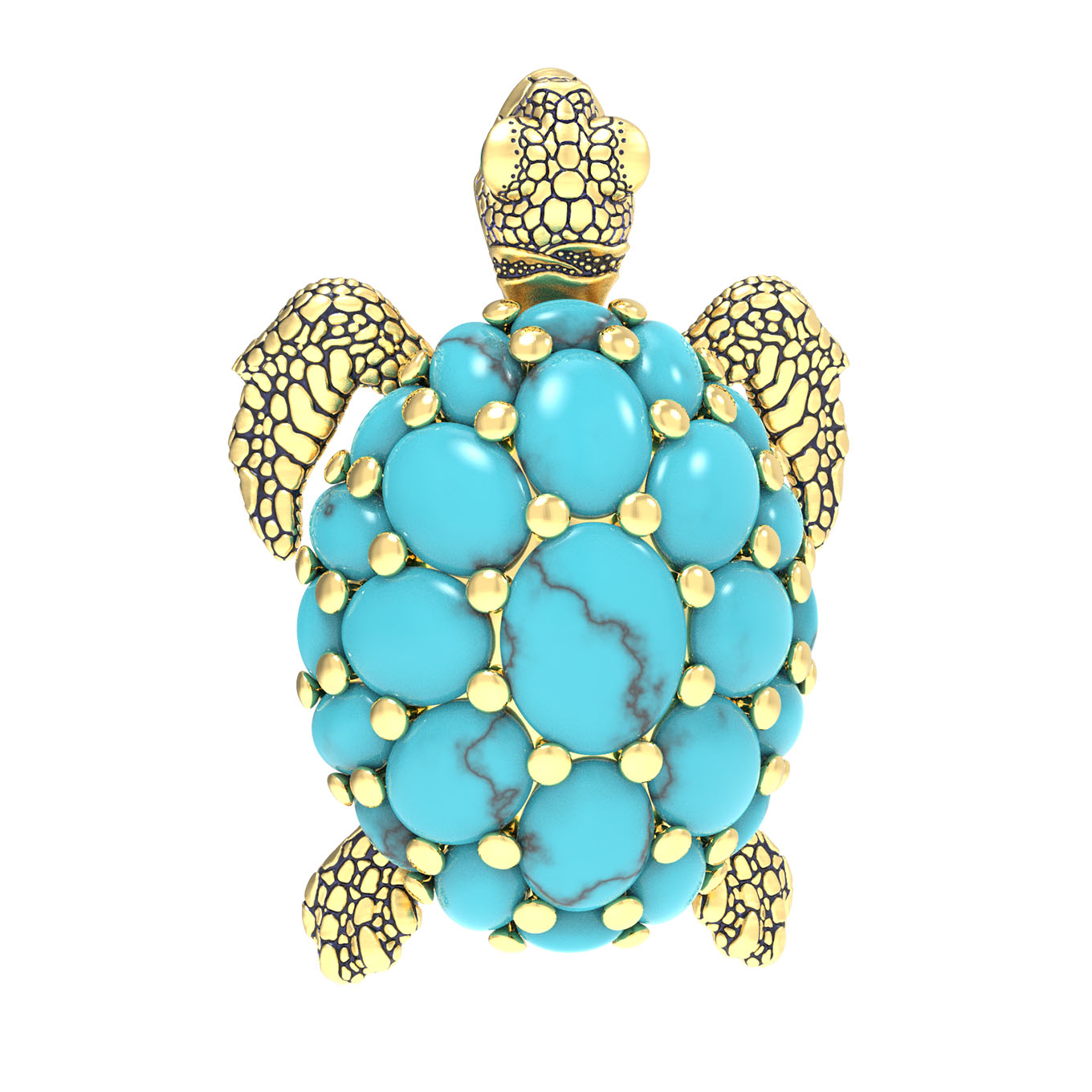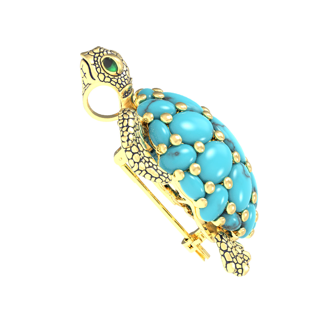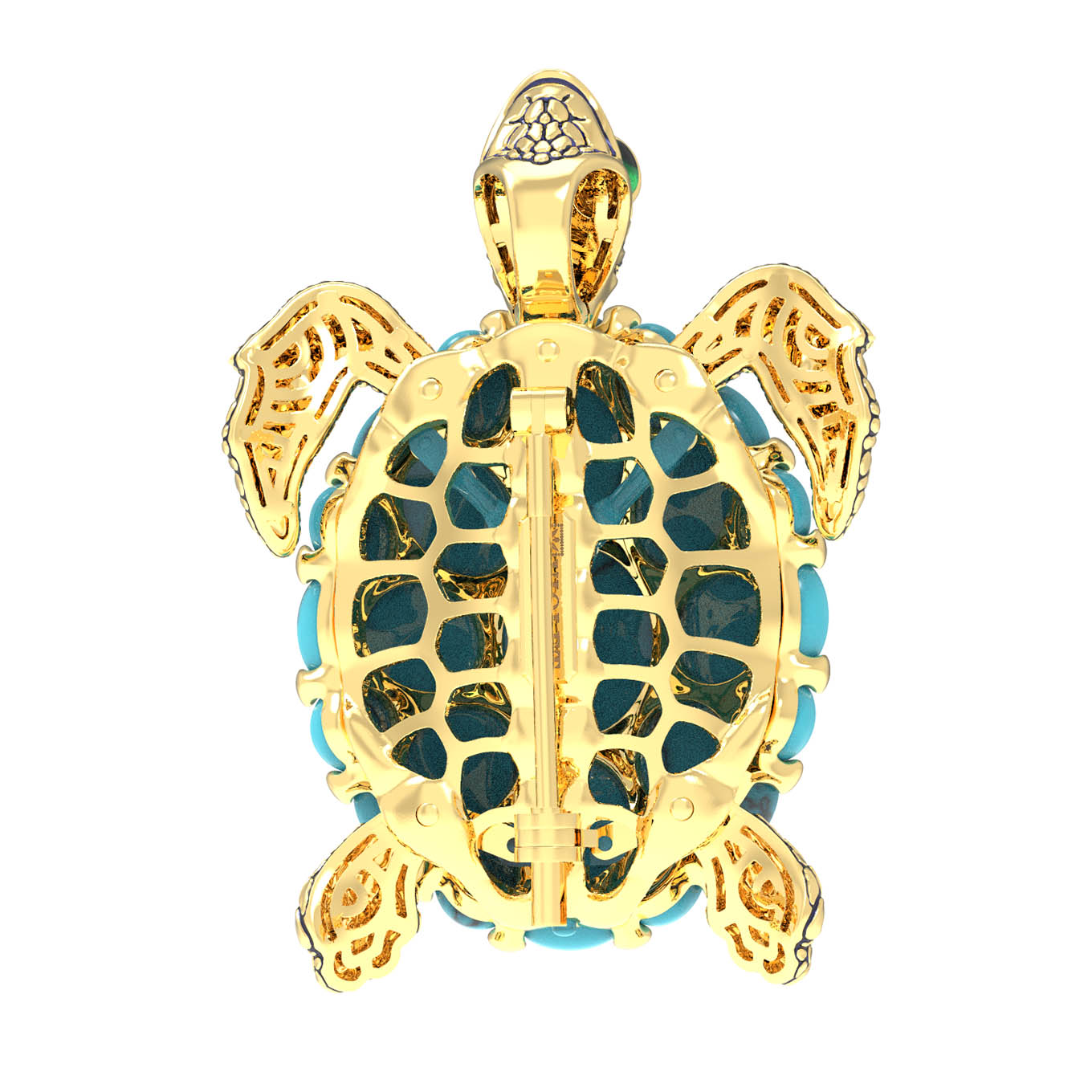 Главной особенностью изделия является великолепное сочетание благородного лимонного золота с насыщенным синим цветом бирюзы. Панцирь черепахи инкрустирован 25 вставками овальной формы, которые создают неповторимый визуальный эффект. Тщательная проработка деталей дополняется акцентами из разноцветной эмали, придающей броши дополнительную выразительность и глубину.