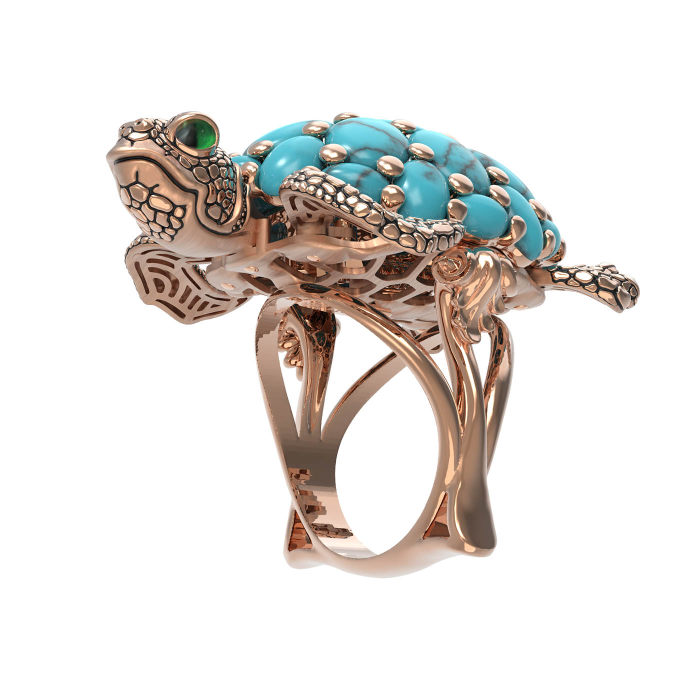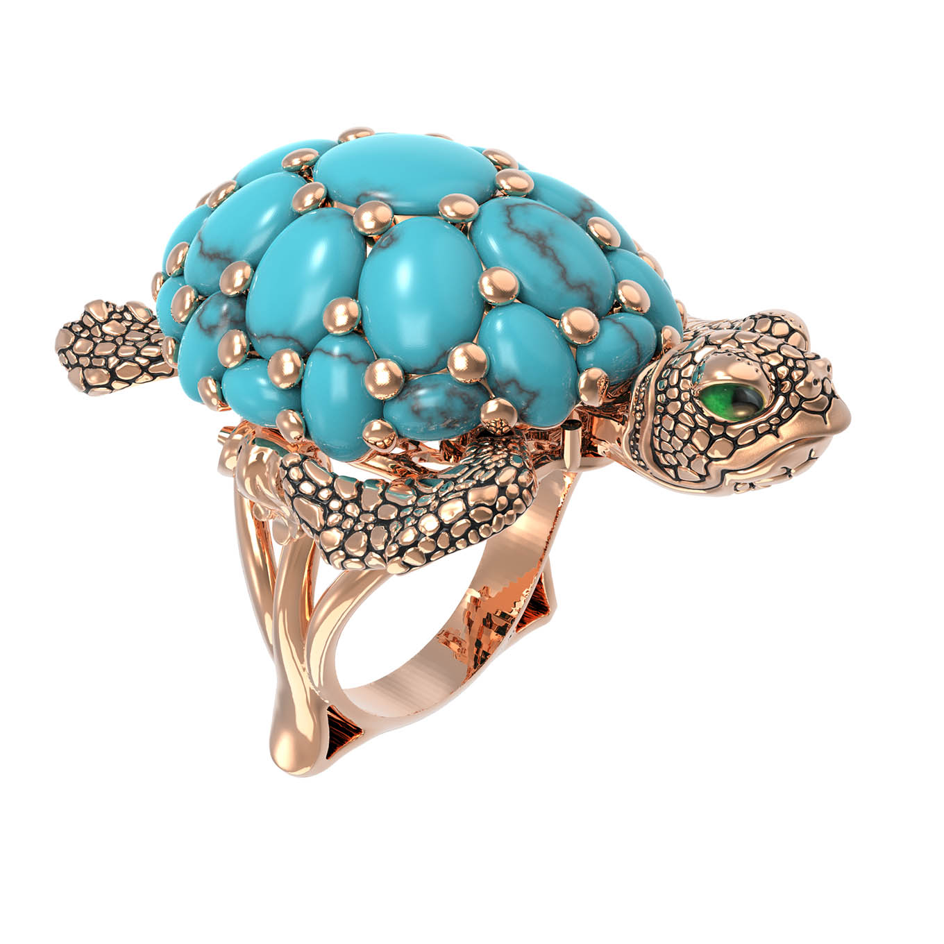 Кольцо из красного золота 585 пробы из коллекции De luxe Premium — Черепахи станет ярким акцентом в вашем ювелирном гардеробе. Украшение выполнено в оригинальном дизайне в форме черепахи, сочетающем в себе благородный металл и мастерскую работу с цветом. Панцирь черепахи инкрустирован 25 вставками из бирюзы синего цвета овальной формы, которые создают завораживающий объемный эффект. Выразительность образу придают детали, декорированные эмалью, дополняющие общую эстетику изделия.