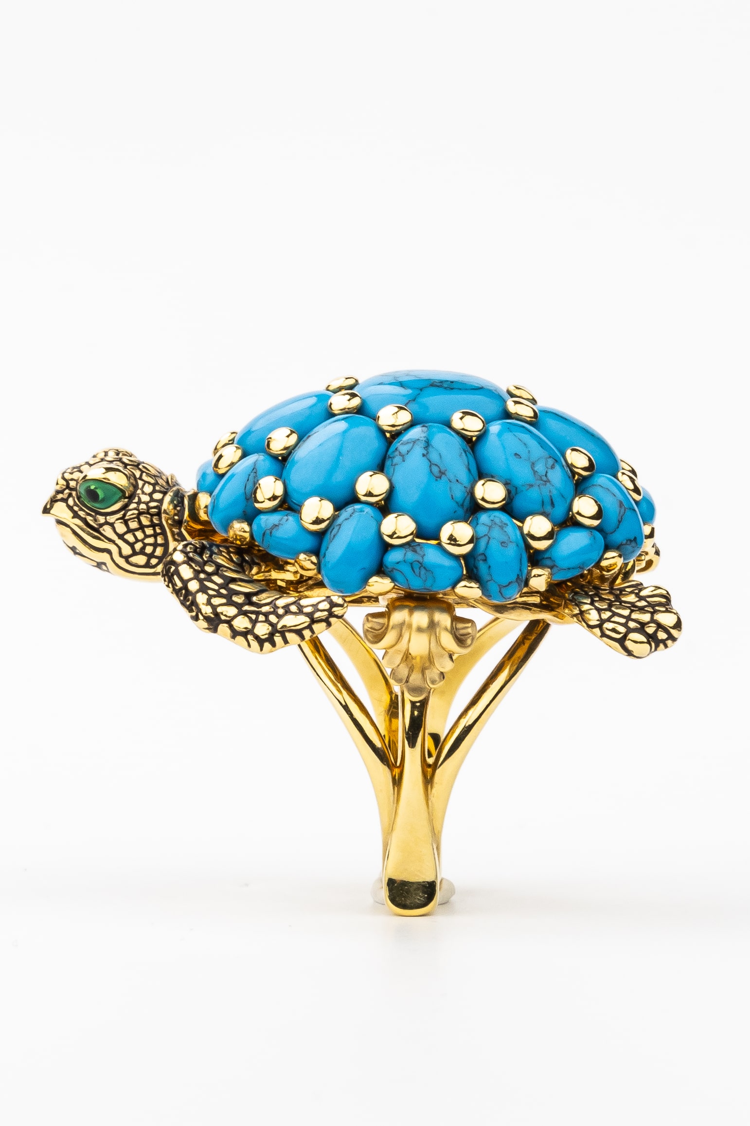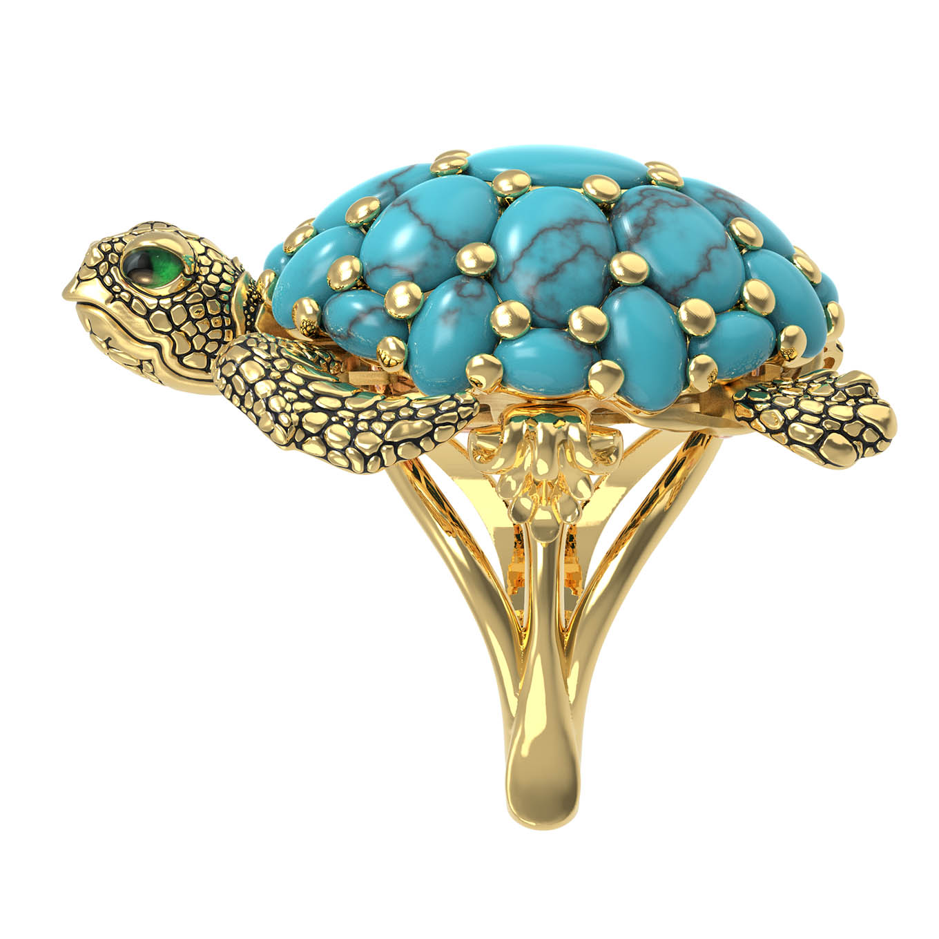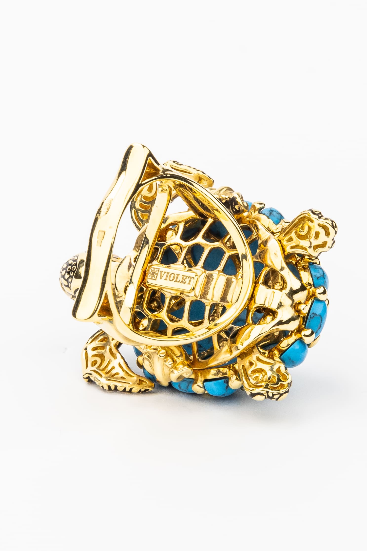 Кольцо из лимонного золота 585 пробы из коллекции De luxe Premium — Черепахи — это ювелирное воплощение искусства, сочетающее в себе изысканный дизайн и глубокий символизм. Центральным элементом украшения выступает фигура черепахи, выполненная с невероятной детализацией. Панцирь черепахи декорирован 25 вставками из натуральной бирюзы овальной формы. Яркий синий цвет камней гармонично контрастирует с благородным лимонным оттенком золота и декоративными элементами из цветной эмали.