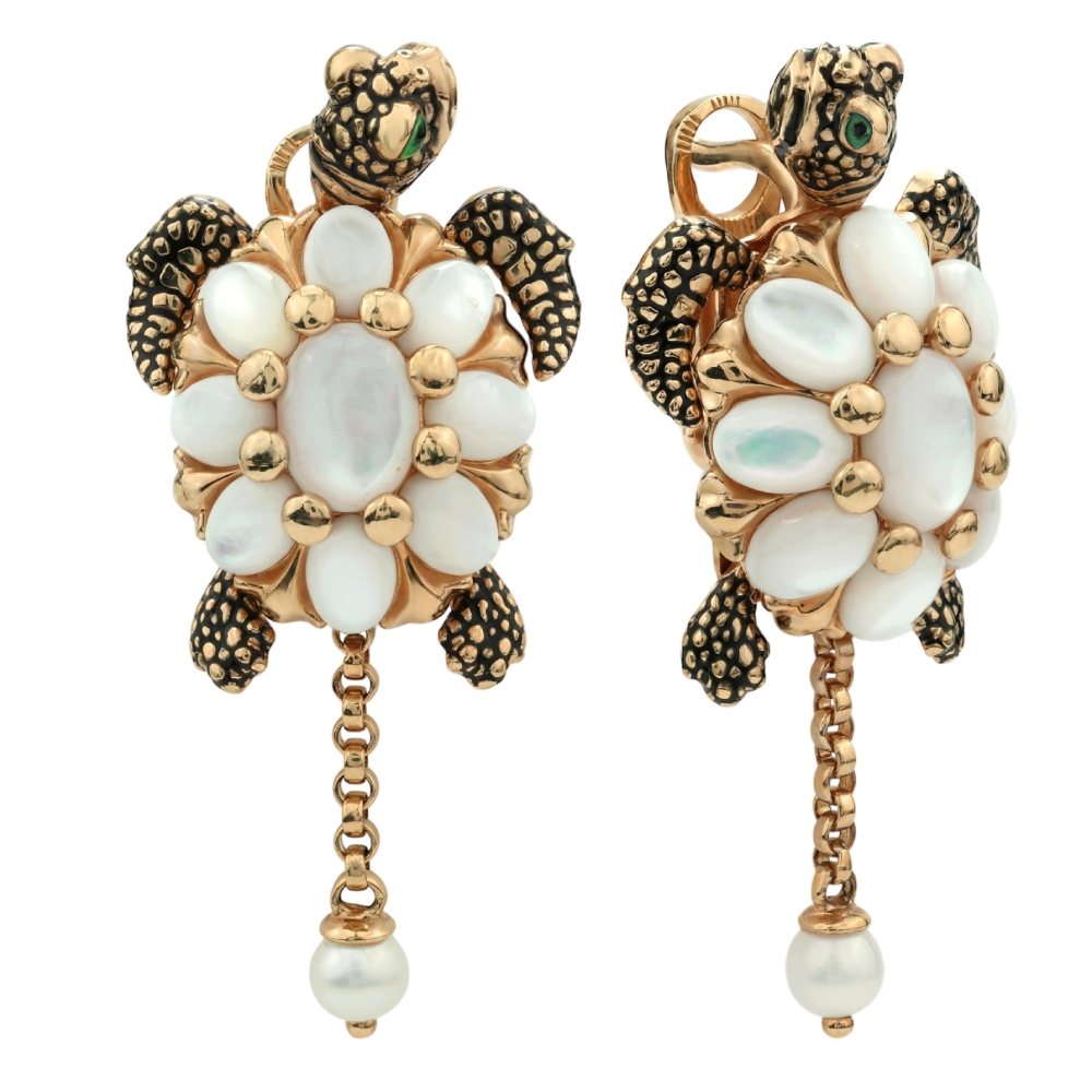 Эти роскошные серьги из коллекции De luxe Premium — Черепахи станут ярким акцентом вашего образа, демонстрируя утонченный вкус и внимание к деталям. Дизайн изделия выполнен в виде грациозных черепах, где основной корпус панциря украшен элегантными вставками из белого перламутра овальной и круглой формы. Контраст благородного красного золота 585 пробы и нежного сияния перламутра дополнен искусной эмалью, придающей деталям выразительность и глубину. Подвижный элемент в виде изящной цепочки, завершающейся жемчугом, добавляет изделию динамики и легкости.