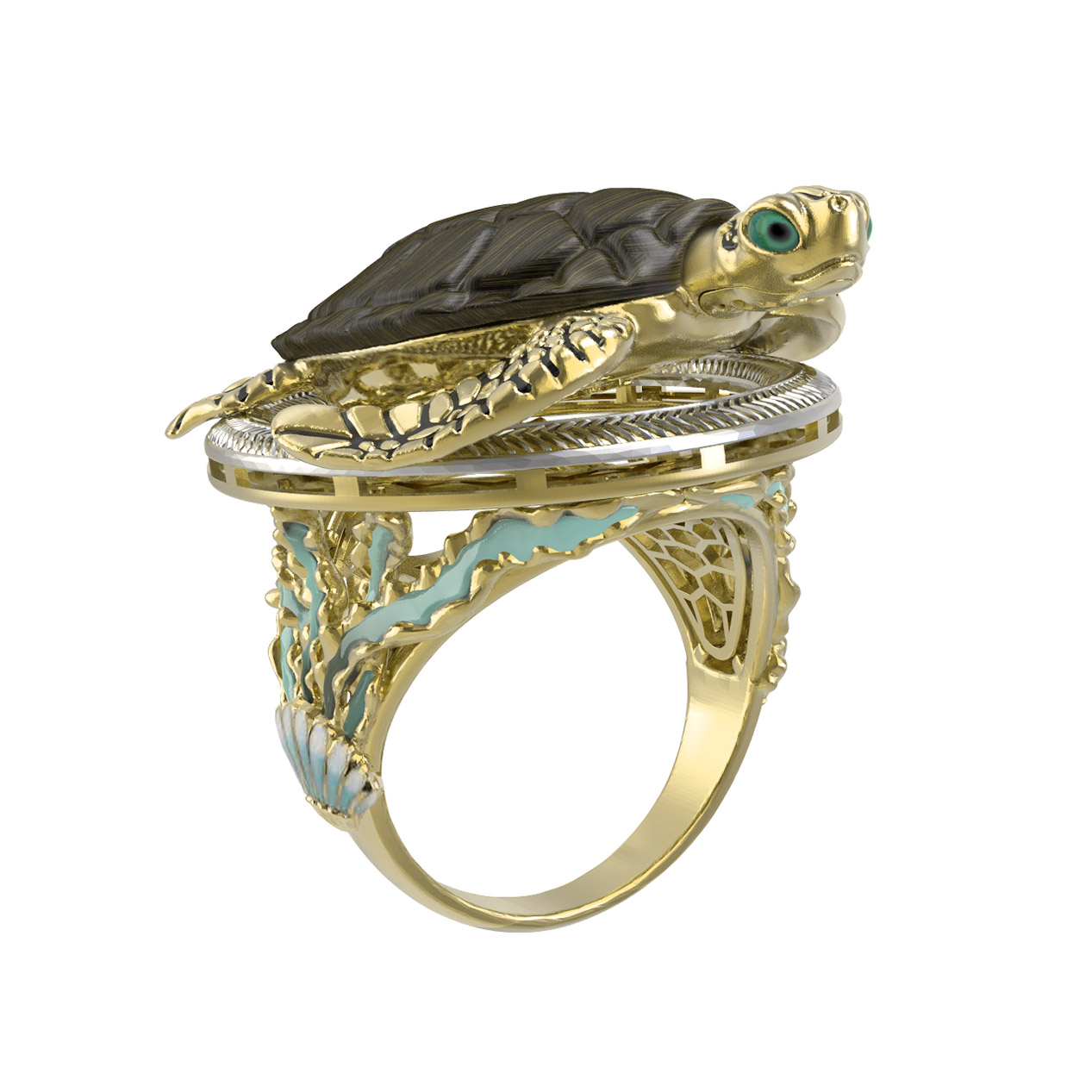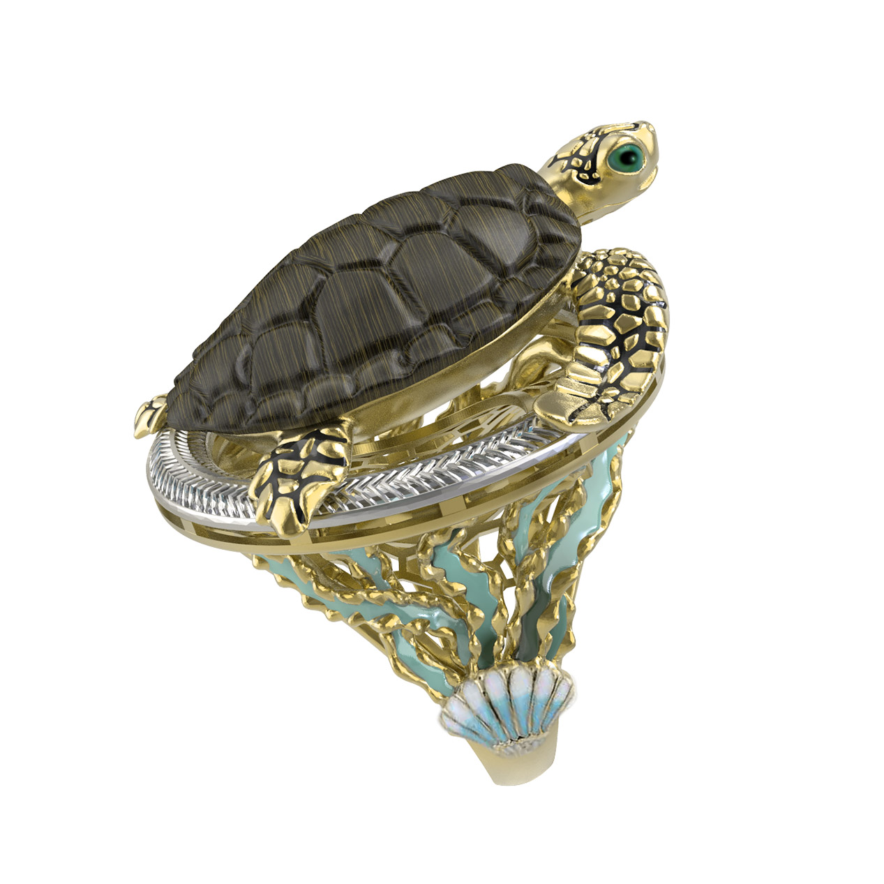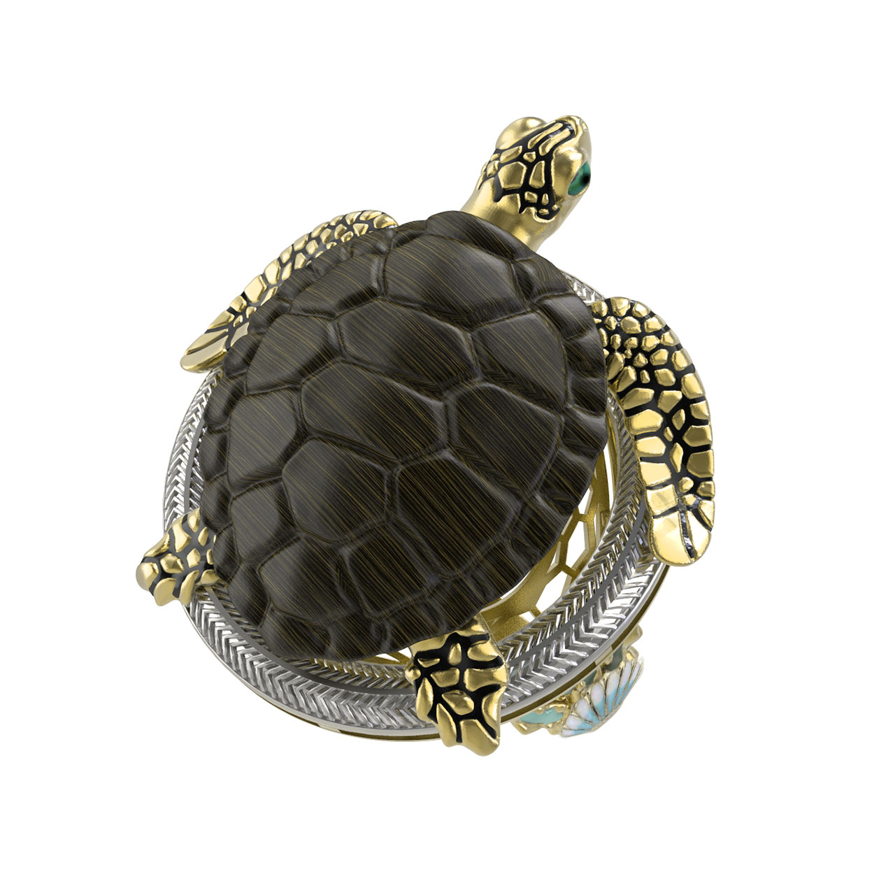 Мастера ювелиры объединили благородный металл с редкими материалами: панцирь черепахи выполнен из натурального железного дерева коричневого цвета, создавая эффектный контраст с сияющим золотом. Детали проработаны с особой тщательностью: вставки из разноцветной эмали добавляют глубины и выразительности, подчеркивая проработку каждой чешуйки и линии.