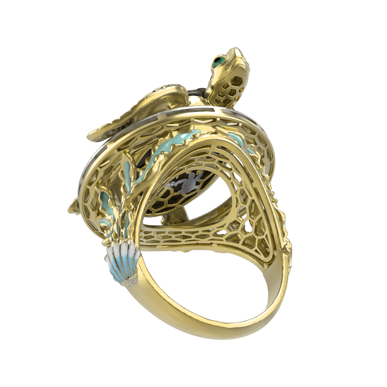 Откройте для себя совершенство ювелирного искусства в этом уникальном кольце из лимонного золота 585 пробы, вдохновленном природной грацией. Изделие входит в эксклюзивную серию De luxe Premium — Черепахи и станет ярким акцентом в вашем образе. Дизайн украшения выполнен в форме морской черепахи, что придает аксессуару глубокий символизм долголетия и мудрости.