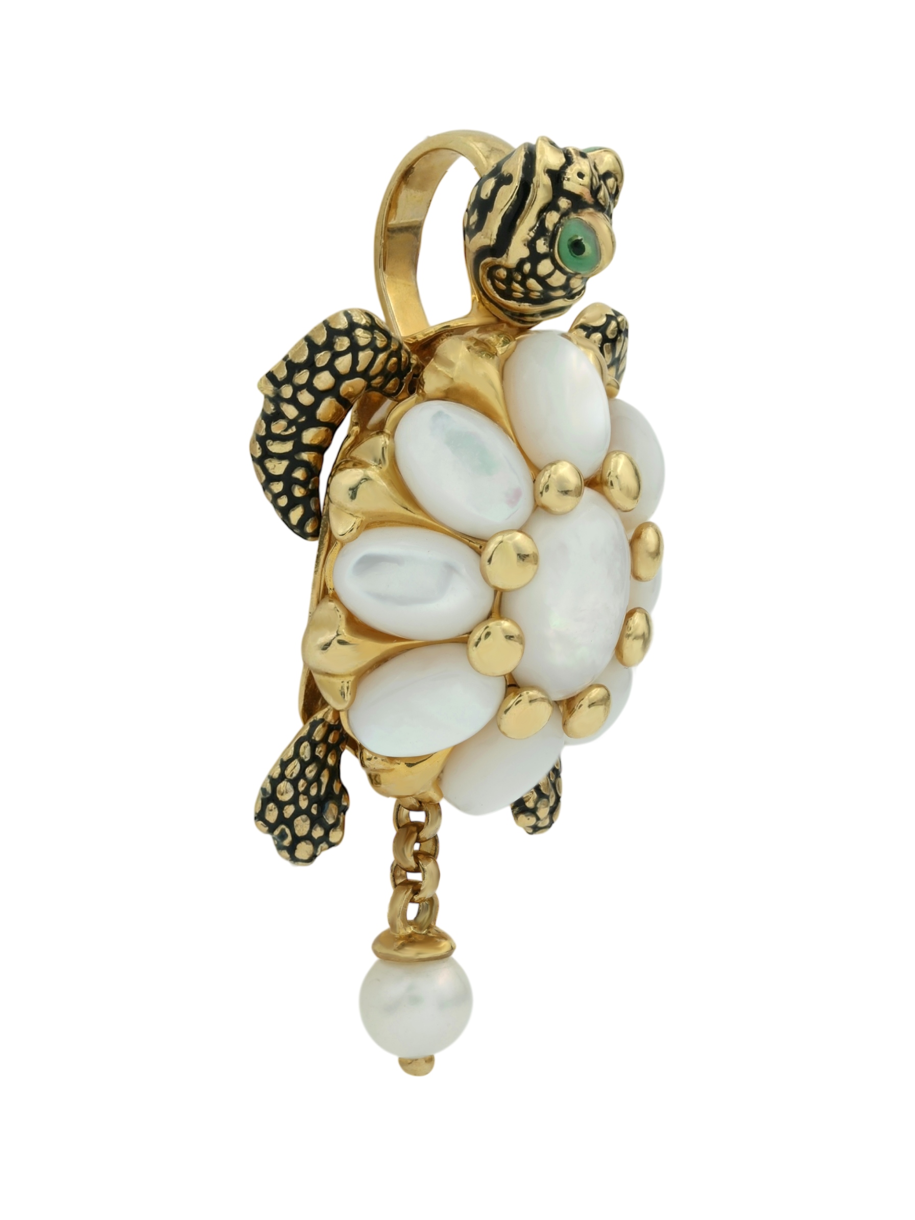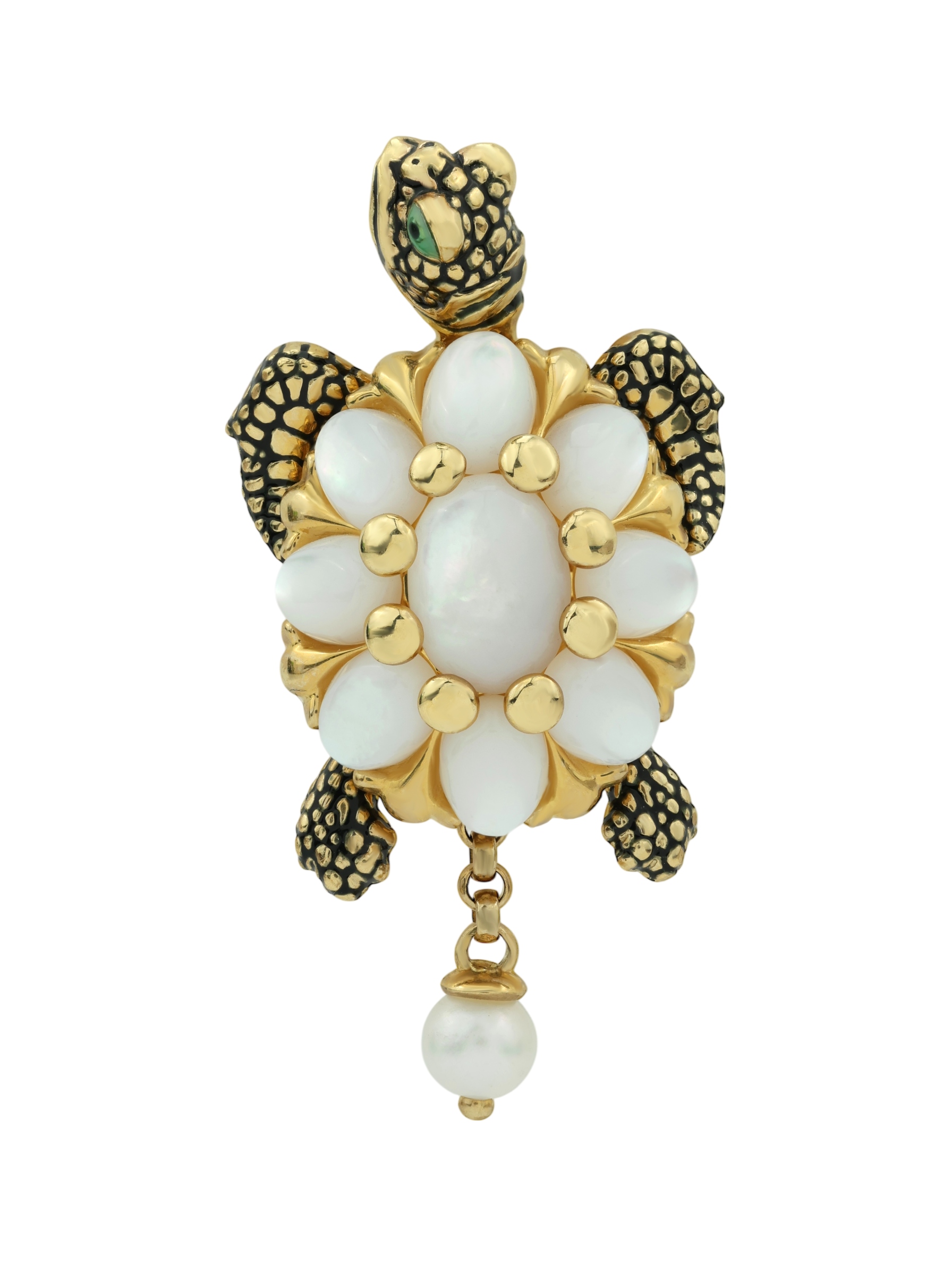 Особенность дизайна заключается в подвижном элементе — изящной подвеске с жемчугом, которая добавляет украшению динамики и легкости. Благодаря универсальному стилю это изделие станет прекрасным выбором как для женщин, так и для мужчин, предпочитающих подчеркнуть свою индивидуальность через нестандартные аксессуары. Подвеска Черепахи гармонично дополнит образ и может стать частью стильного комплекта. Качественные материалы — лимонное золото 585 пробы, натуральный жемчуг, перламутр и ювелирная эмаль — гарантируют долговечность и безупречный внешний вид изделия. Создайте свой уникальный образ, добавив в него нотку природной эстетики и утонченного ювелирного искусства.