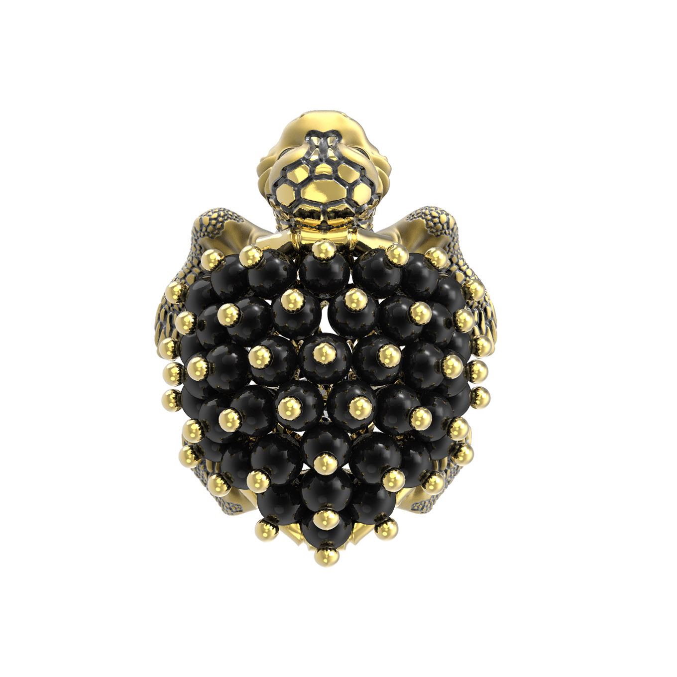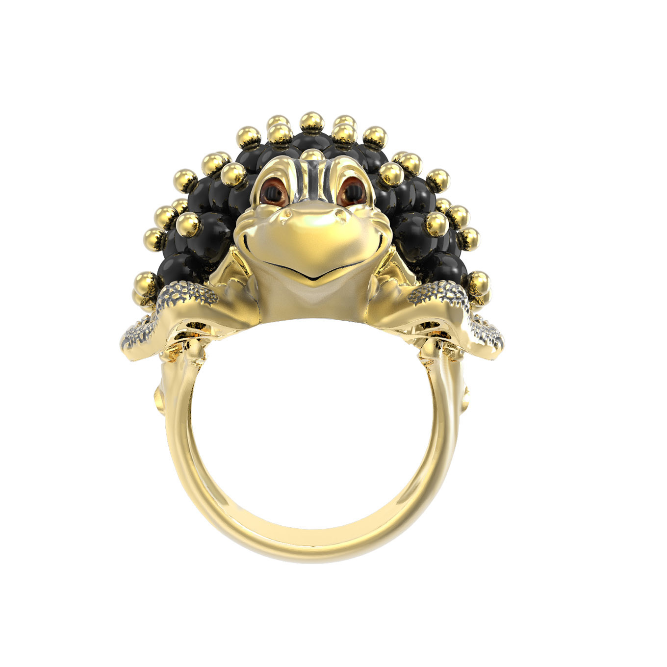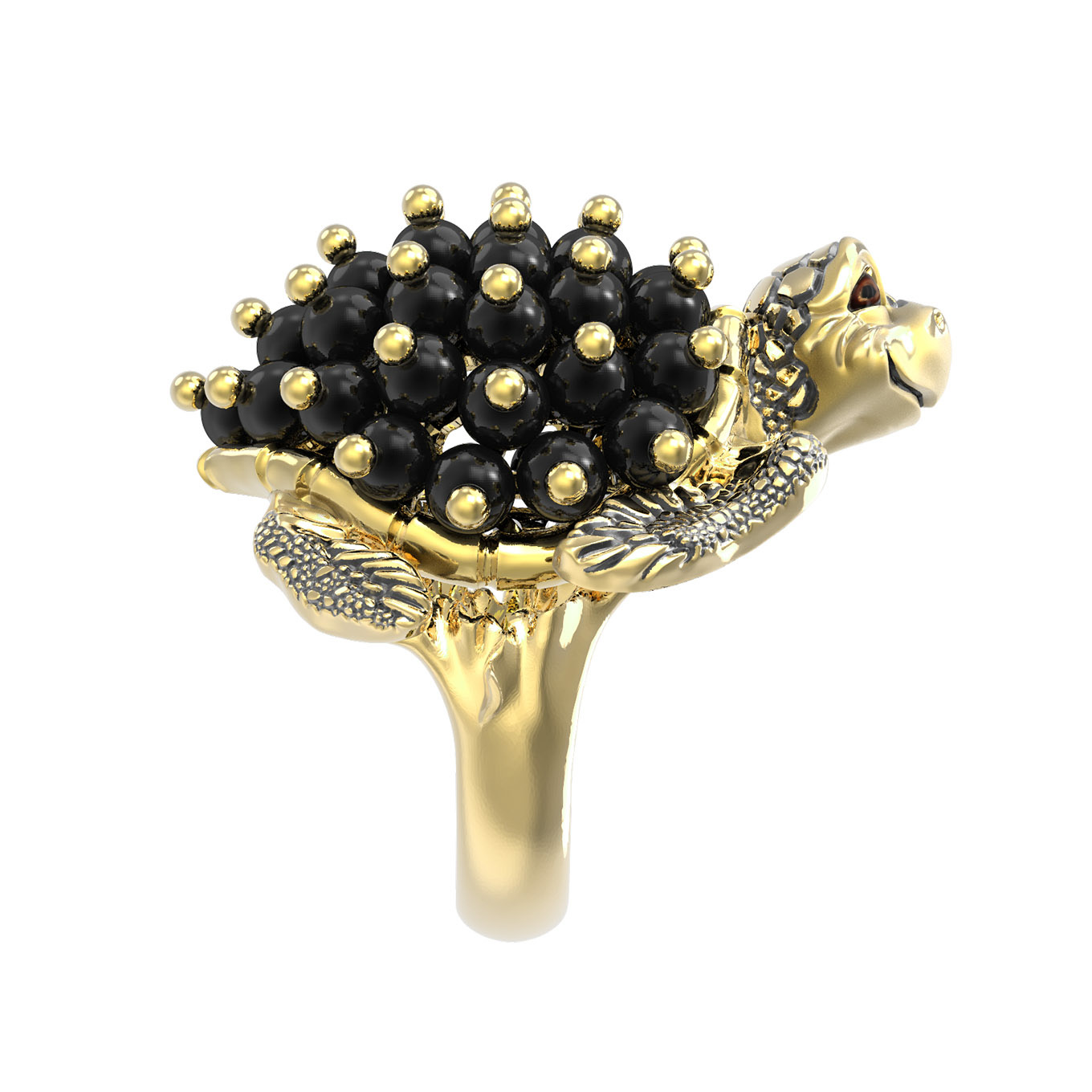 Центральным элементом композиции является панцирь черепахи, инкрустированный 61 вставкой в форме бусин. Сочетание черного оникса и разноцветной эмали создает выразительный контраст, подчеркивая благородный блеск лимонного золота. Такое сочетание материалов придает украшению динамику и глубину. Каждое кольцо продумано до мелочей: от текстуры кожи рептилии до выразительного взгляда, что делает его настоящим произведением ювелирного искусства.
