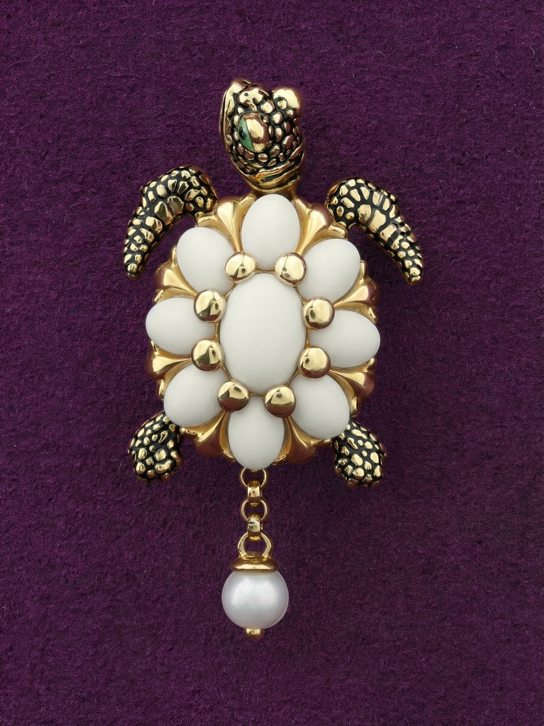 Центральная часть изделия украшена изысканными вставками из бивня мамонта. Овальные и круглые элементы создают эффектный контраст с золотой оправой, придавая украшению особый шарм. Завершающим штрихом служит изящная деталь в виде жемчуга круглой формы, которая привносит нотки классической элегантности и мягкого сияния. Белые и разноцветные вставки гармонично сочетаются, делая подвеску по-настоящему уникальной.