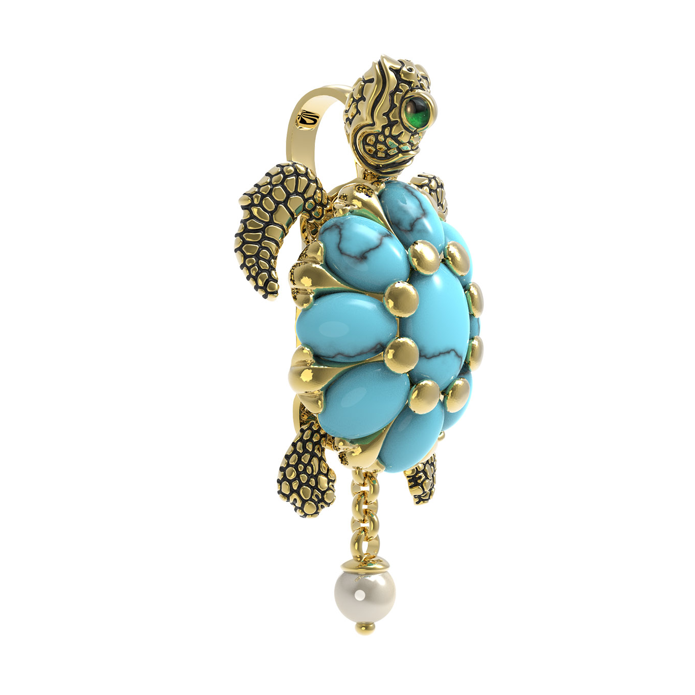 В центре композиции расположены 10 вставок из бирюзы синего цвета. Овальные и круглые камни гармонично сочетаются с изысканными элементами эмали, создавая эффектный разноцветный контраст. Дополняет дизайн нежная подвеска с белой жемчужиной, которая придает украшению особую изящность и завершенность.
