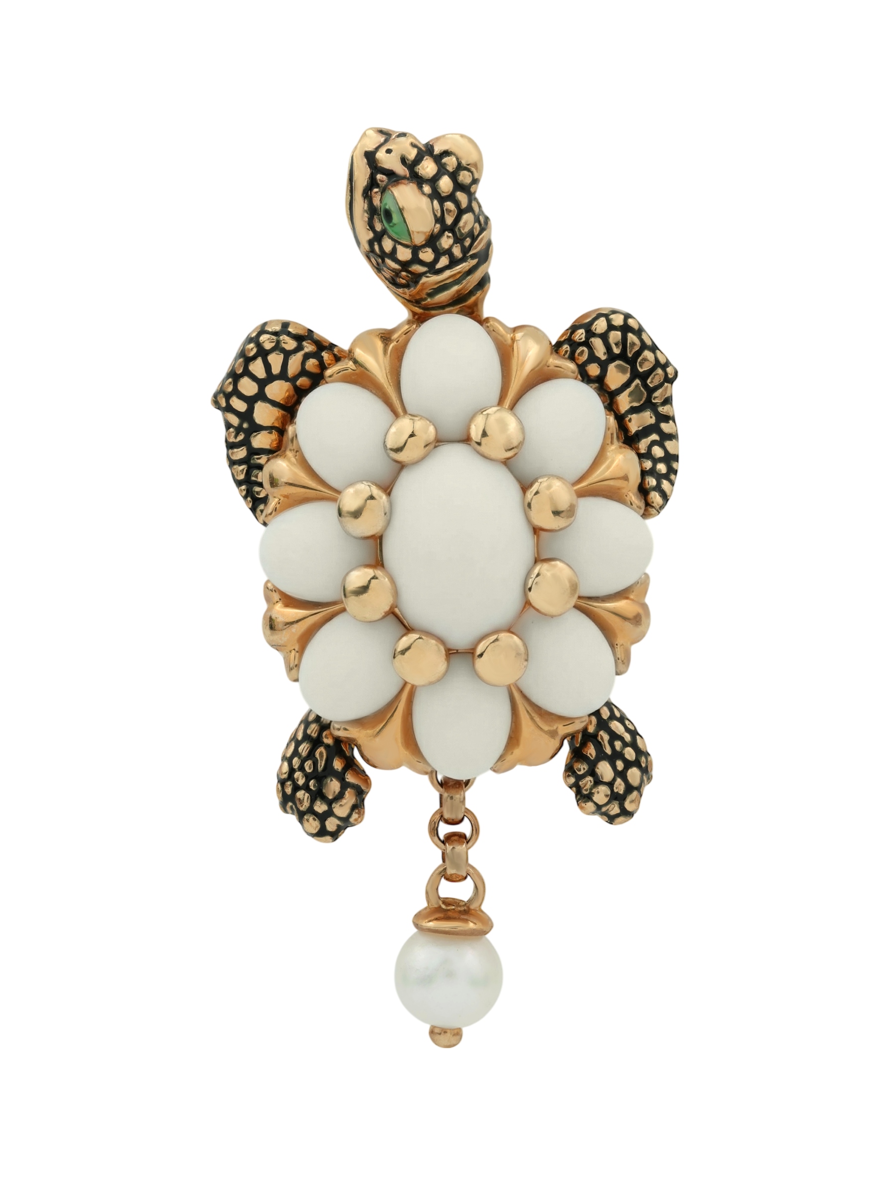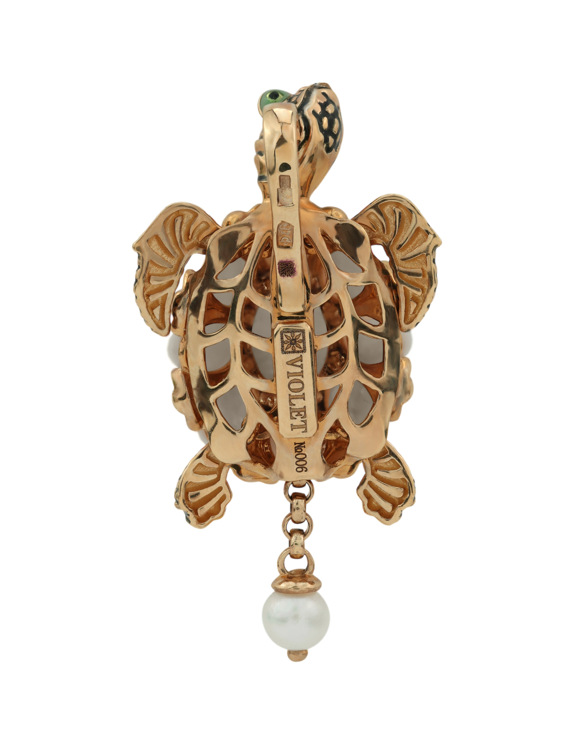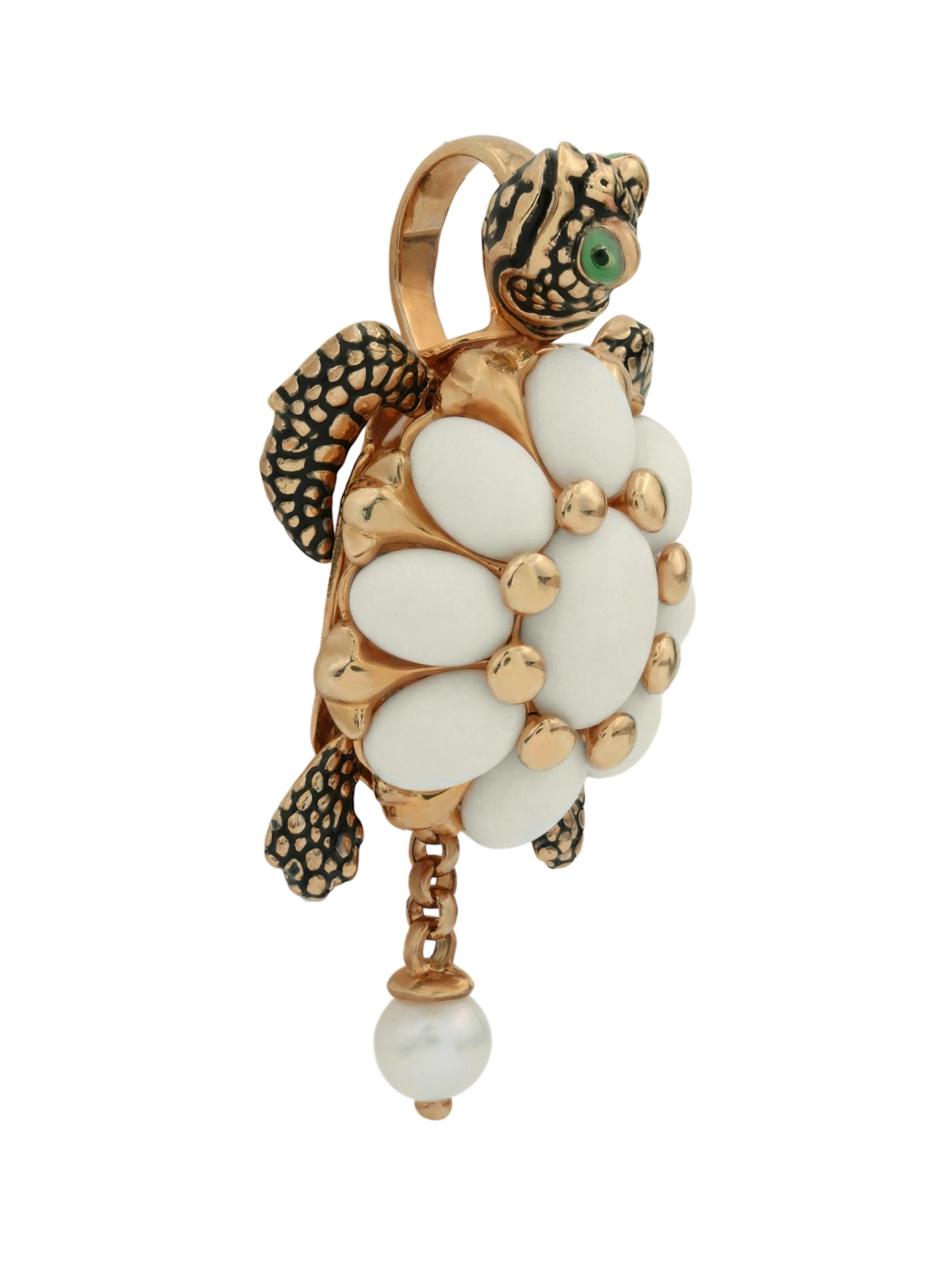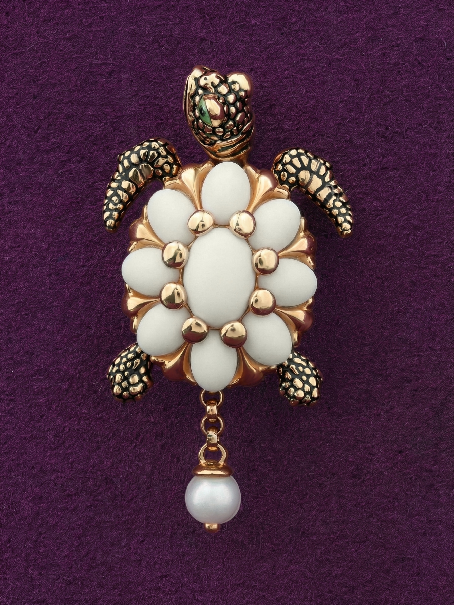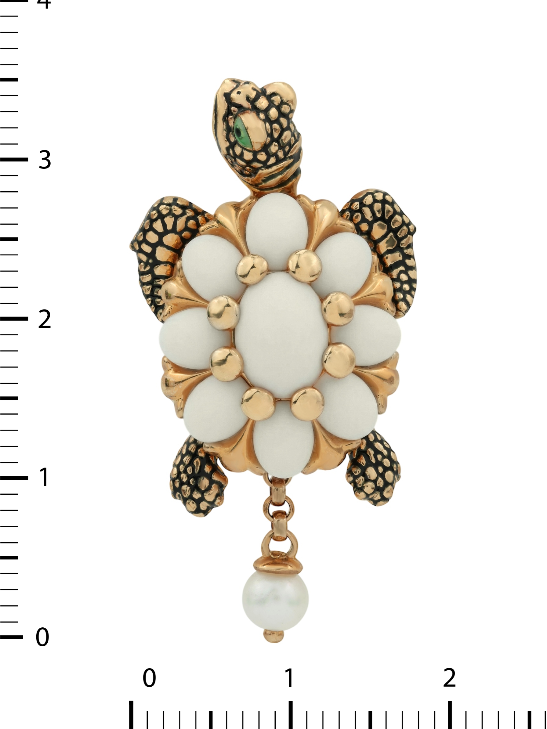 Особую выразительность украшению придает сочетание различных вставок. Панцирь черепахи инкрустирован элементом из бивня мамонта, имеющим овальную и круглую форму, что создает уникальную фактуру и благородный белый цвет вставок. Детали дополнены изящной эмалью разноцветных оттенков, подчеркивающей мастерство исполнения каждой линии. В нижней части подвески, словно капля росы, закреплена жемчужина, добавляющая изделию классического шарма.