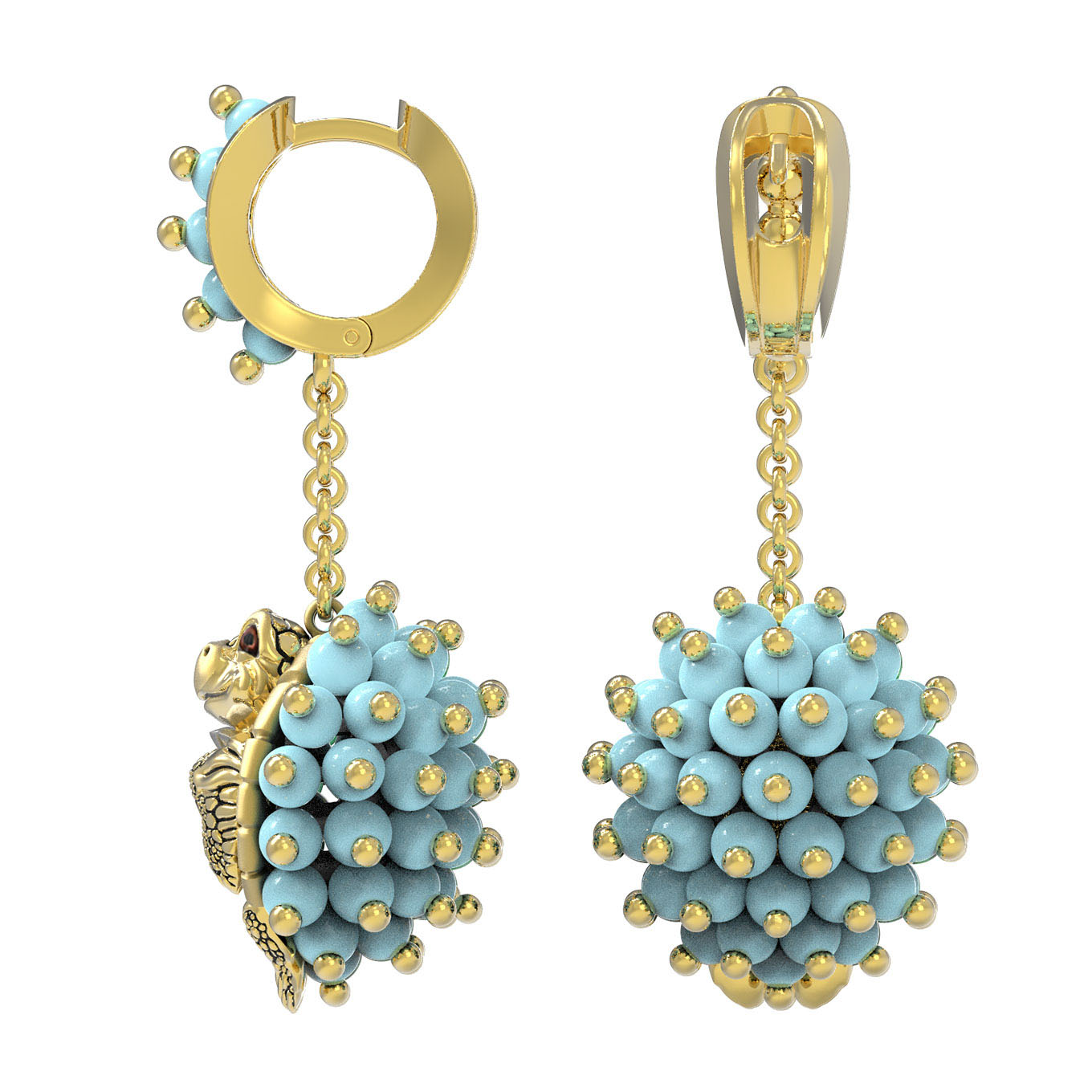 Композиция украшена 124 вставками: это сочетание нежной бирюзы и яркой эмали. Форма вставок в виде бусин создает гармоничный объем, а синий цвет бирюзы и разноцветные акценты эмали делают изделие притягательным и заметным. Длинные подвесные элементы придают серьгам динамику, благодаря чему они красиво смотрятся в движении.