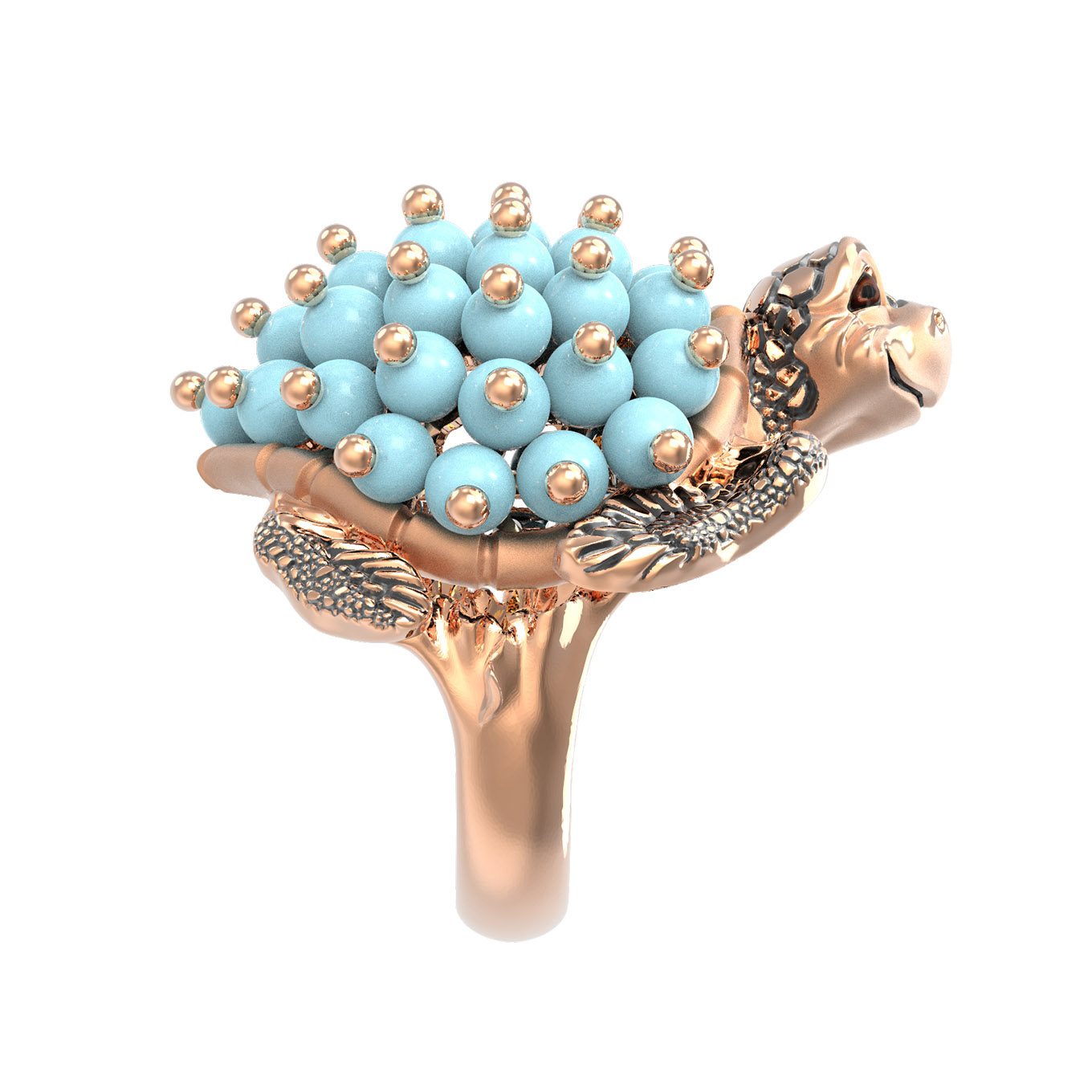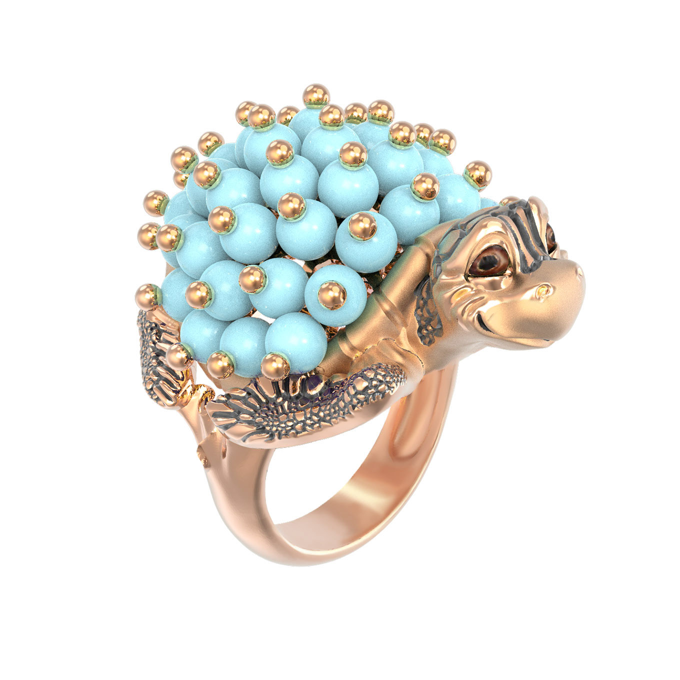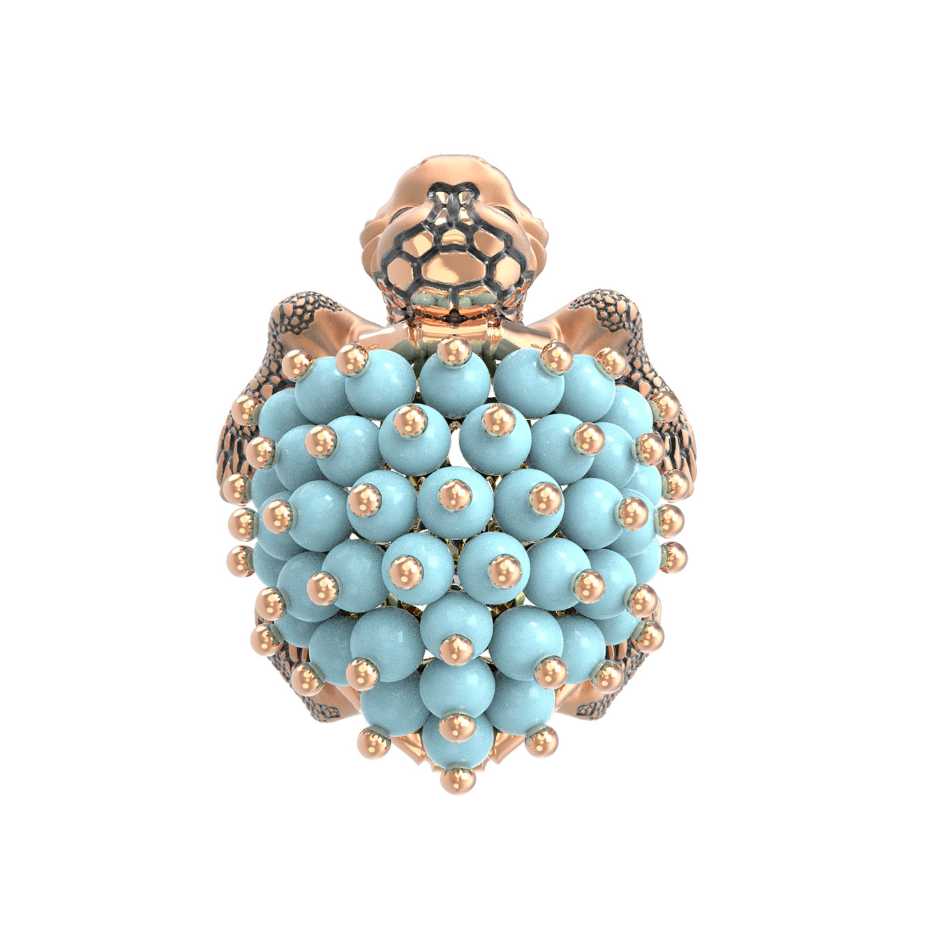 Центральным элементом украшения выступает роскошная инкрустация, состоящая из 61 вставки. Использованные бусины из бирюзы синего цвета создают эффектный контраст с благородным теплым оттенком красного золота. Яркий и выразительный декор дополнен элементами из эмали, которые подчеркивают индивидуальность и стиль изделия. Ювелиры уделили особое внимание фактуре, превратив драгоценный металл в маленькую скульптуру, где панцирь черепахи эффектно имитирует природный рельеф.