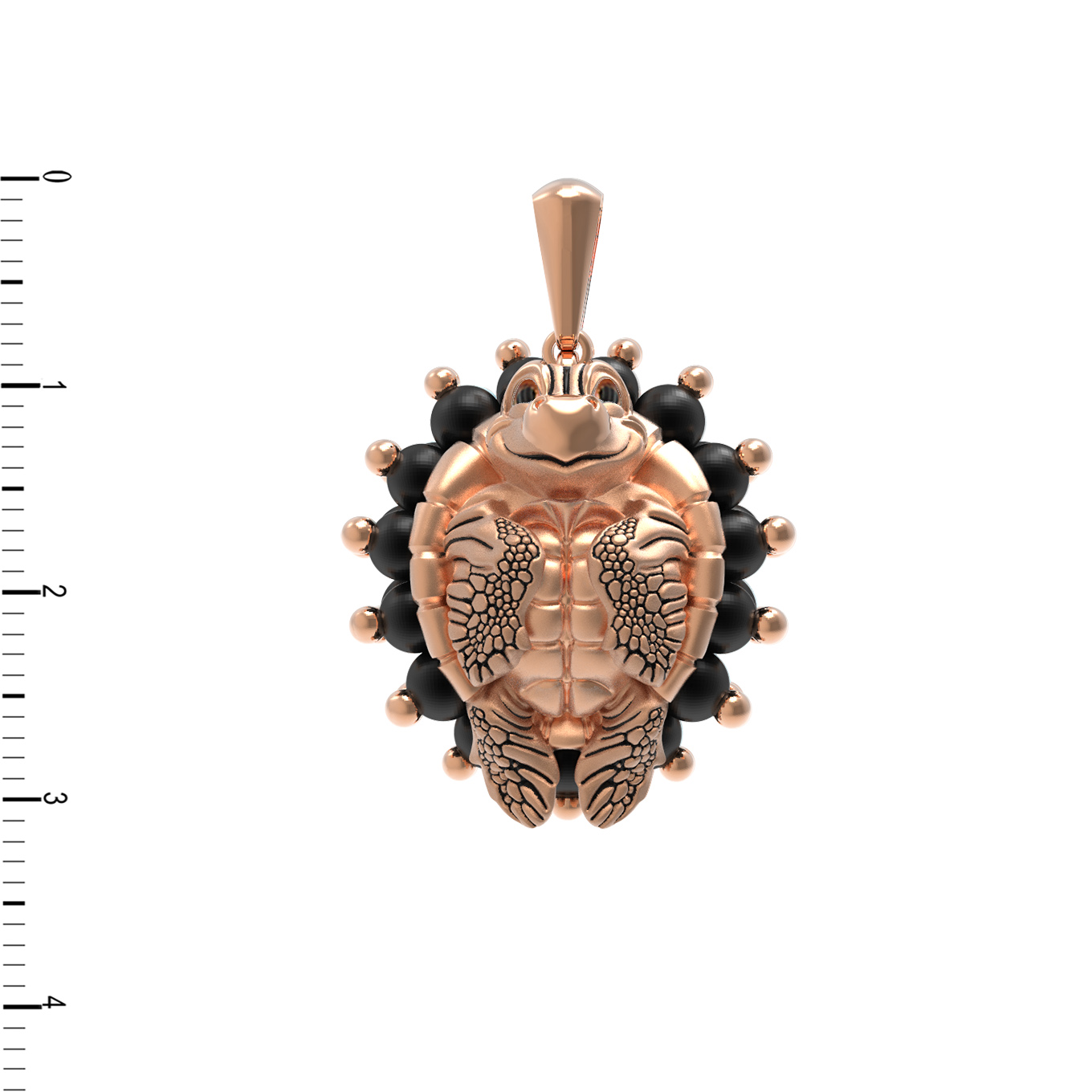 Эта оригинальная подвеска из красного золота 585 пробы станет ярким акцентом вашего образа. Дизайн изделия выполнен в виде черепахи, что придает украшению особый смысл и харизму. Мастерство исполнения подчеркивают 57 вставок, среди которых элегантные бусины из черного оникса создают выразительный контраст с теплым оттенком драгоценного металла. Разноцветная эмаль добавляет детализации и глубины, превращая ювелирное украшение в настоящий предмет искусства.