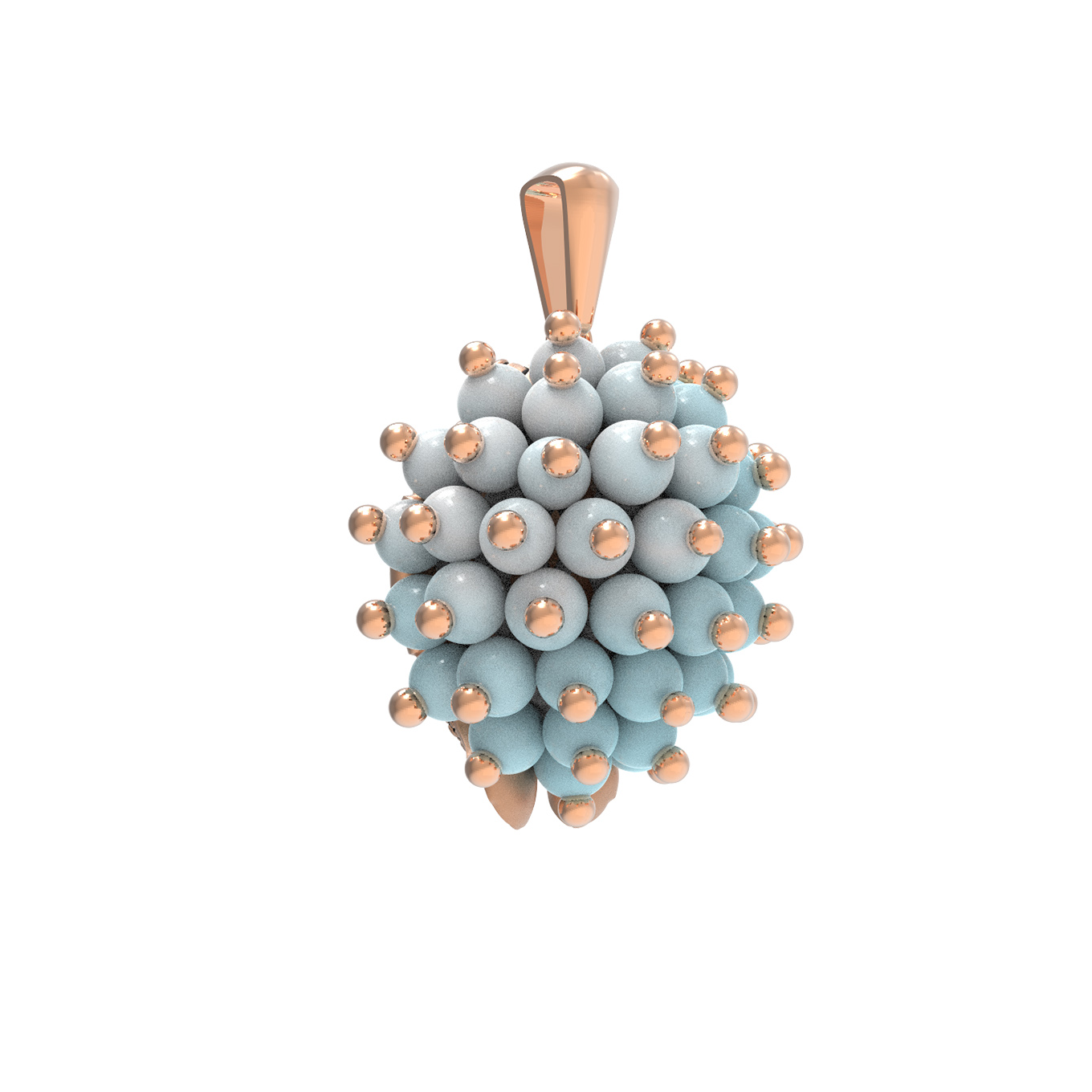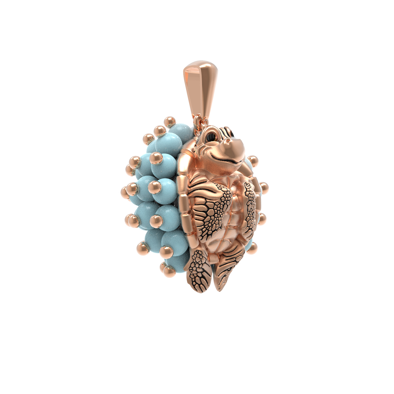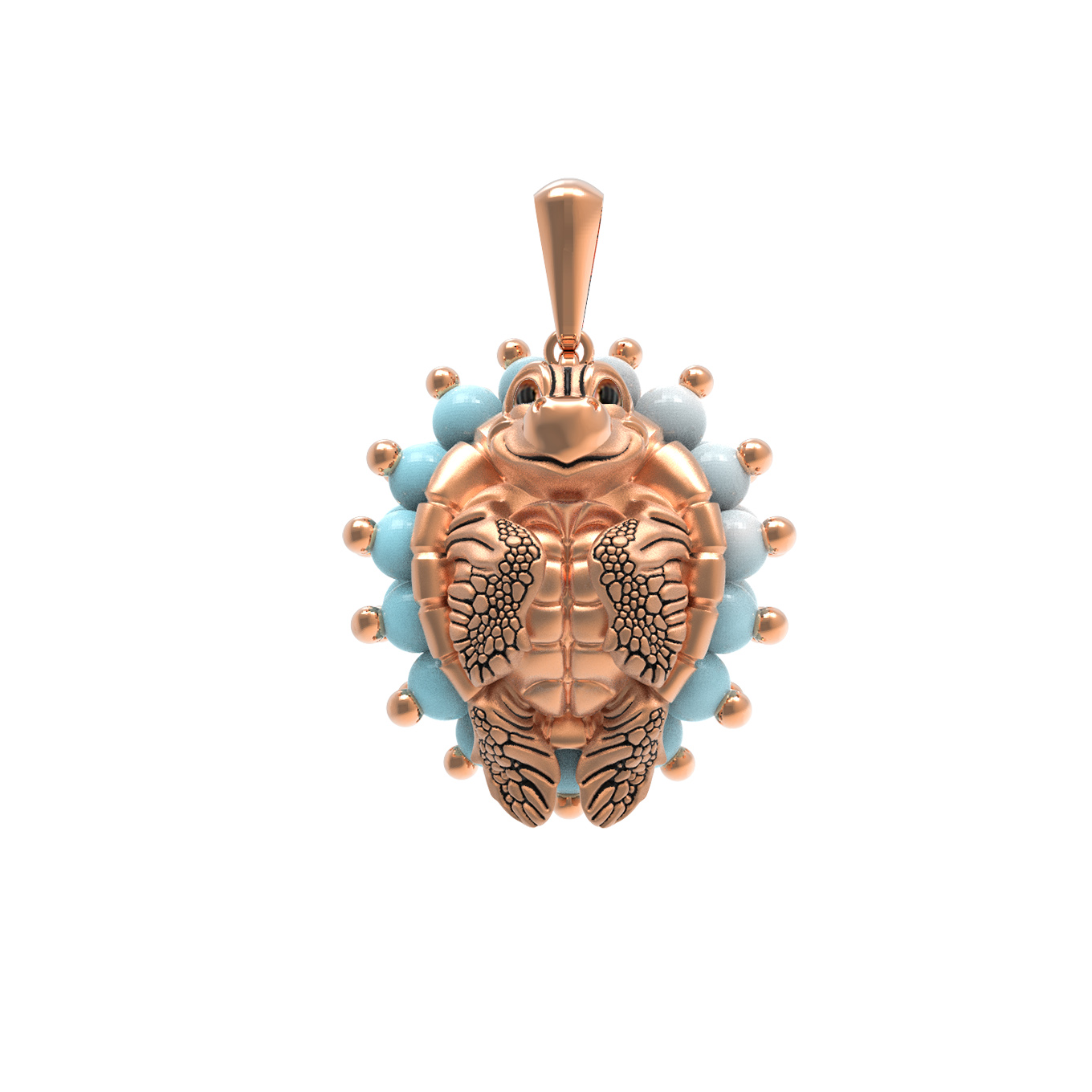 Центральным элементом композиции является искусное сочетание материалов. Основу составляет красное золото, которое великолепно гармонирует с декором из цветной эмали. Особую привлекательность изделию придает россыпь из 57 вставок — это нежные бусины из натуральной бирюзы, создающие красивый синий акцент по периметру черепахи. Разноцветная игра эмали и глубокий оттенок камней делают подвеску запоминающейся.