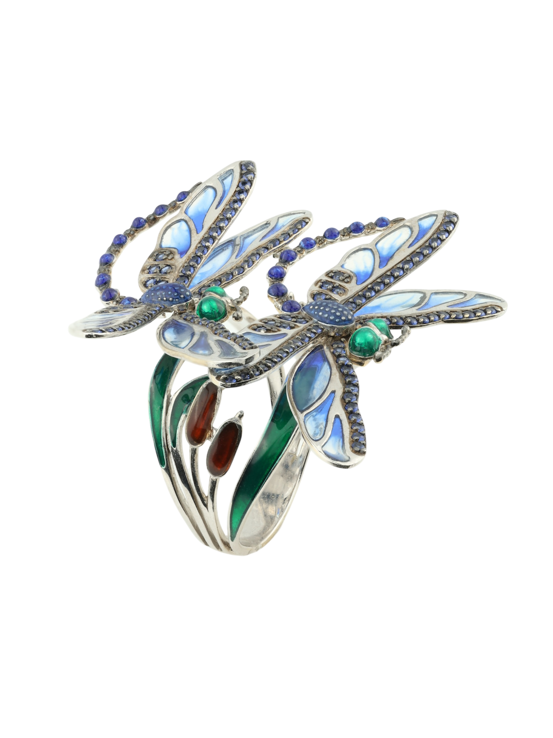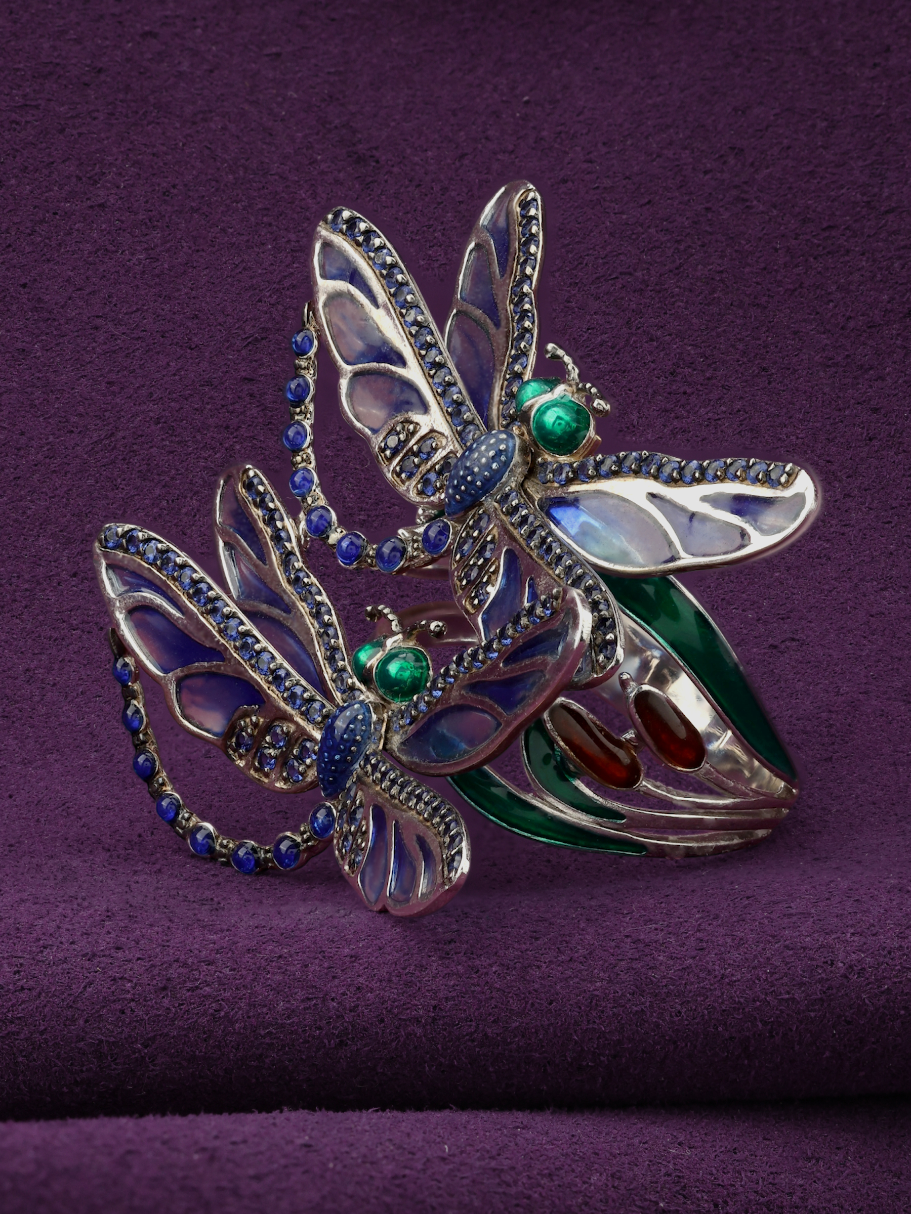 Роскошное кольцо из коллекции De luxe Premium — Стрекозы станет воплощением вашего безупречного вкуса и любви к оригинальным украшениям. Изделие выполнено из благородного белого золота 585 пробы, которое идеально подчеркивает холодный блеск драгоценных камней. Утонченный дизайн в виде насекомых привлекает внимание своей детализацией и художественным исполнением. Основным акцентом композиции выступает искусная ювелирная эмаль, переливающаяся глубокими оттенками, и 120 сверкающих сапфиров круглой формы.