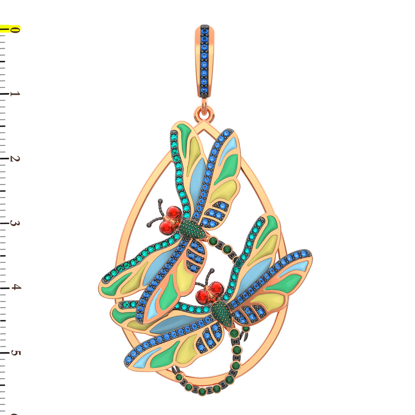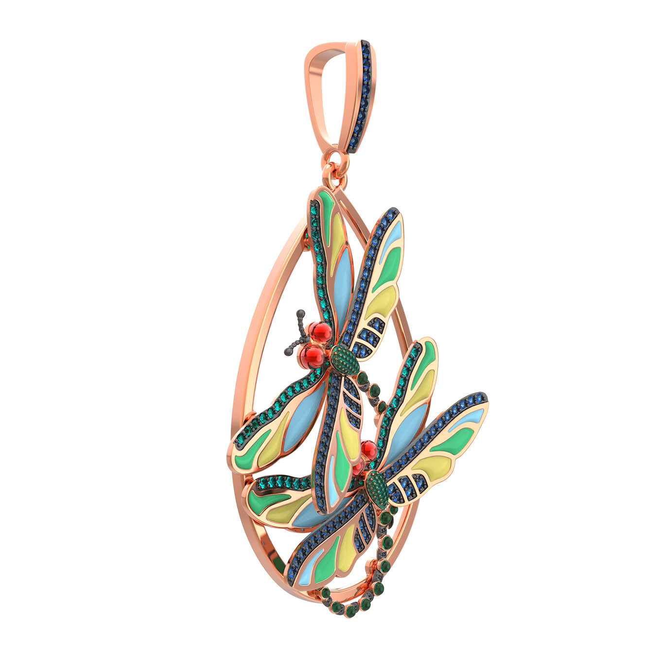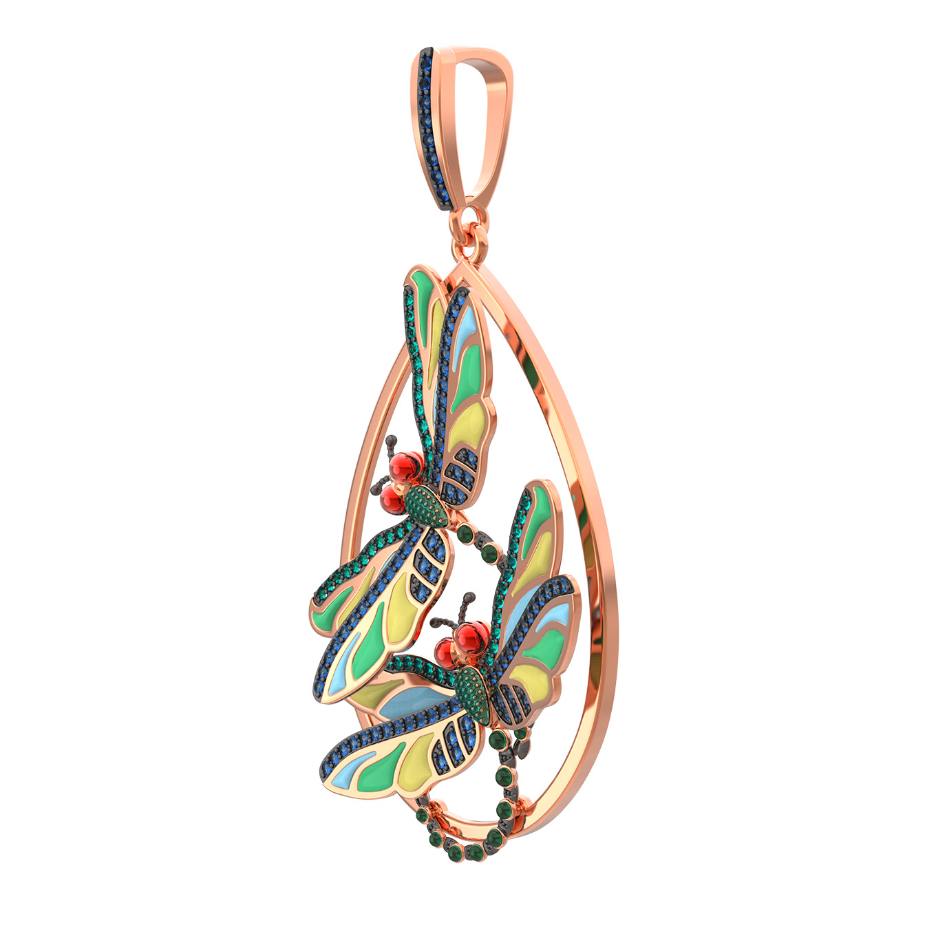 Изящная подвеска из красного золота 585 пробы станет центральным акцентом вашего образа. Дизайн украшения, выполненный в тематике насекомые, представляет собой филигранное изображение двух стрекоз внутри контурной капли. Это изделие входит в коллекцию De luxe Premium — Стрекозы, отличающуюся мастерской проработкой деталей и художественной выразительностью. Использование техники эмали придает поверхности крыльев глубину и живость, создавая эффект переливающегося оперения.