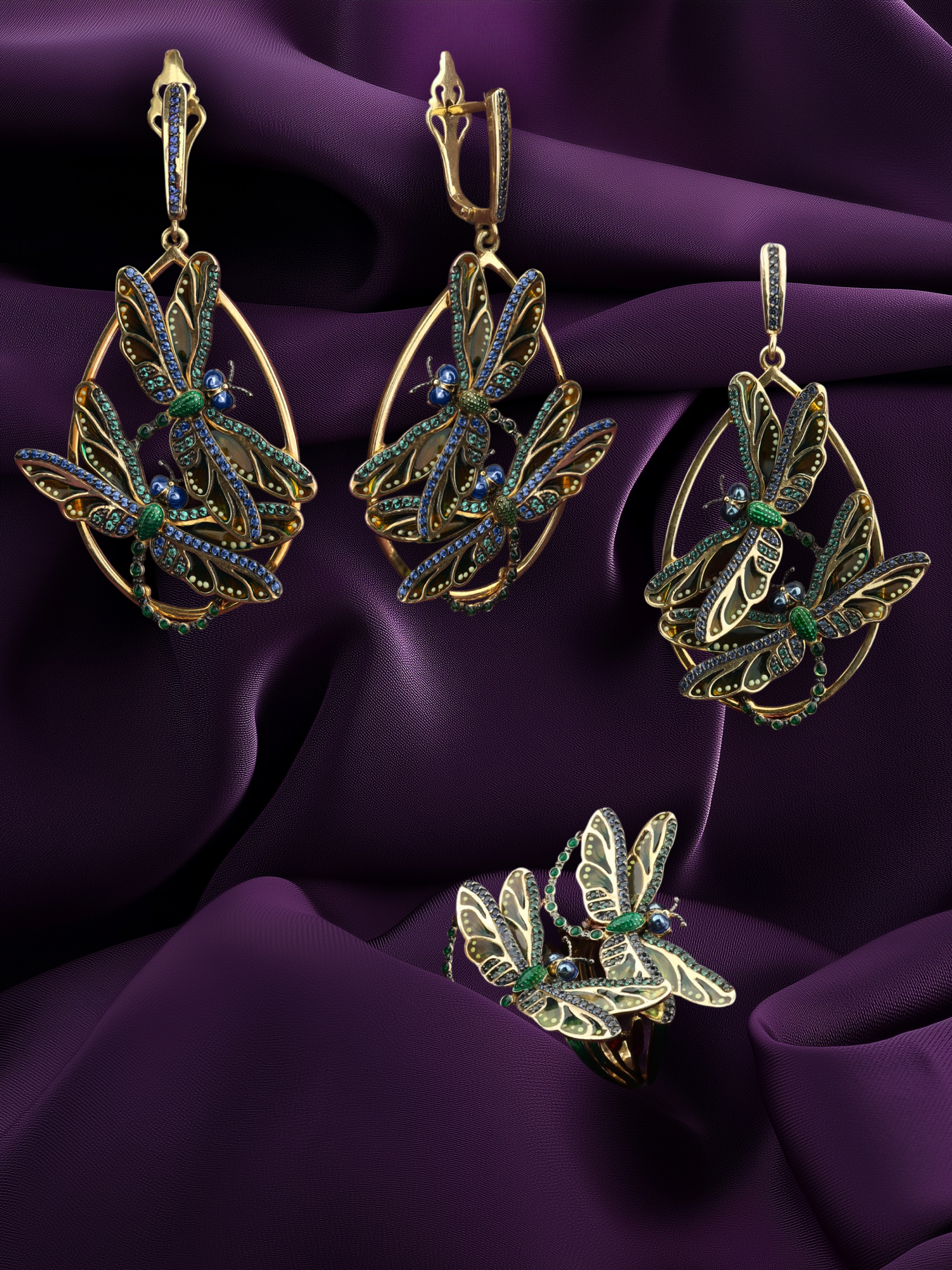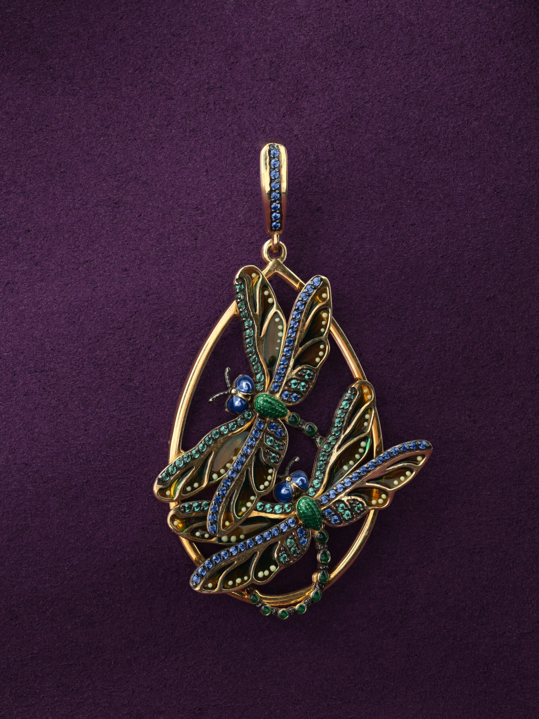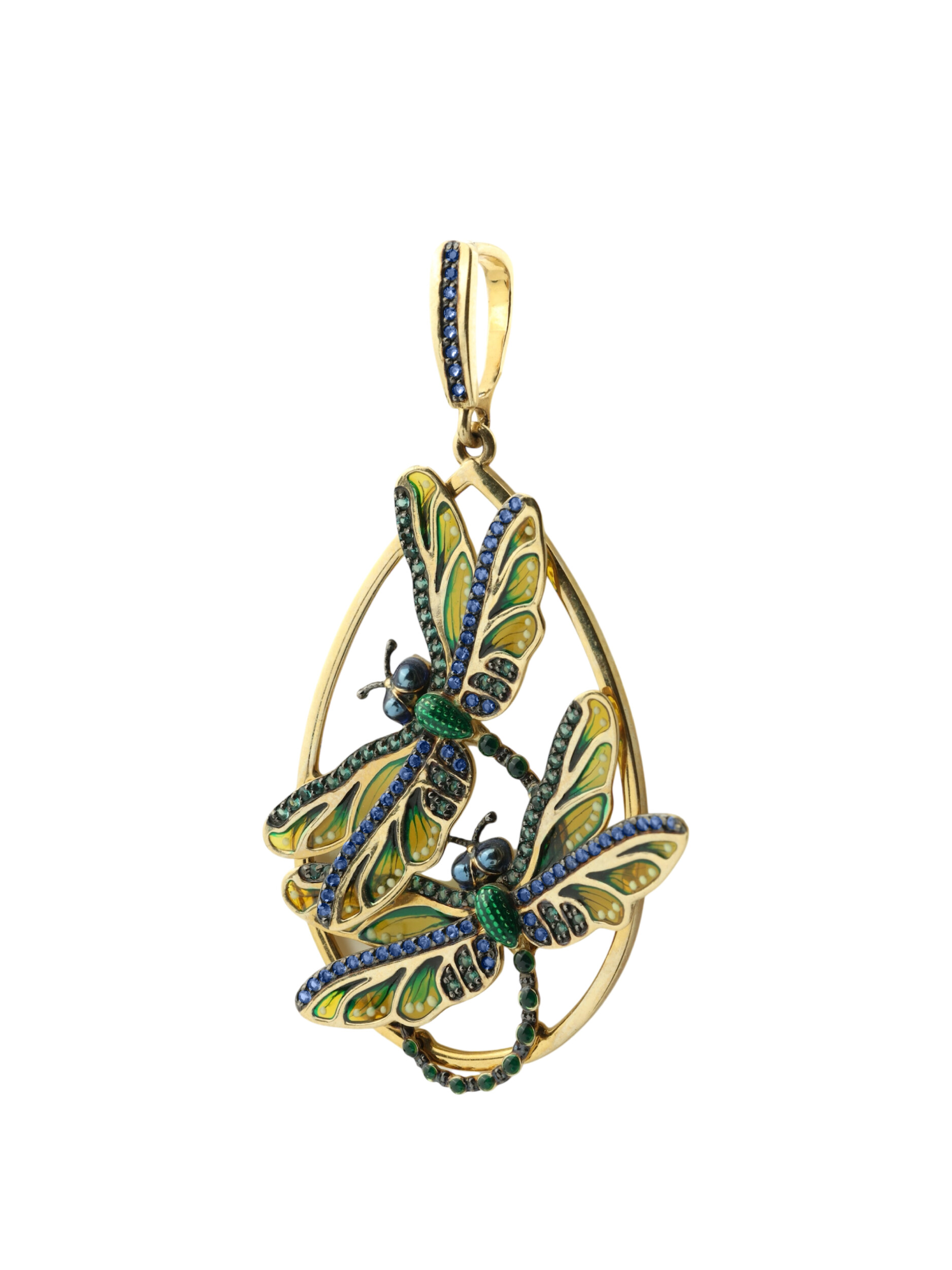 Эксклюзивная подвеска из коллекции De luxe Premium — Стрекозы станет ярким акцентом вашего образа, приковывая восхищенные взгляды утонченностью исполнения. Ювелиры воплотили в этом украшении природную грацию, выбрав в качестве центральной темы дизайн «Насекомые». Главным героем композиции выступают изящные стрекозы, выполненные с филигранной точностью.