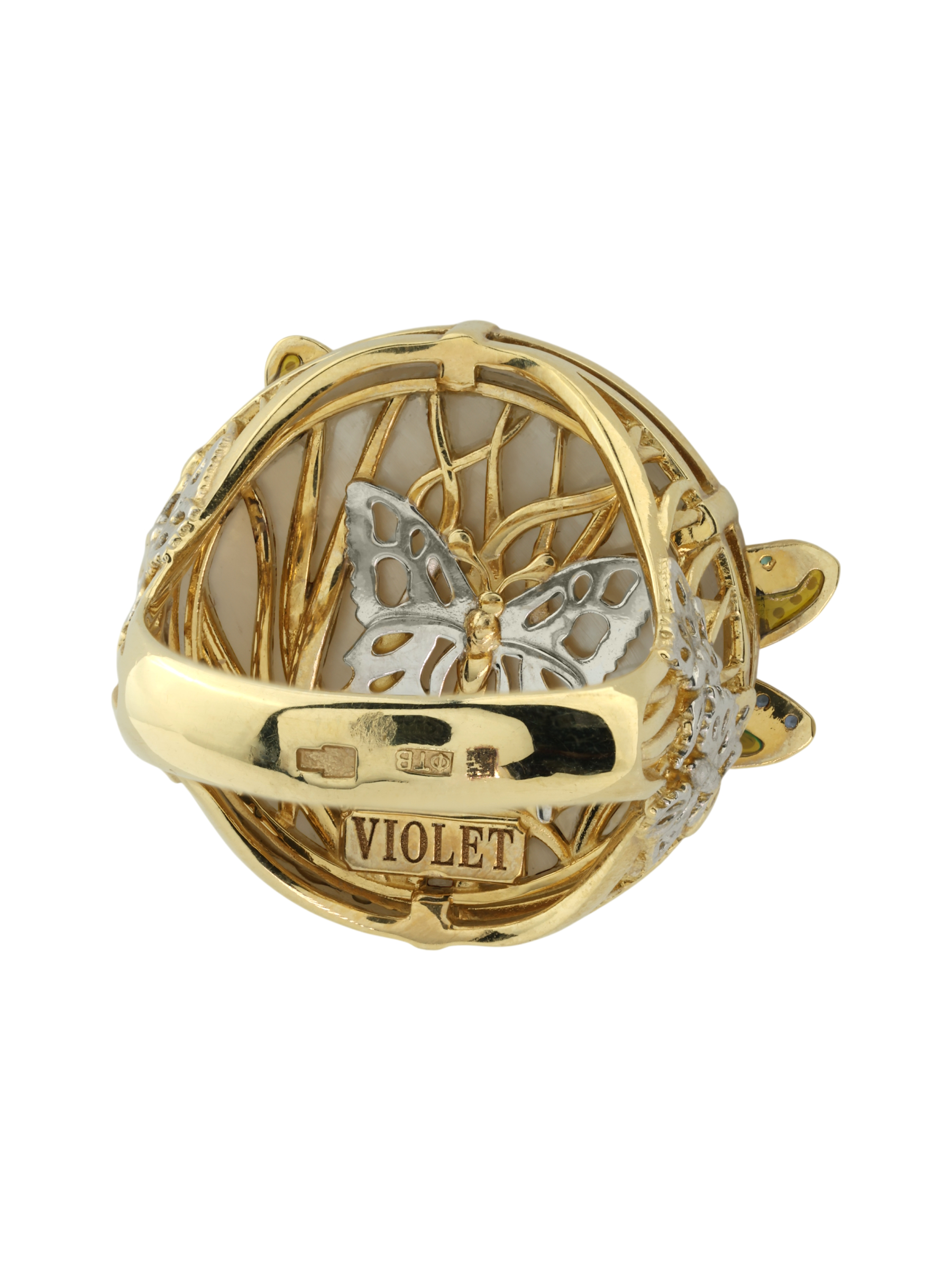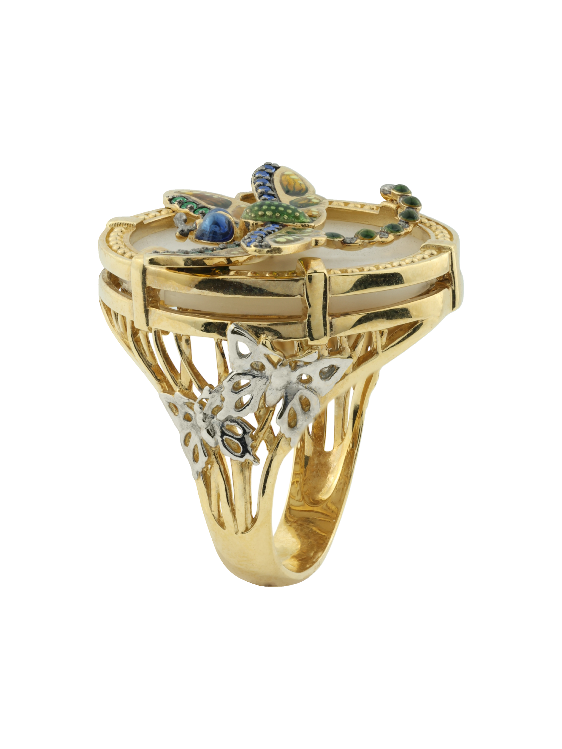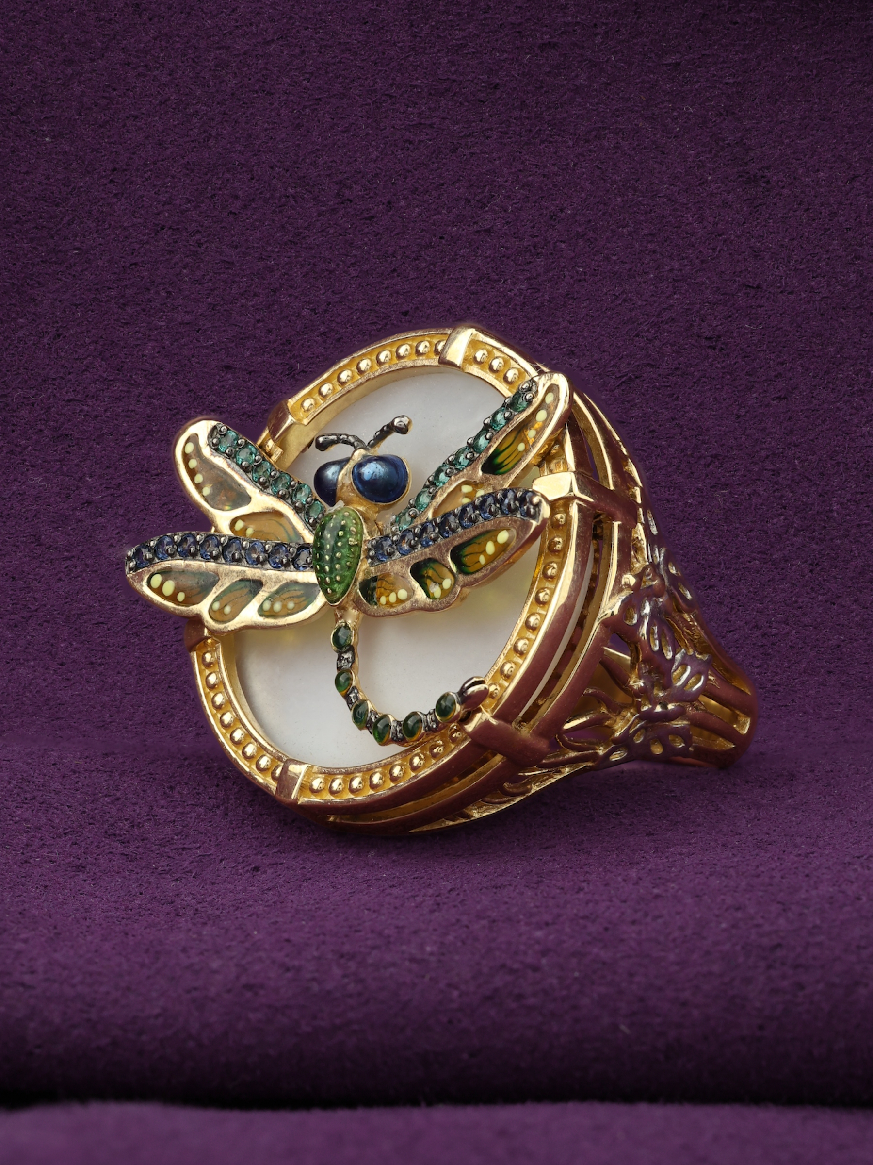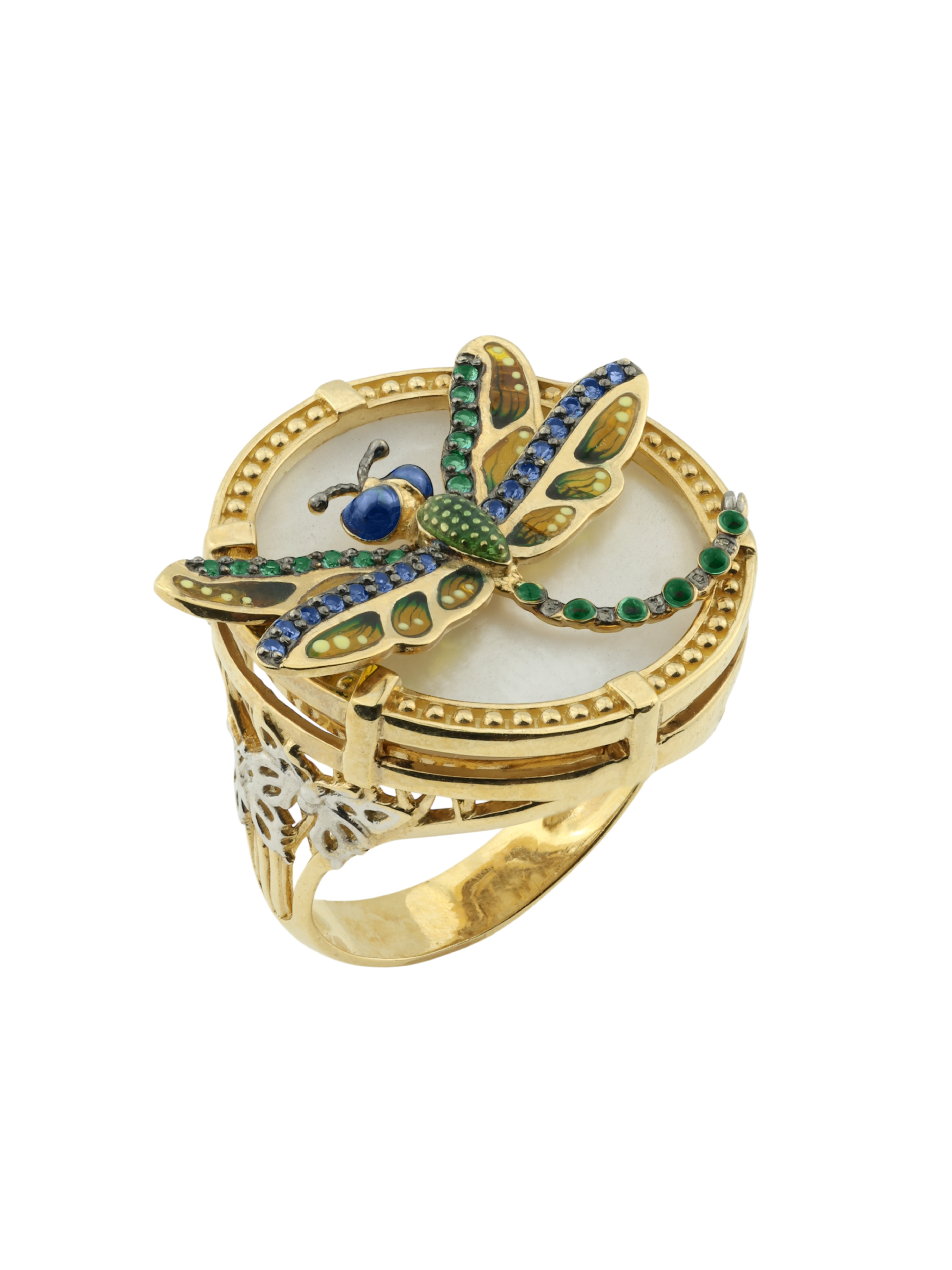 Кольцо из лимонного золота c сапфиром, изумрудом, эмалью и перламутром