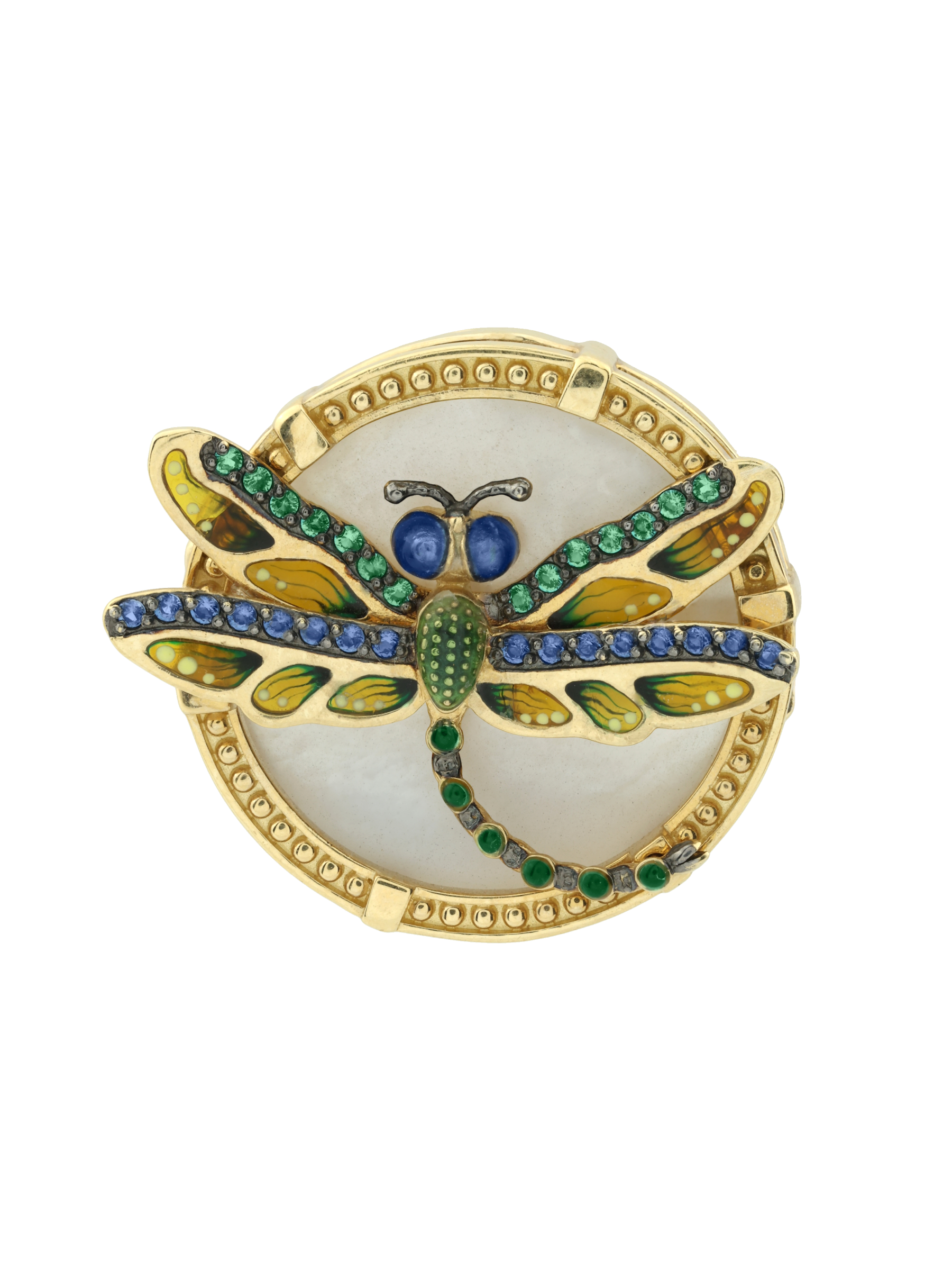 Украшение инкрустировано 30 вставками круглой формы: здесь сочетаются насыщенный зеленый изумруд, глубокий синий сапфир и разноцветная эмаль. Такое мастерское использование камней и эмали придает изделию объем и уникальный характер. Лимонное золото подчеркивает благородное сияние вставок, делая дизайн с насекомыми по-настоящему запоминающимся и статусным. Это кольцо гармонично впишется в образ как для женщин, так и для мужчин, предпочитающих смелые и выразительные аксессуары.