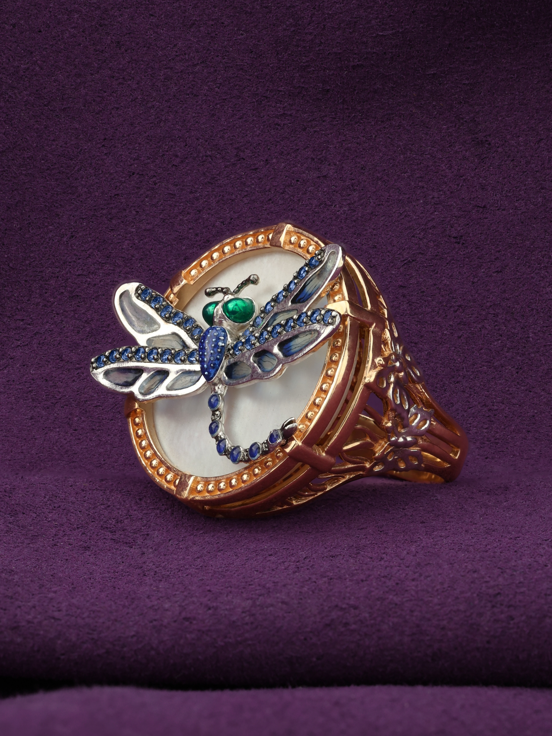 Декоративная композиция украшена 30 вставками круглой формы. Сияние синих сапфиров в сочетании с элементами цветной эмали создает динамичный и выразительный образ. Каждая деталь подчеркивает мастерство исполнения, а контраст между золотой основой и перламутром придает украшению особую глубину. Это кольцо подходит как для женщин, так и для мужчин, предпочитающих статусные и необычные аксессуары.
