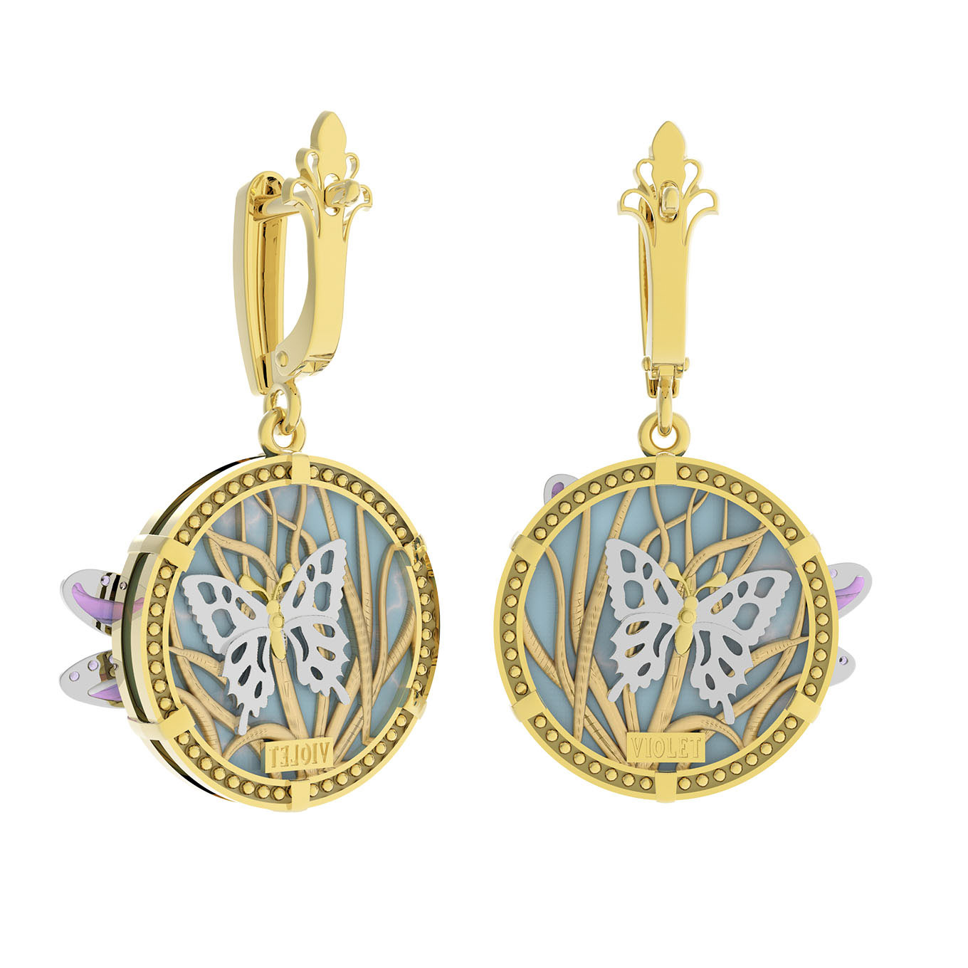 Серьги из лимонного золота c бирюзой, аметистом и эмалью