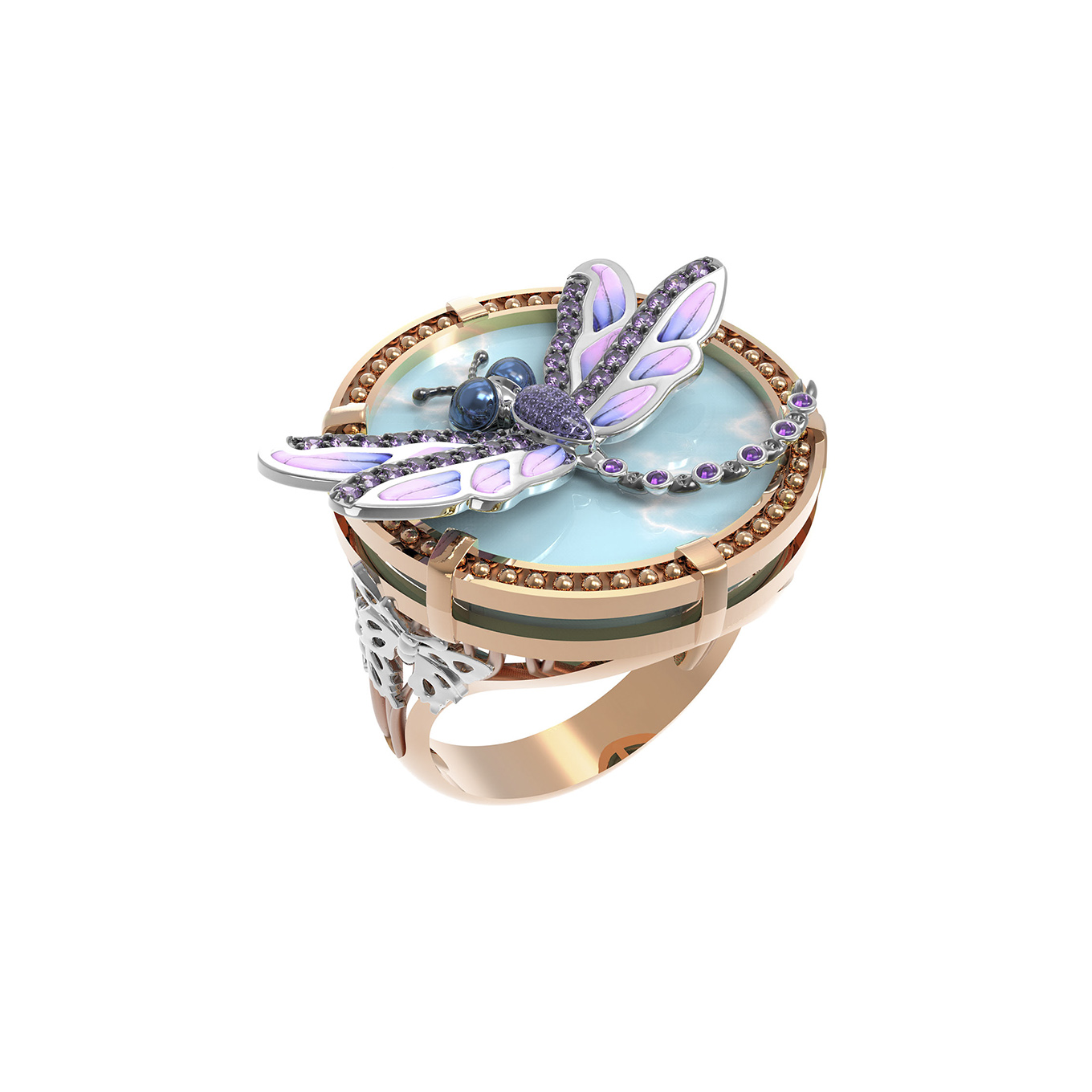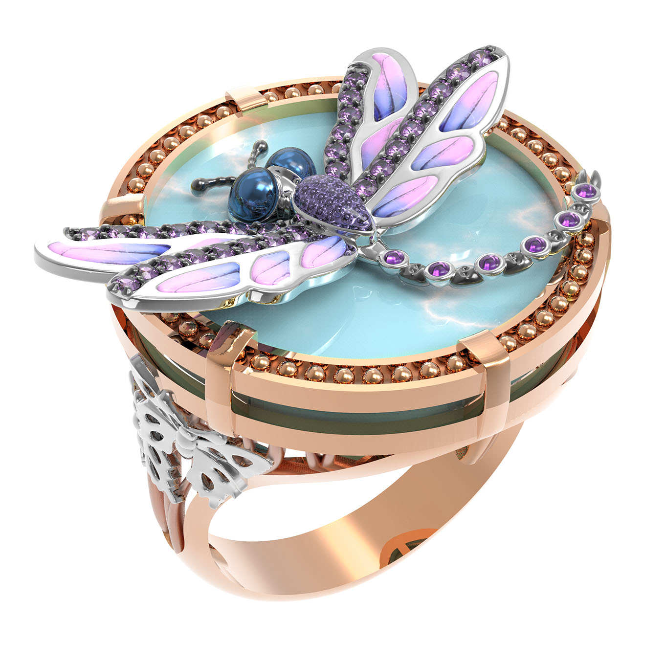 Кольцо из золота c бирюзой, аметистом и эмалью
