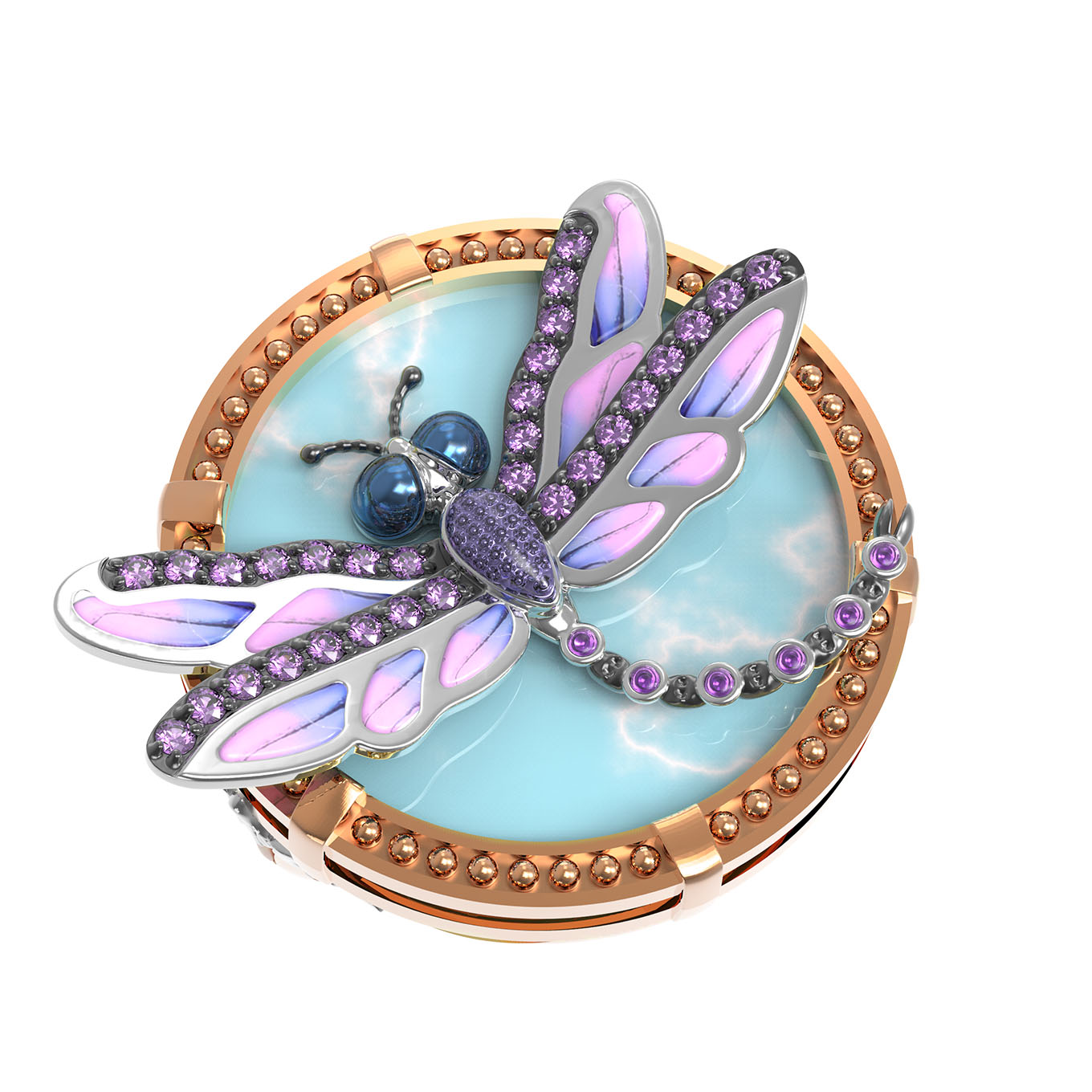 Особую художественную ценность украшению придает сложная инкрустация, насчитывающая 31 вставку круглой формы. Яркий контраст создают фиолетовые аметисты и нежные бирюзовые оттенки вставок, дополненные профессиональной работой с эмалью. Такое сочетание цветов придает изделию неповторимый шарм и глубину, привлекая внимание к каждой детали дизайна.