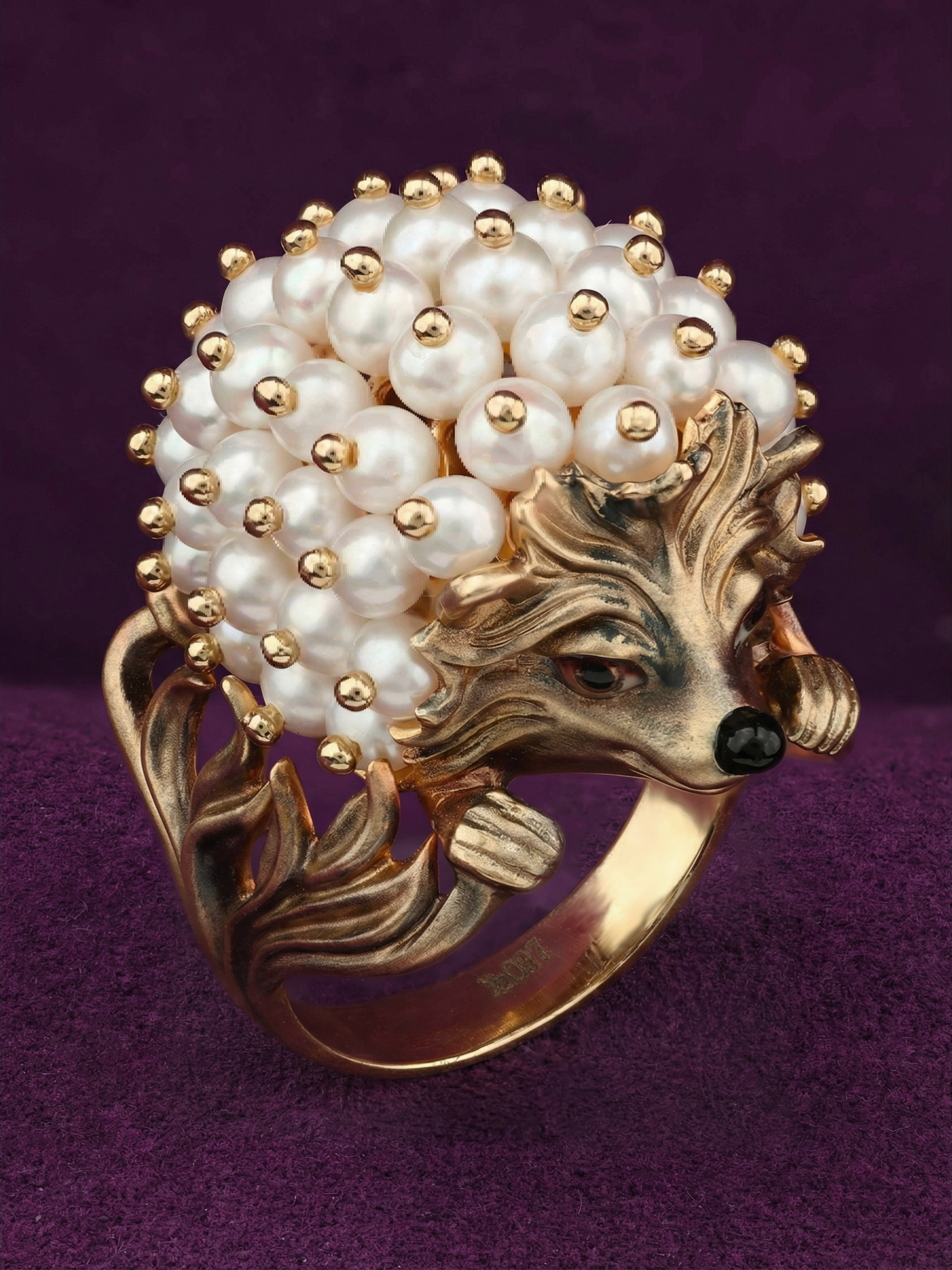 Роскошь и нежность в данном изделии подчеркивает инкрустация: спинка ежа украшена россыпью из 55 вставок жемчуга круглой формы. Белый жемчуг в сочетании с теплым оттенком красного золота создает элегантный контраст, который привлекает внимание и восхищает своей детальной проработкой. Каждая жемчужина надежно закреплена, формируя объемный и эффектный силуэт.