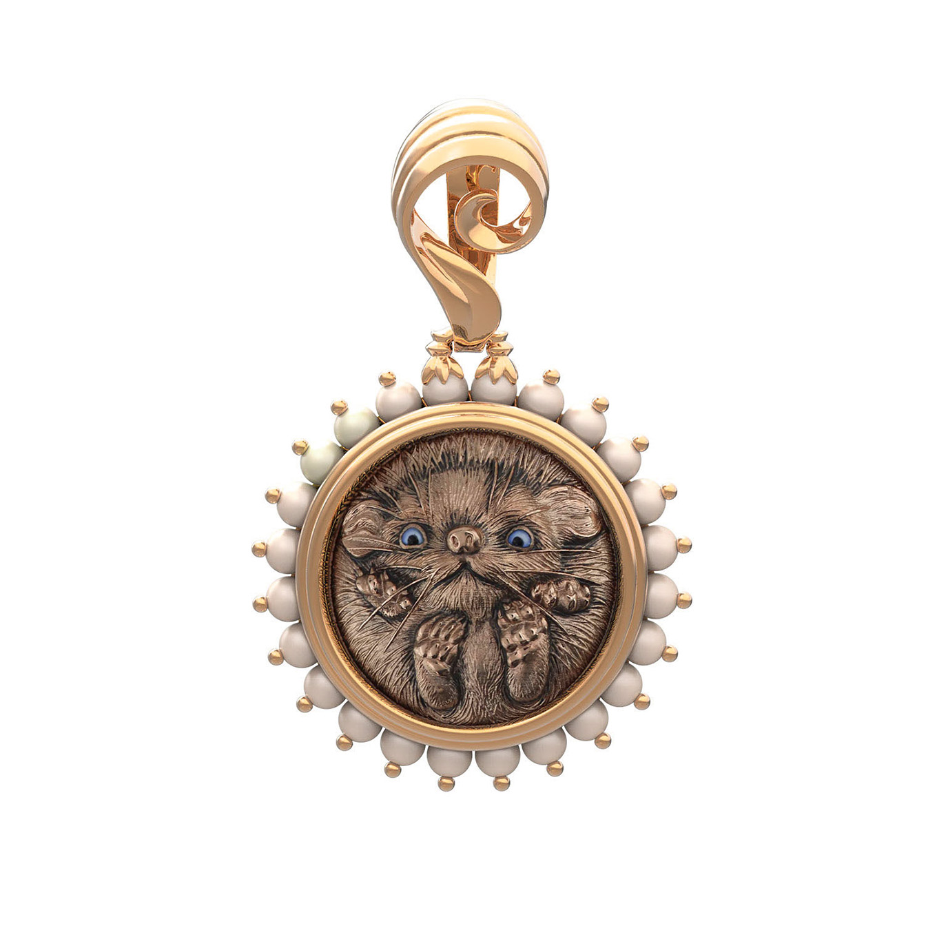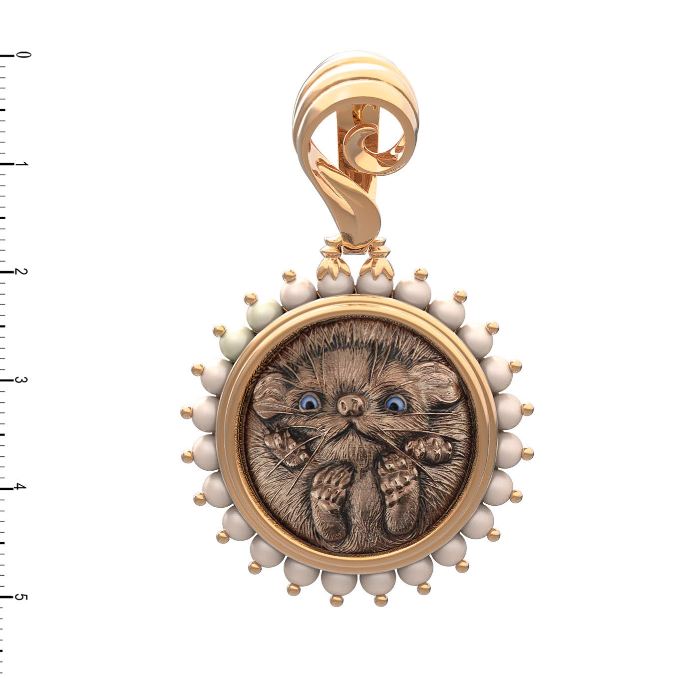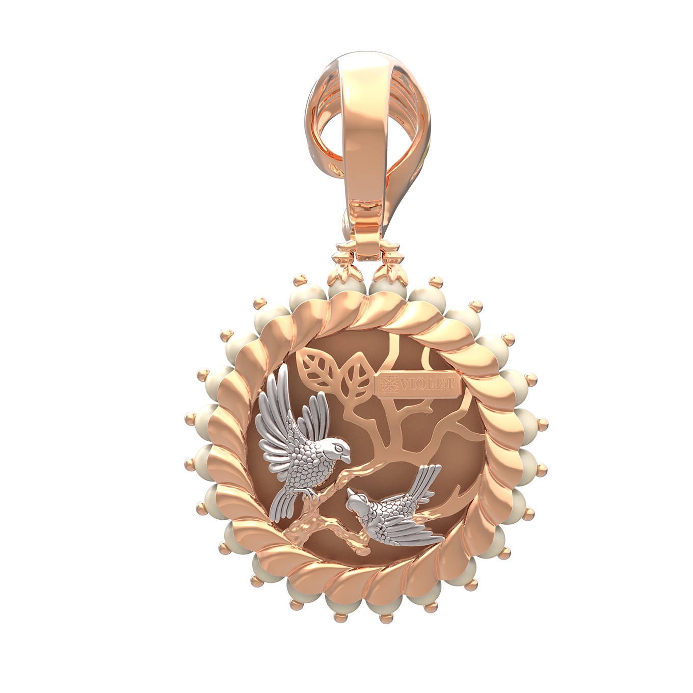 Основа изделия изготовлена из качественного красного золота 585 пробы, чей теплый оттенок благородно контрастирует с декоративными элементами. В оформлении использована стойкая эмаль, дополняющая художественный образ. Особую роскошь подвеске придает инкрустация: по периметру расположены 24 круглые вставки из жемчуга белого цвета, которые создают эффектное обрамление, притягивающее взгляд своей чистотой и блеском. Контрастные акценты в черных тонах завершают композицию, делая её гармоничной и выразительной.