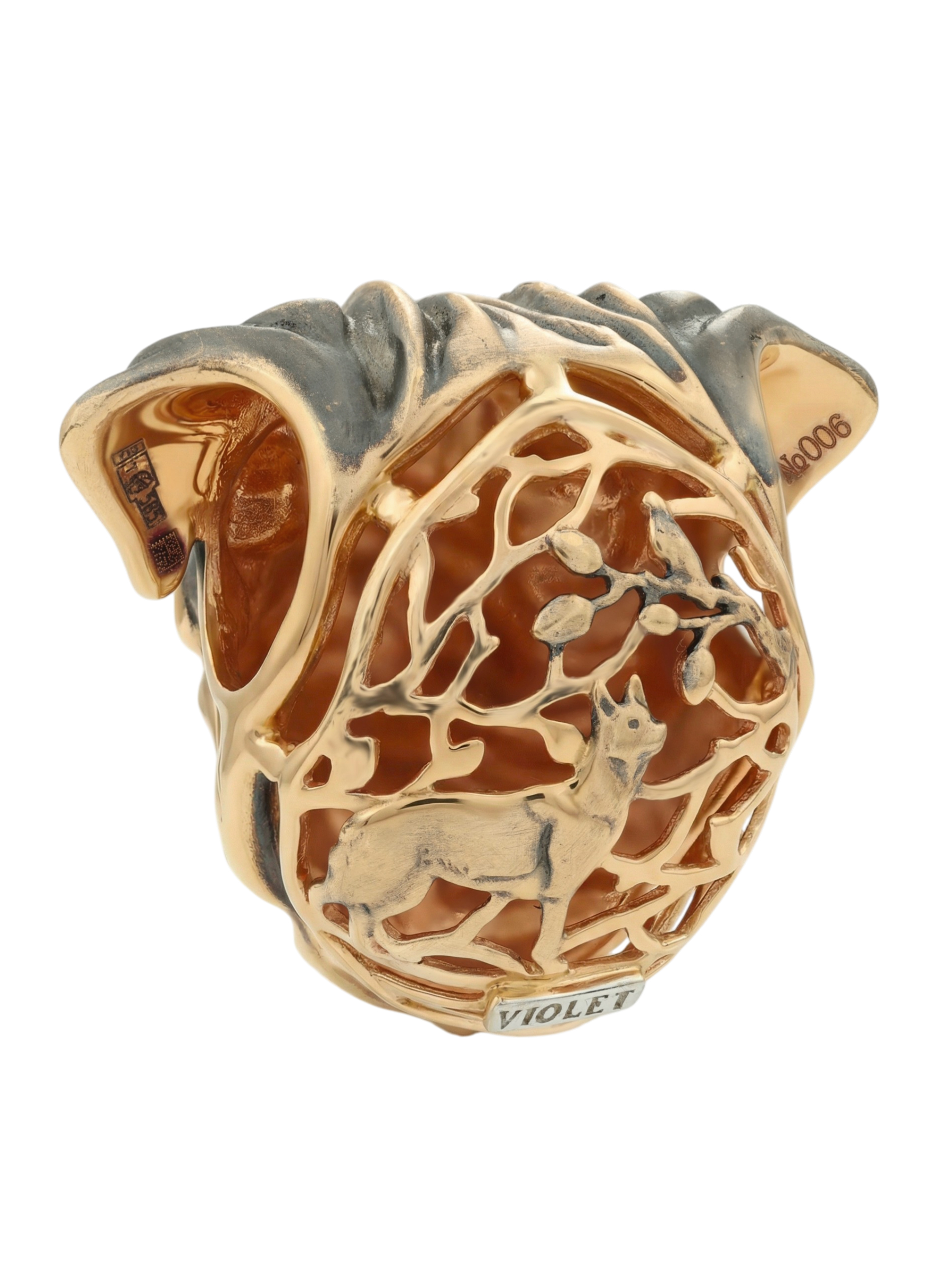 Мастерство ювелиров позволило передать живой характер и обаяние этой породы собак. Особый шарм изделию придает вставка из черной эмали, которая подчеркивает рельефные линии и создает красивый контраст с теплым оттенком красного золота. Такая техника обработки делает украшение глубоким и объемным. Подвеска отлично сочетается с другими аксессуарами, что позволяет составлять стильные комплекты, добавляя в гардероб нотку иронии и безупречного вкуса. Выбирая данную модель из коллекции De luxe Premium — Мопсы, вы приобретаете не просто украшение, а аксессуар, который всегда будет выглядеть актуально и привлекательно.