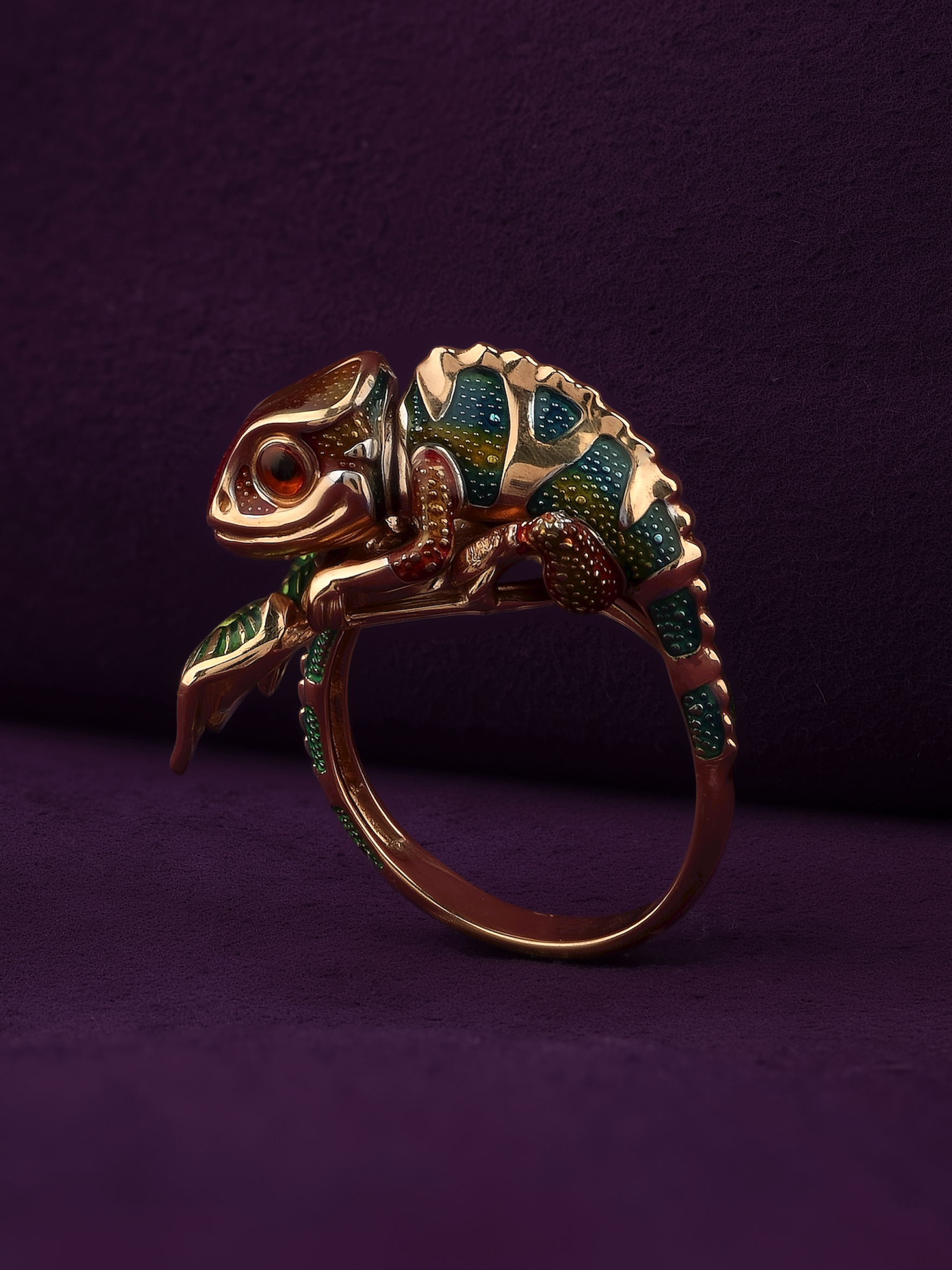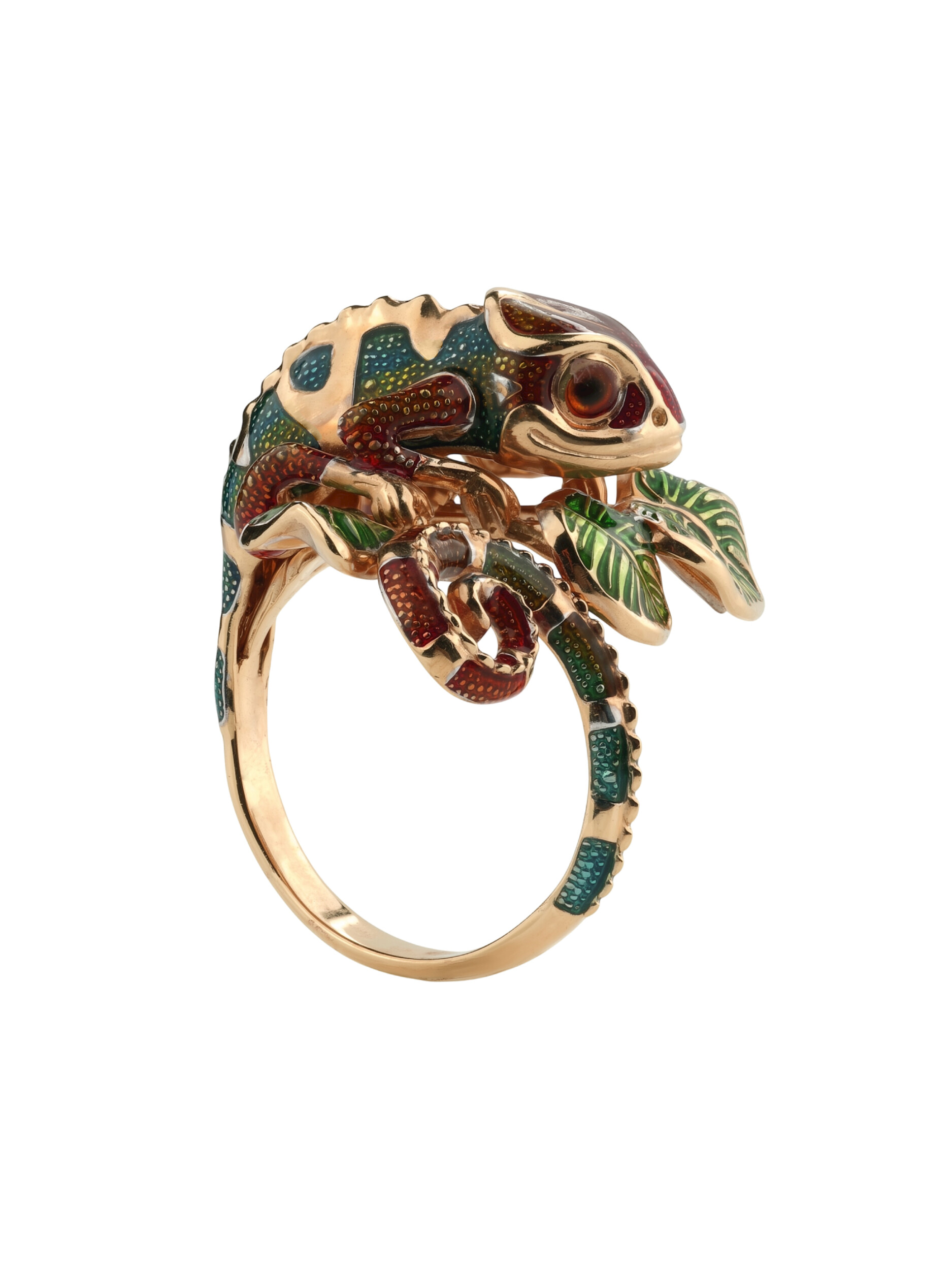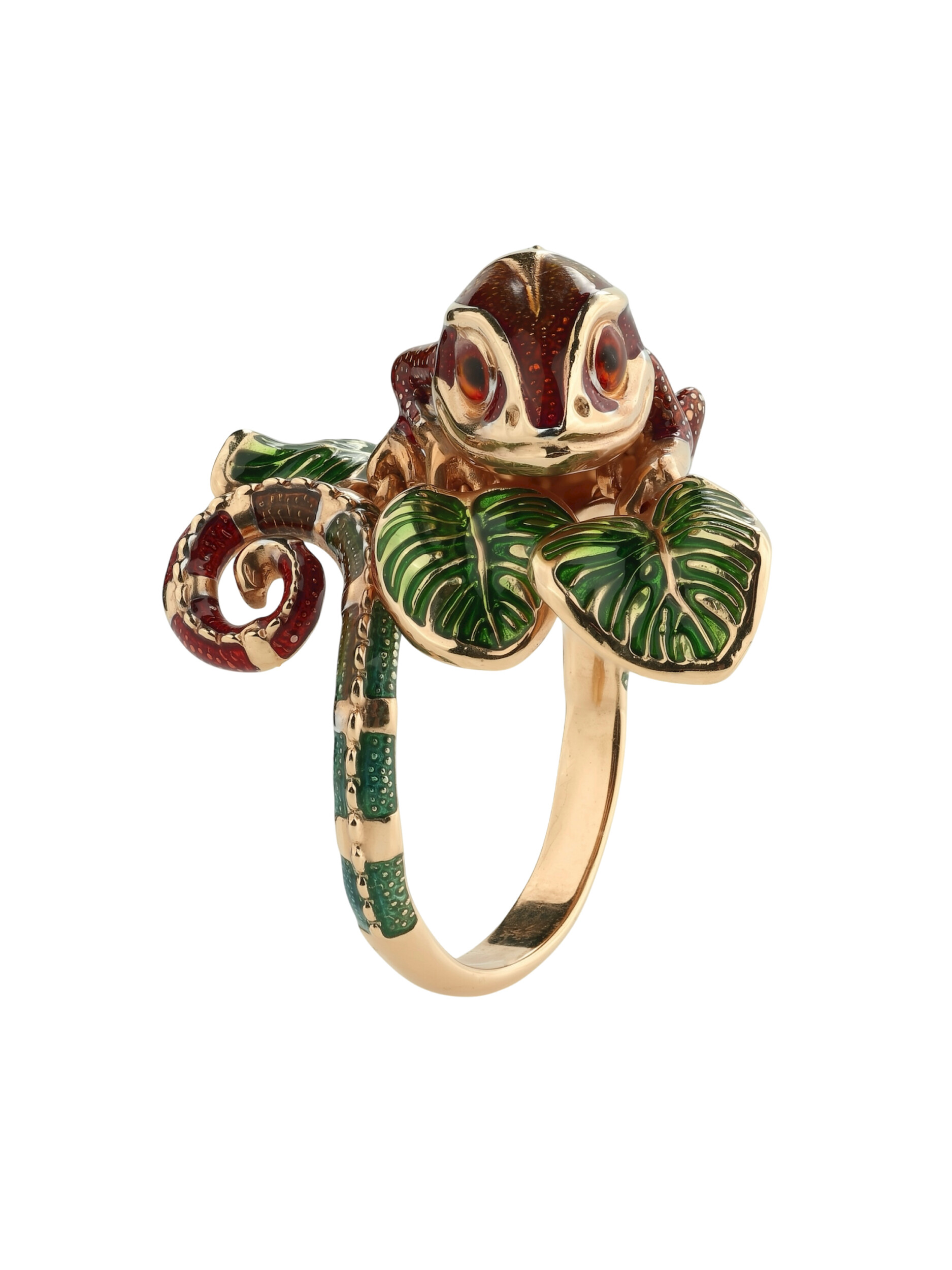 Это оригинальное кольцо выполнено из качественного красного золота и гармонично сочетает в себе классический материал и креативную форму. Дизайн хамелеоны позволяет носить это изделие как женщинам, так и мужчинам, предпочитающим смелые и необычные аксессуары. Использование цветной эмали в качестве вставки добавляет яркости, делая акцент на каждой детали фигурки.