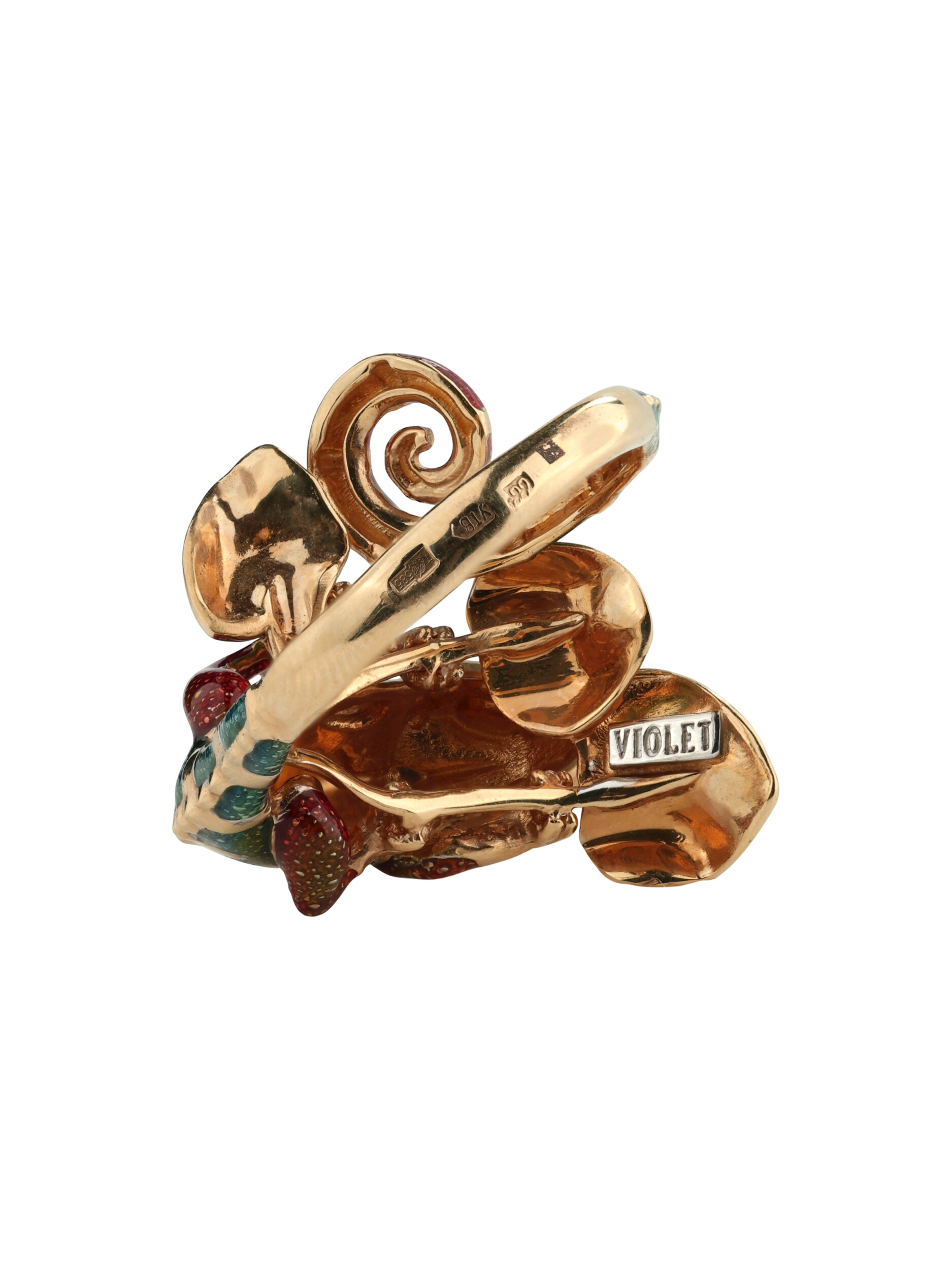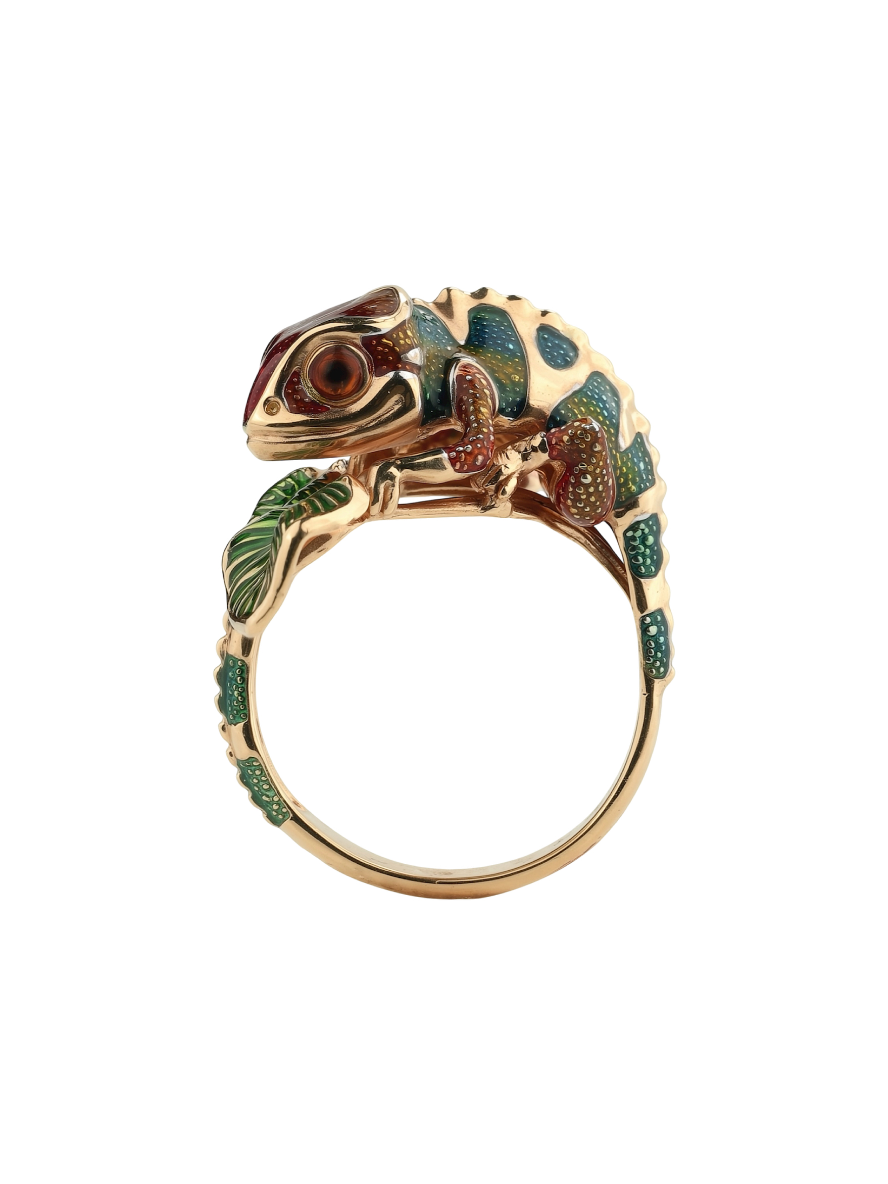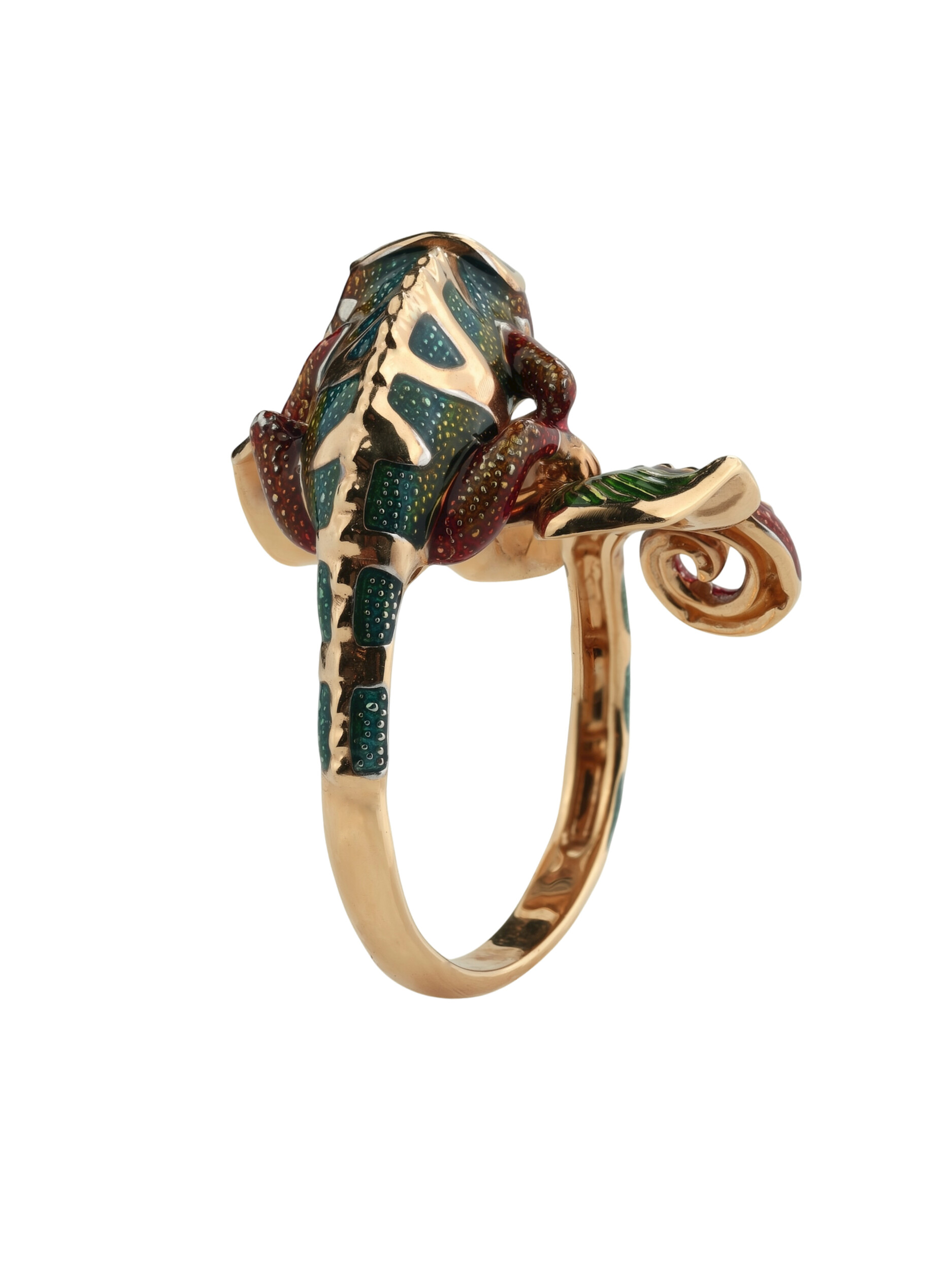 Это оригинальное кольцо выполнено из качественного красного золота и гармонично сочетает в себе классический материал и креативную форму. Дизайн хамелеоны позволяет носить это изделие как женщинам, так и мужчинам, предпочитающим смелые и необычные аксессуары. Использование цветной эмали в качестве вставки добавляет яркости, делая акцент на каждой детали фигурки.