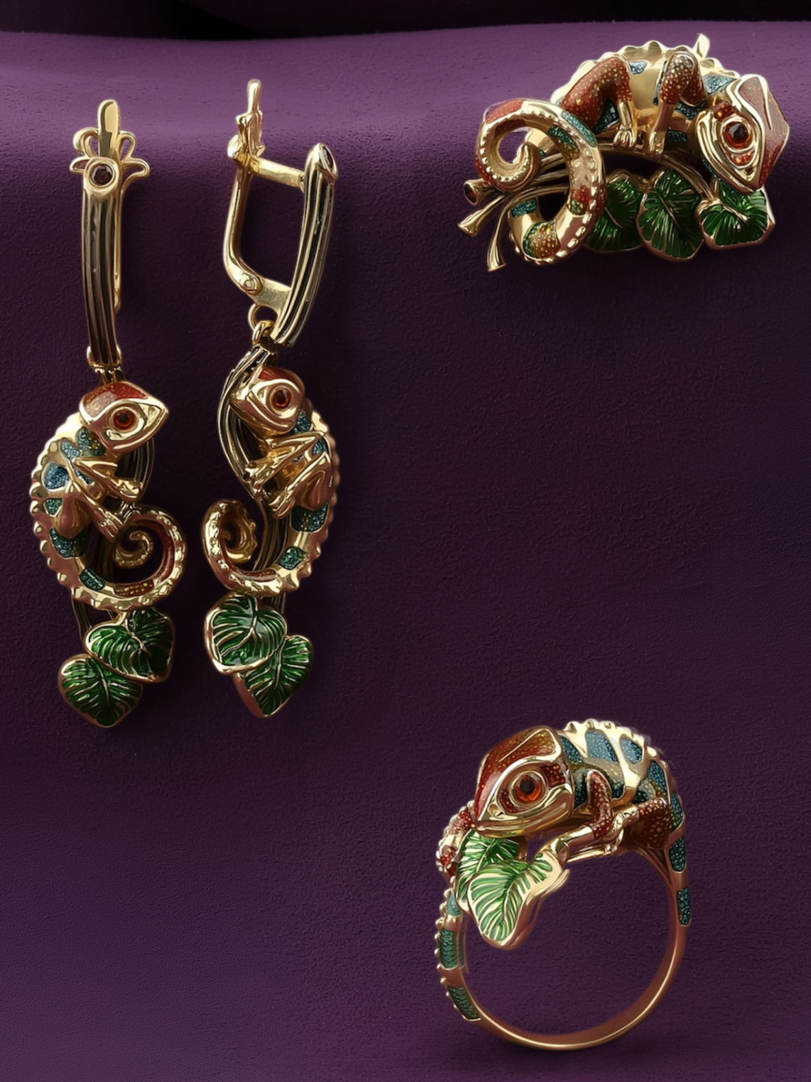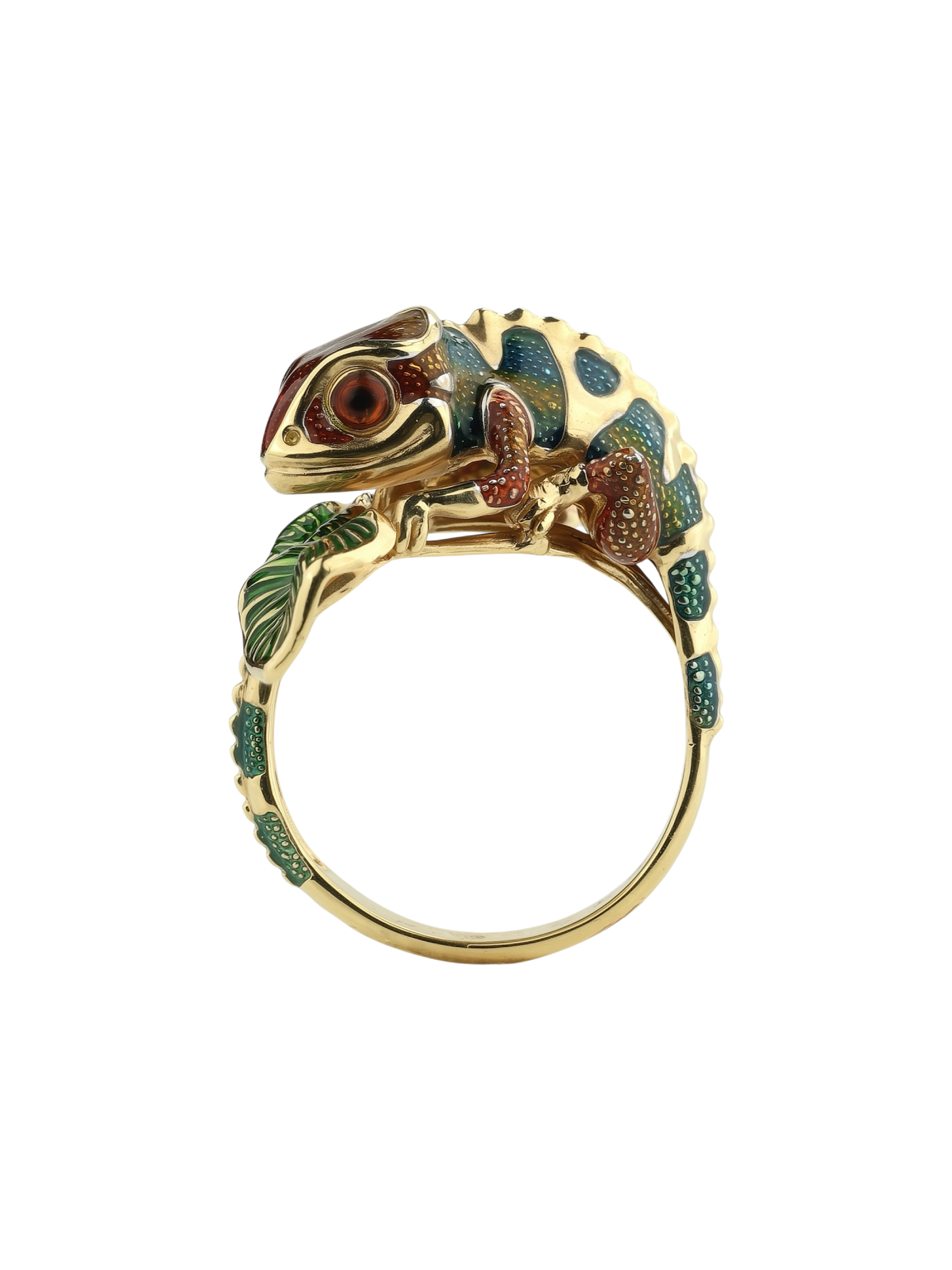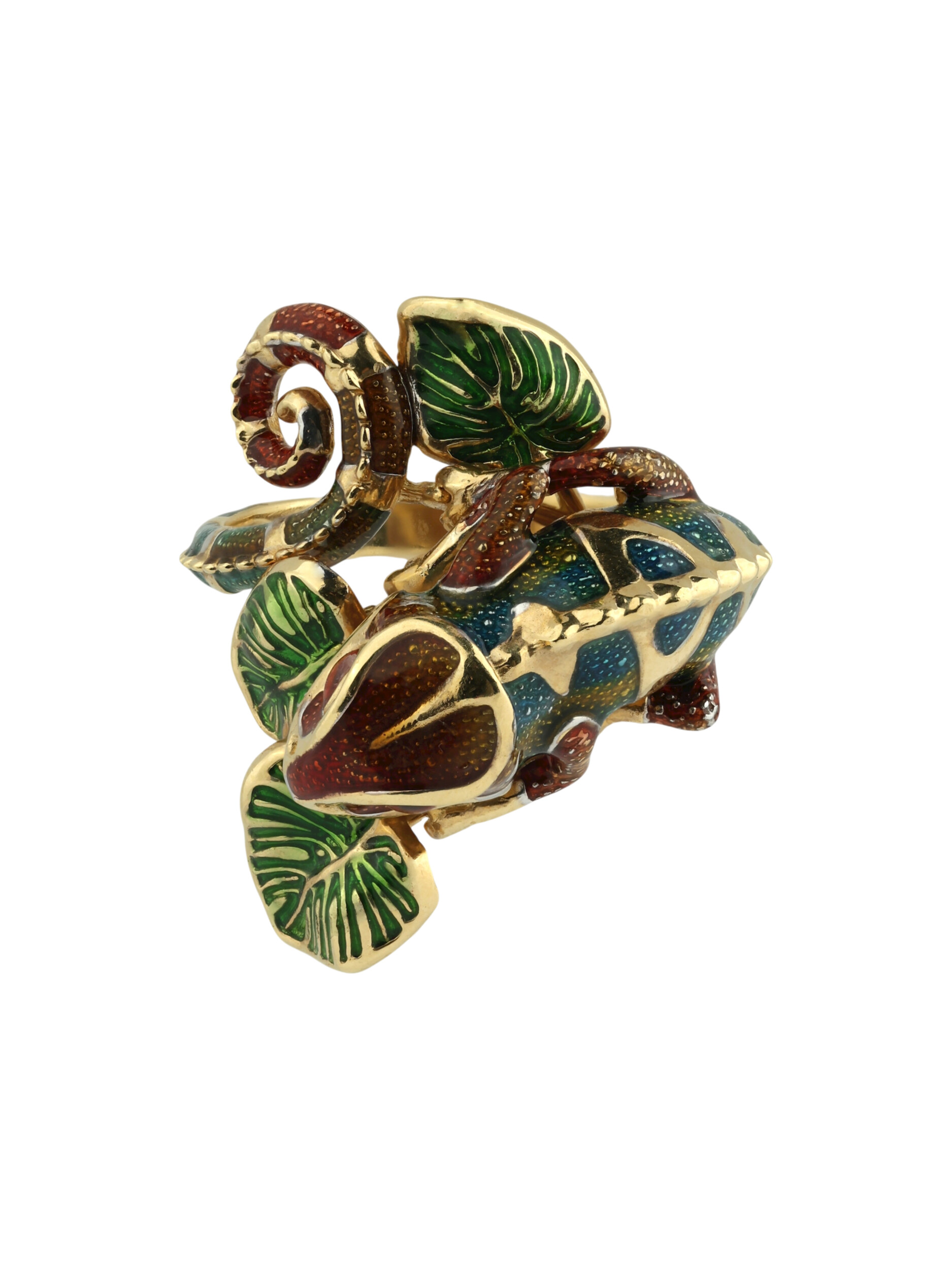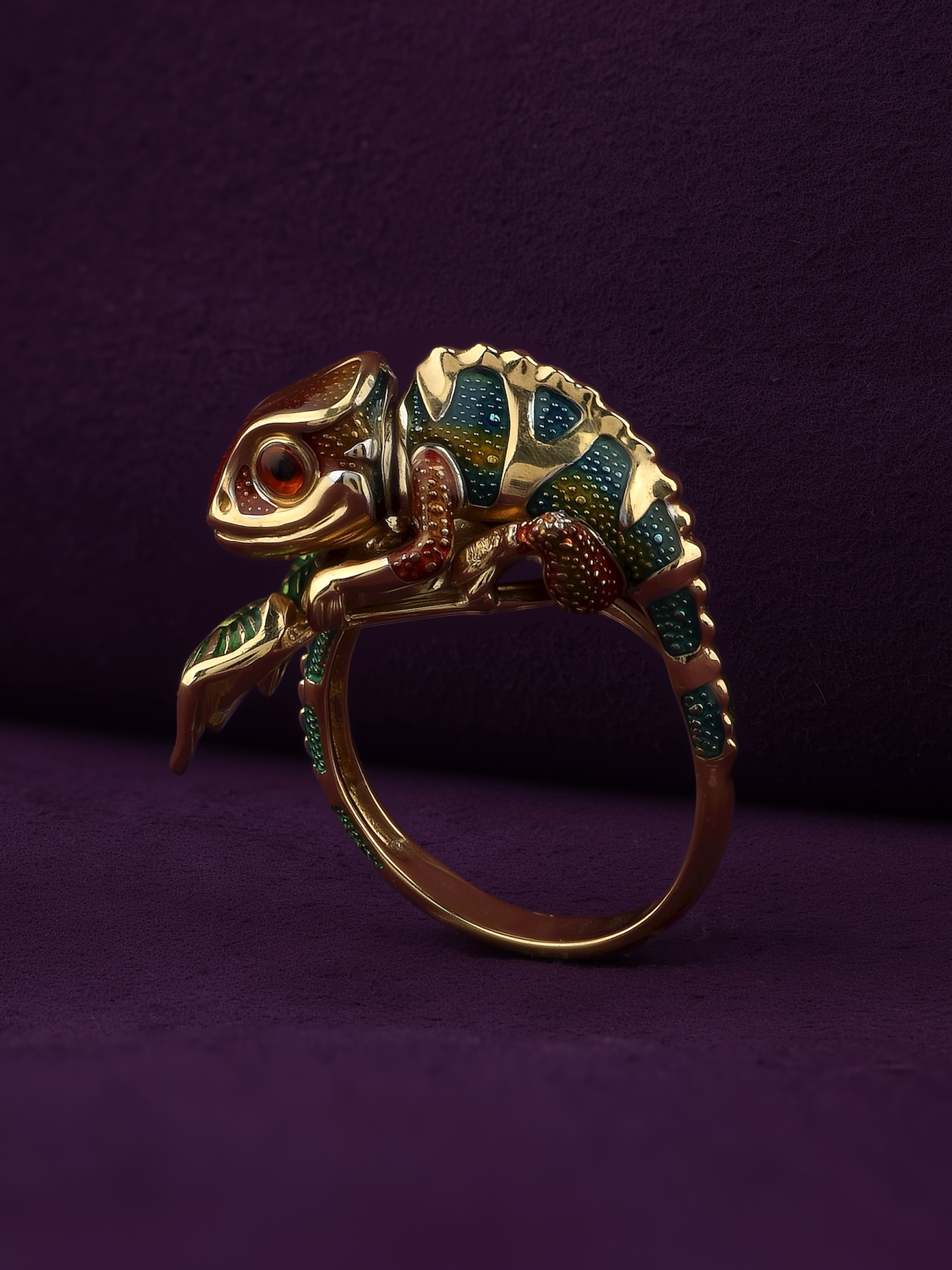 Особую выразительность аксессуару придает разноцветная эмаль, покрывающая тело хамелеона. Яркие переходы цвета создают эффект игры света и тени, привлекая внимание к каждому изгибу изделия. Лимонное золото великолепно сочетается с эмалевой вставкой, формируя гармоничную и эстетичную композицию. Данная модель универсальна: кольцо подходит как для женщин, так и для мужчин, желающих дополнить свой стиль нетривиальным украшением.