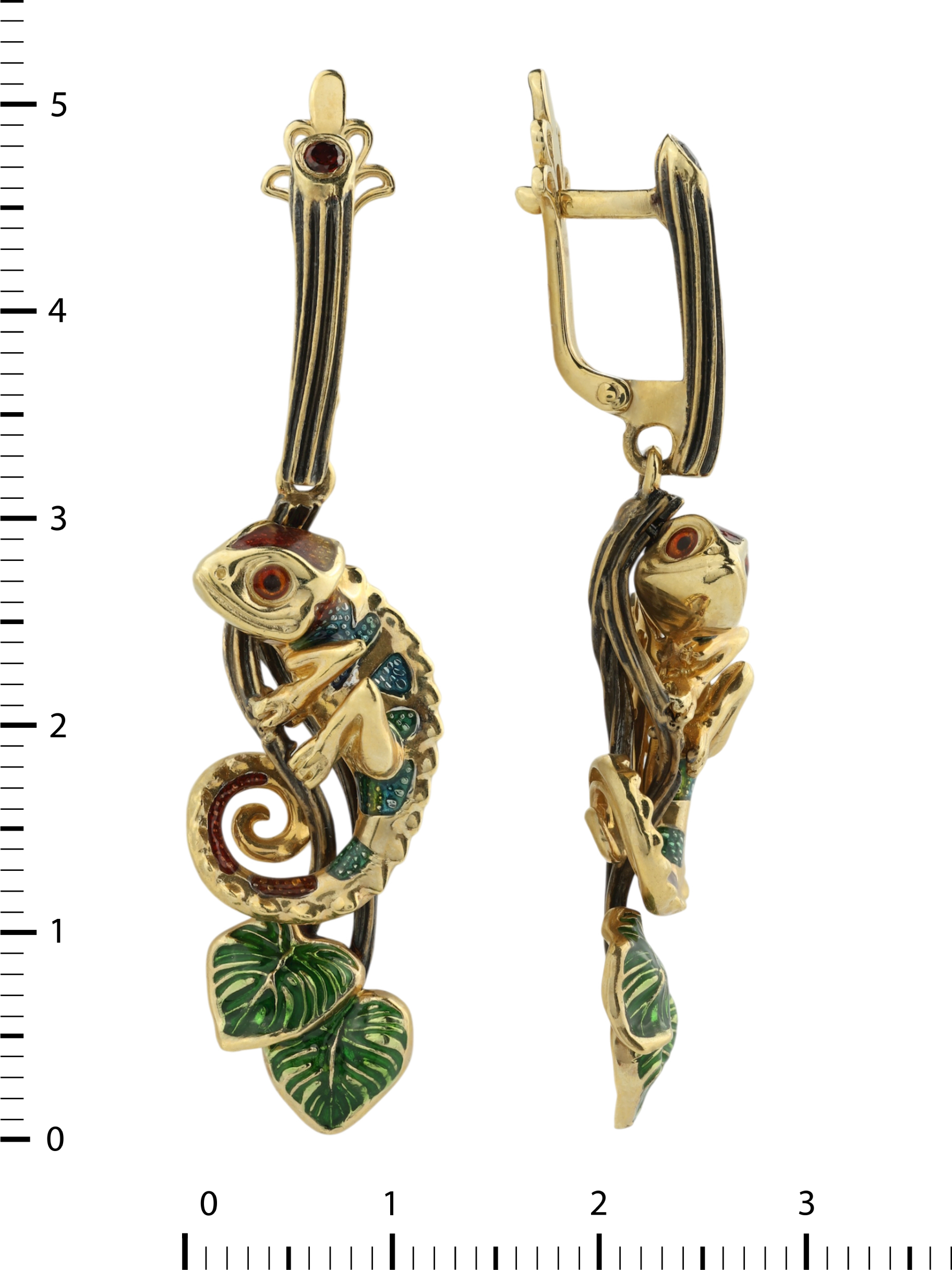 Мастерская работа с эмалью позволила добиться потрясающей детализации и насыщенности цвета, делая разноцветный узор вставок по-настоящему живым и динамичным. В качестве акцентов в изделии использованы 2 вставки из натурального граната круглой формы, чей глубокий красный цвет подчеркивает благородный оттенок лимонного золота. Контрастное сочетание драгоценного металла и ярких оттенков эмали создает притягательный визуальный эффект.