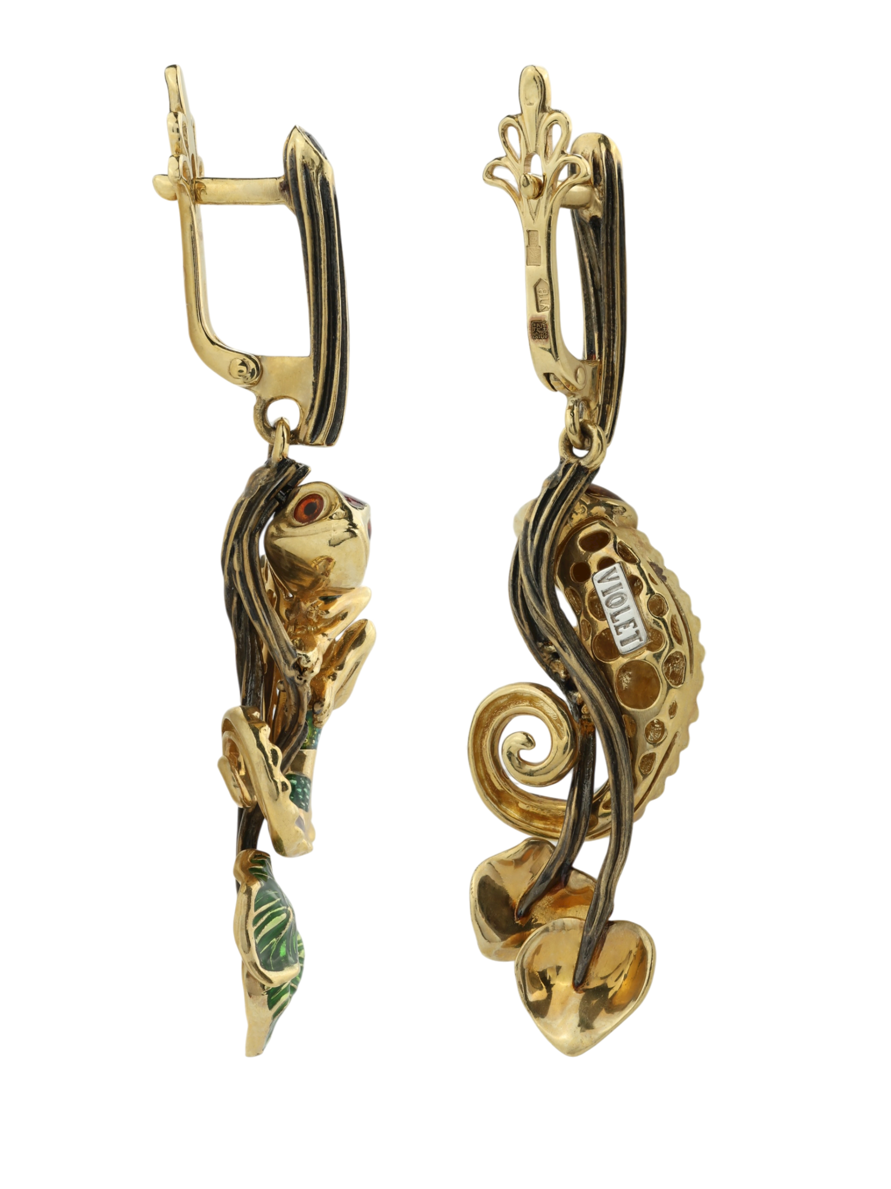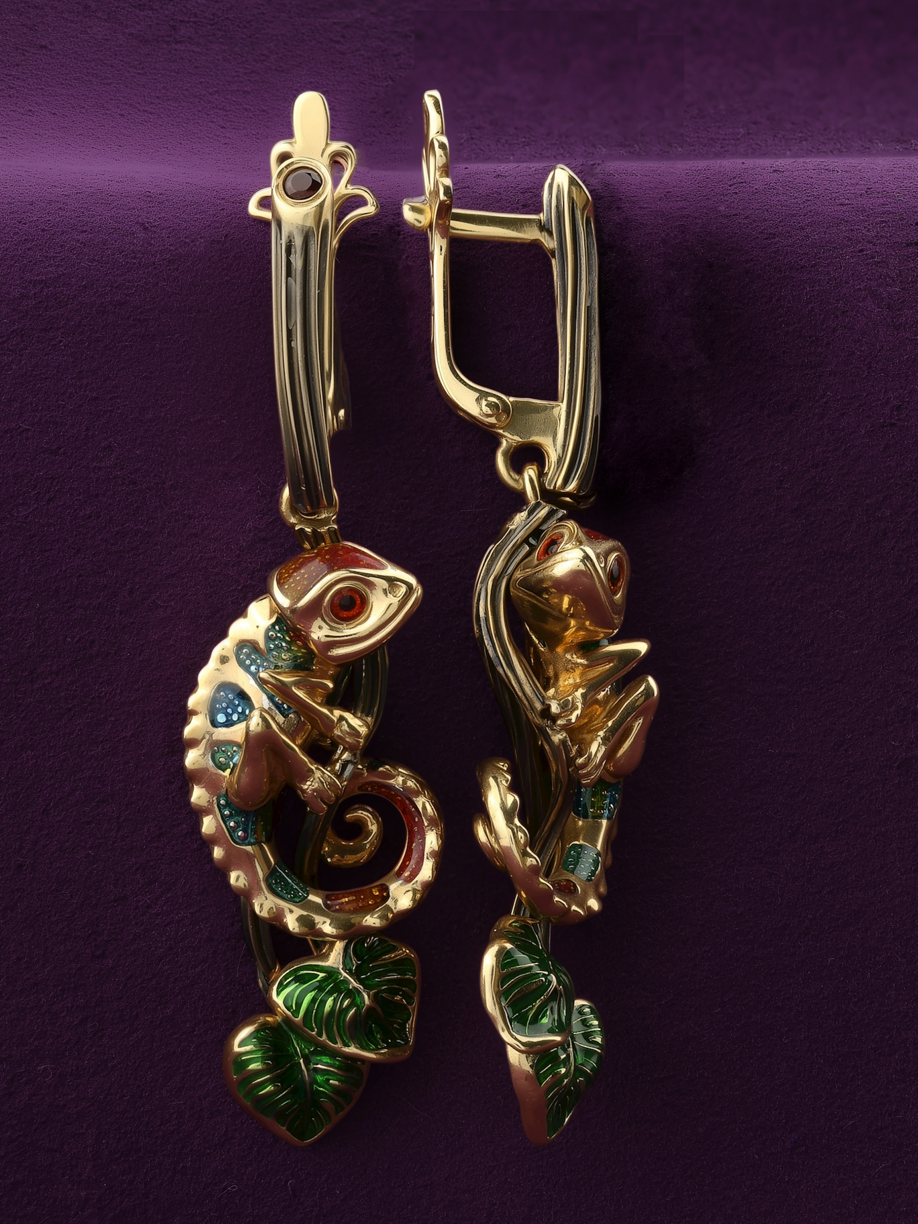 Представляем вашему вниманию эксклюзивные серьги из лимонного золота 585 пробы, входящие в коллекцию De luxe Premium — Хамелеоны. Это украшение создано для тех, кто ценит в ювелирном искусстве смелые идеи и художественную выразительность. Центральным элементом композиции стал оригинальный дизайн в форме грациозных хамелеонов, замерших на золотых ветвях.