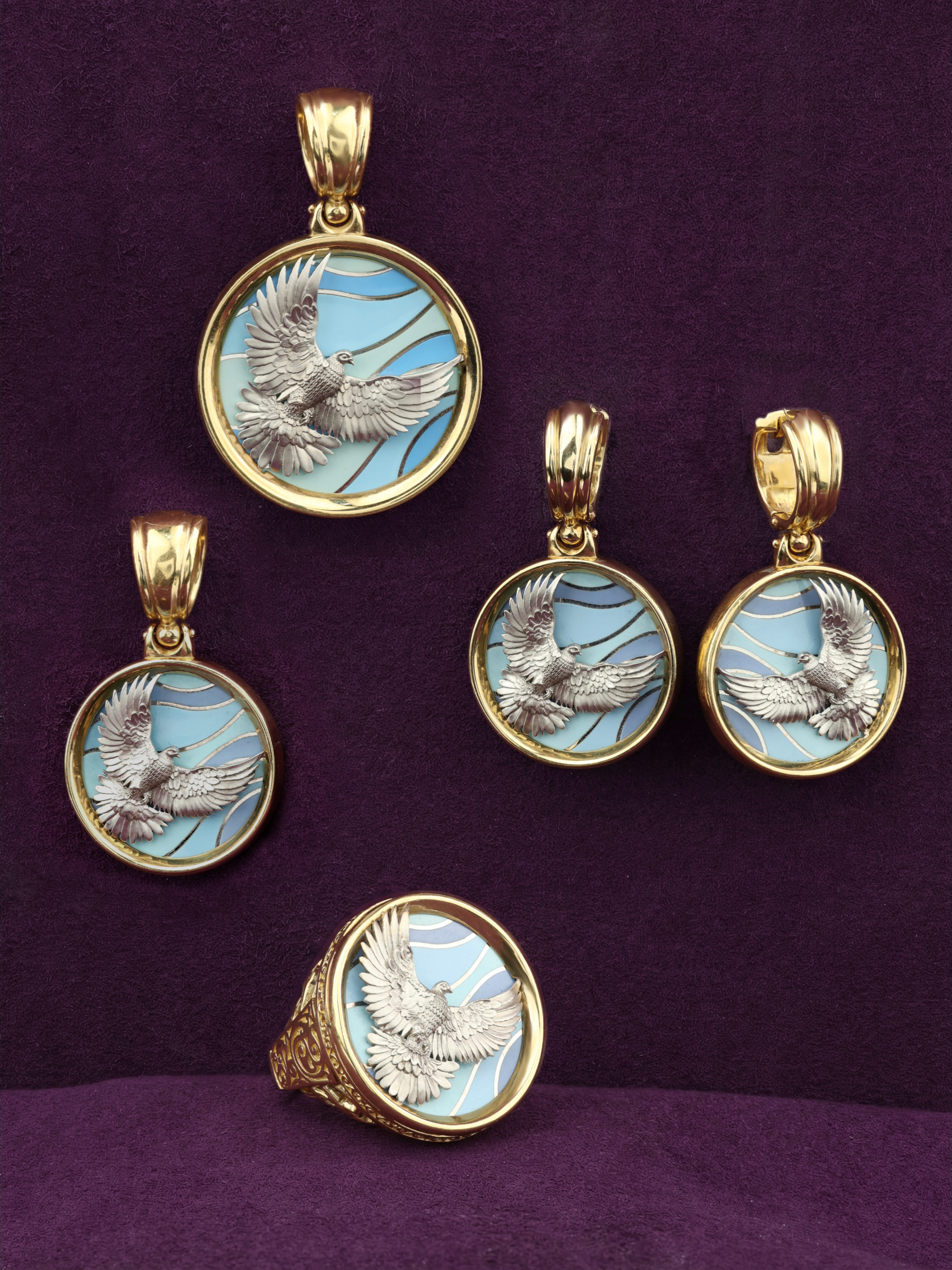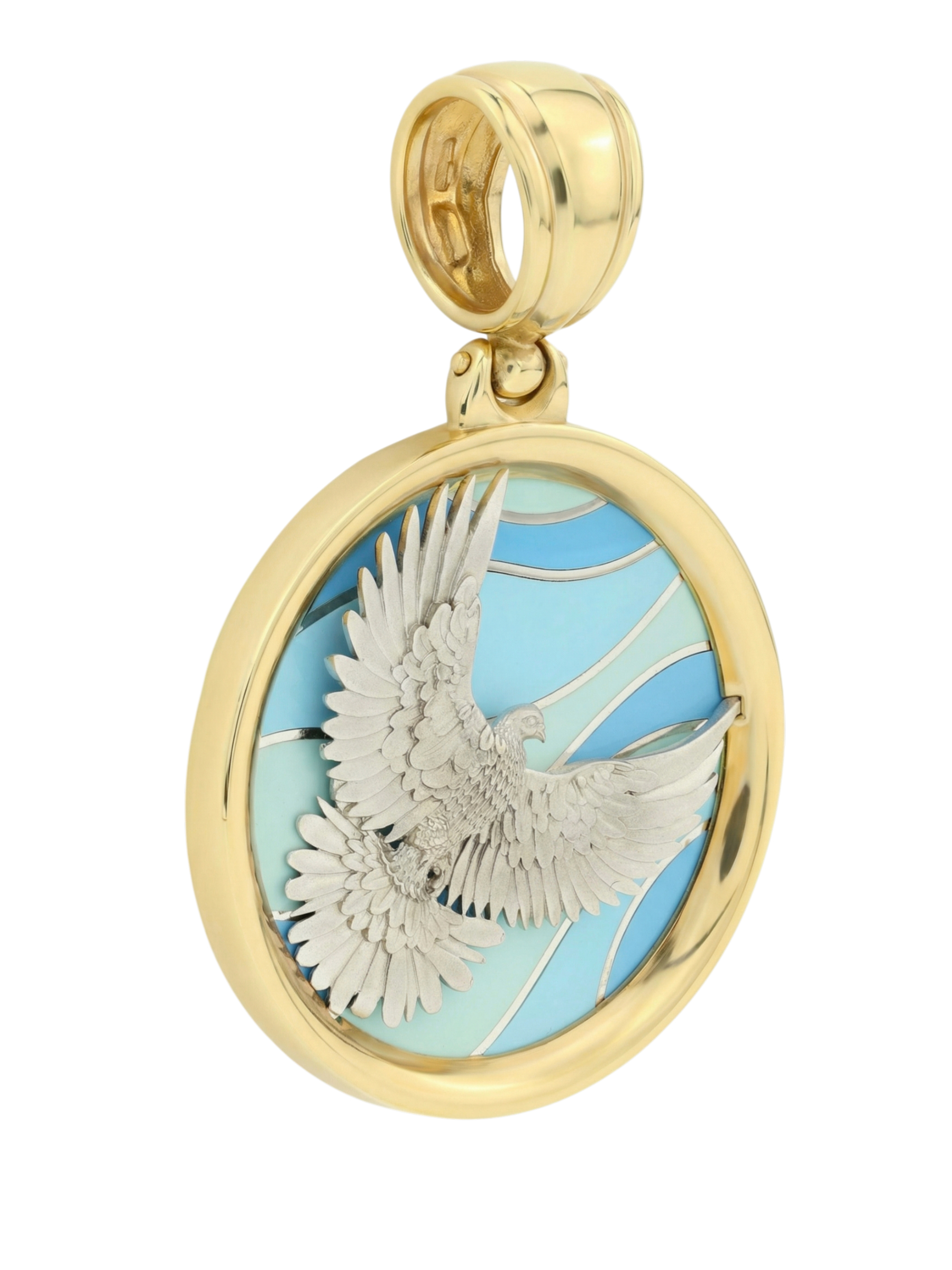 Подвеска из лимонного золота 585 пробы — это изысканное ювелирное украшение, воплощающее в себе глубокий символизм и безупречное мастерство исполнения. Изделие входит в коллекцию De luxe Premium — Голубь мира, центральным образом которой является голубь мира. Фигура птицы выполнена с поразительной детализацией, передающей легкость и динамику полета на фоне искусной художественной эмали. Разноцветный оттенок эмалевого покрытия создает эффект бесконечного неба, подчеркивая благородный блеск лимонного золота.