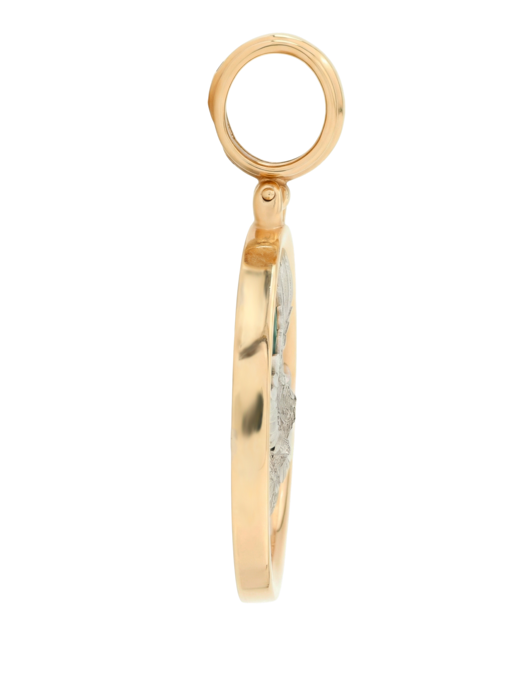 Основа украшения изготовлена из благородного красного золота 585 пробы, которое эффектно обрамляет центральный элемент. В качестве вставки использована яркая и стойкая разноцветная эмаль, создающая выразительный фон для основной фигуры. Тщательная проработка рельефа придает подвеске объем и делает ее важным акцентом любого образа.