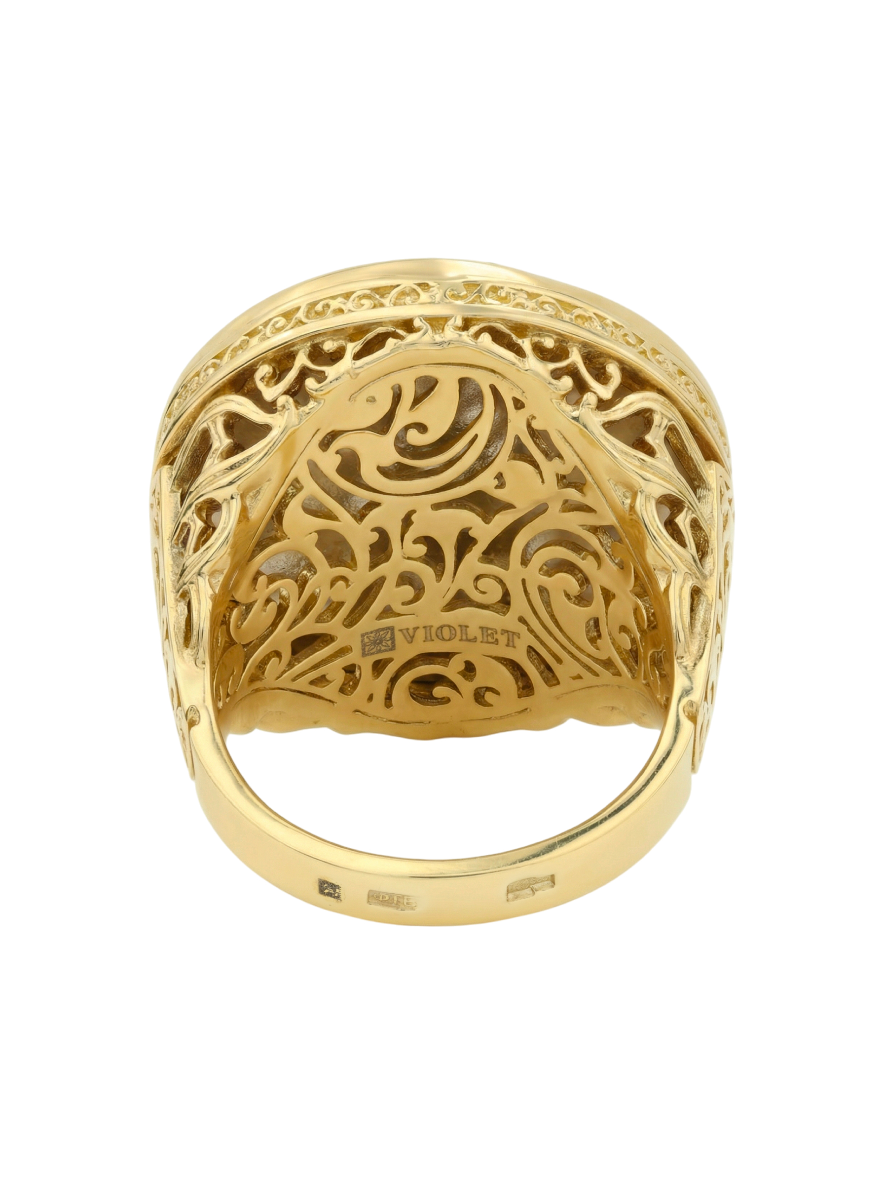 Особую выразительность изделию придает яркая разноцветная эмаль, служащая изысканным фоном для центрального элемента. Ажурные боковые грани кольца подчеркивают статусность дизайна и придают украшению воздушный, но солидный вид. Ювелирное изделие гармонично впишется в образ как для женщин, так и для мужчин, подчеркивая индивидуальность владельца.