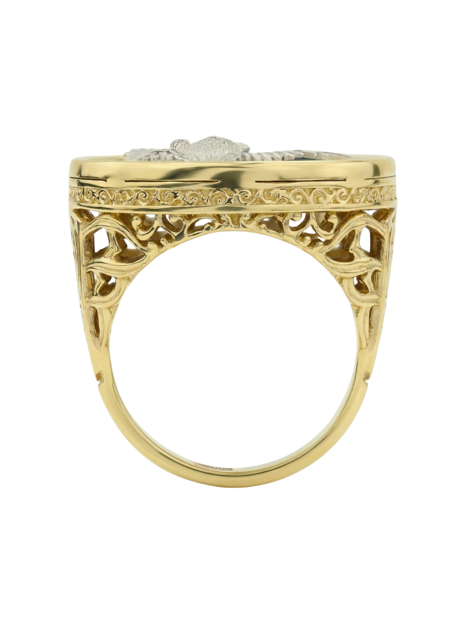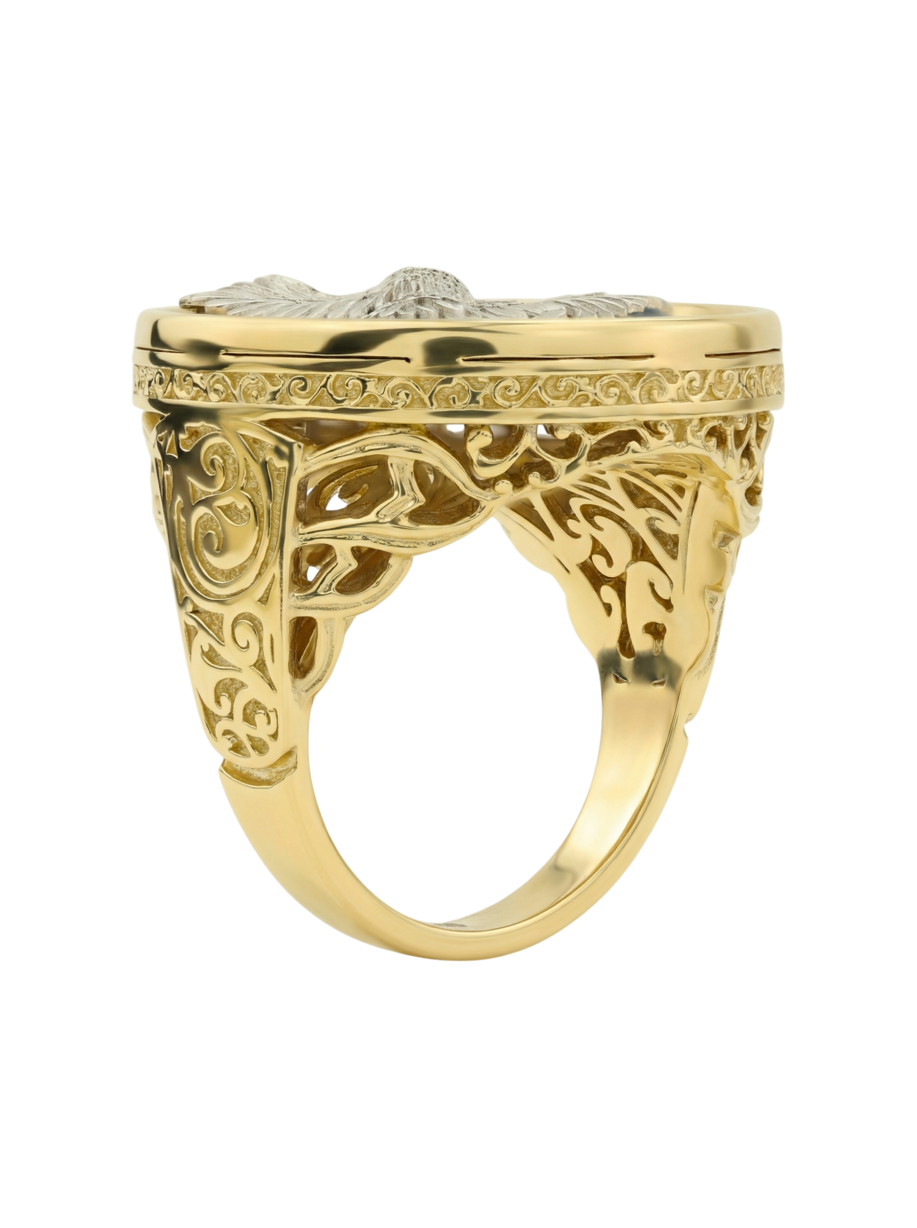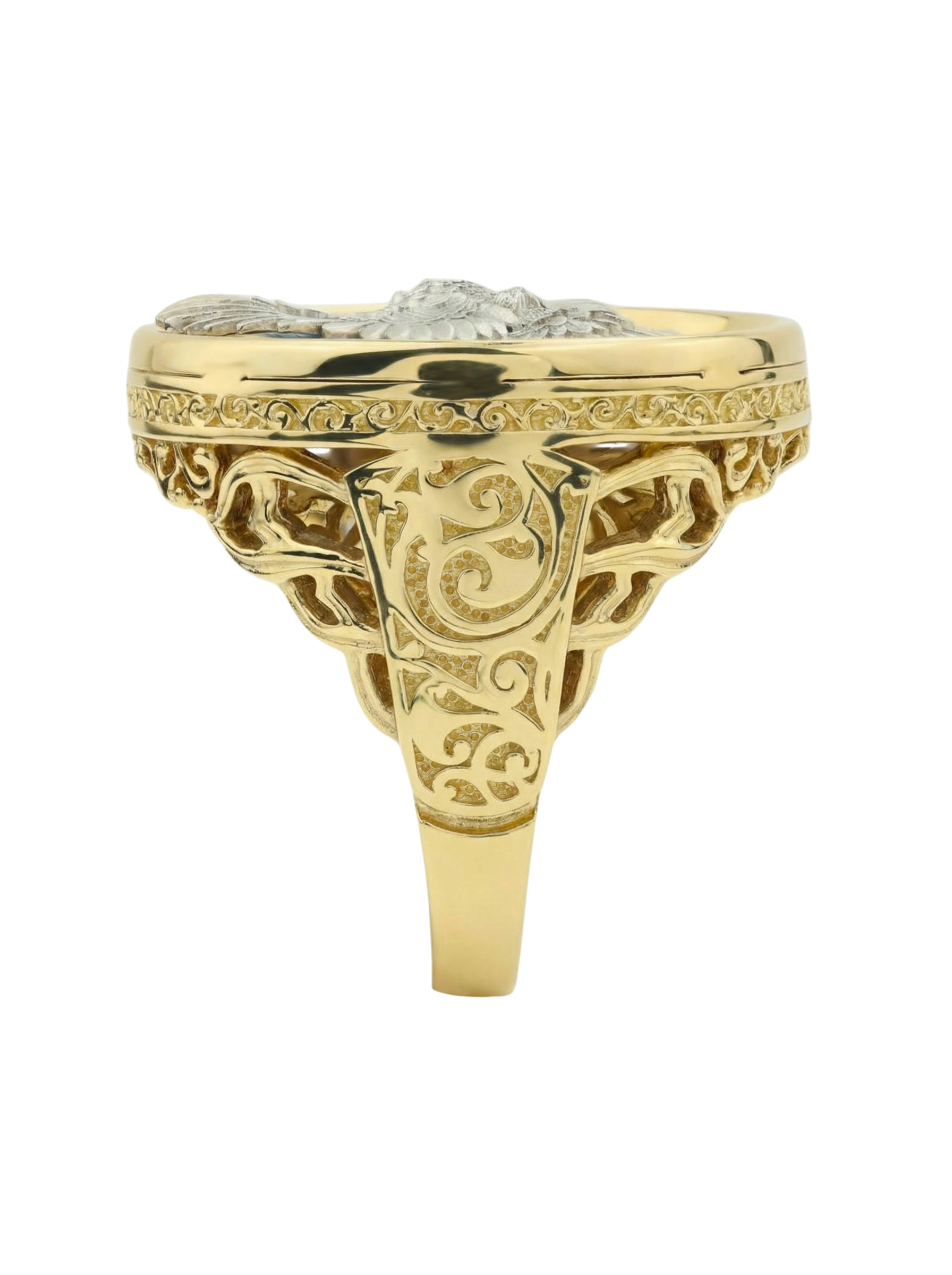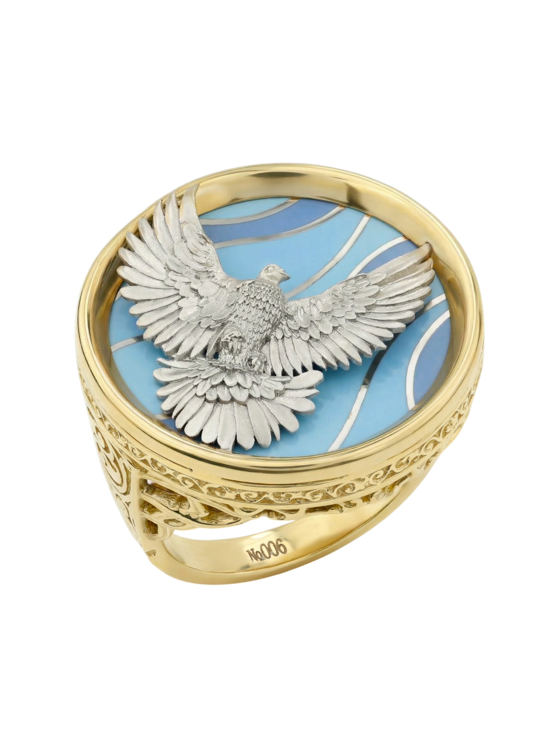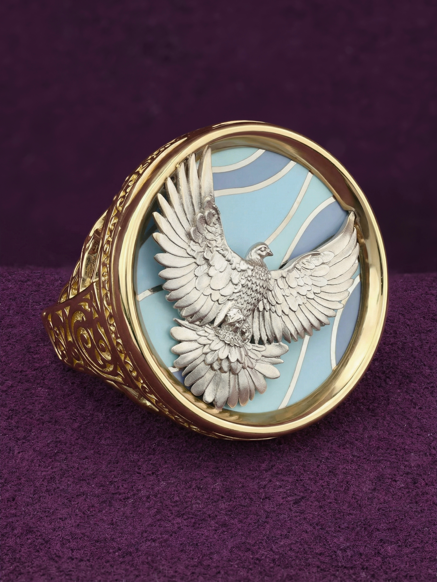 Кольцо из лимонного золота 585 пробы из коллекции De luxe Premium — Голубь мира станет символом утонченного вкуса и глубокого смысла. В центре композиции находится изящное изображение птицы — голубя, выполненное с высокой детализацией. Это украшение притягивает взгляд оригинальным сочетанием благородного металла и художественного мастерства.