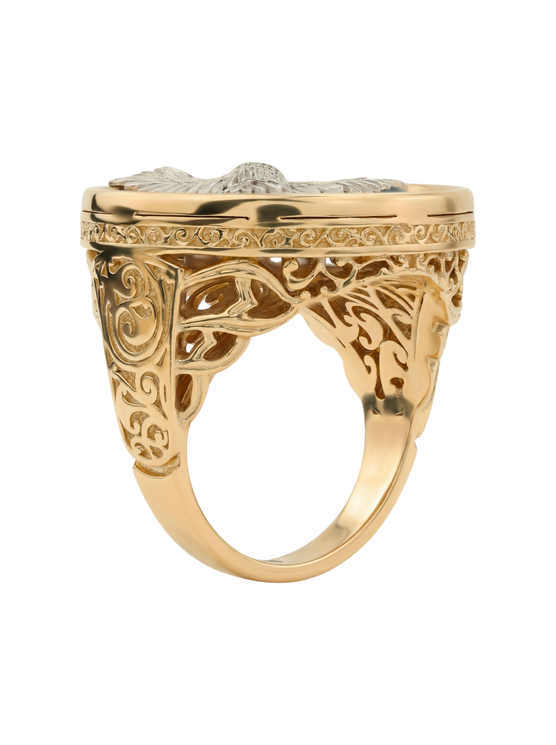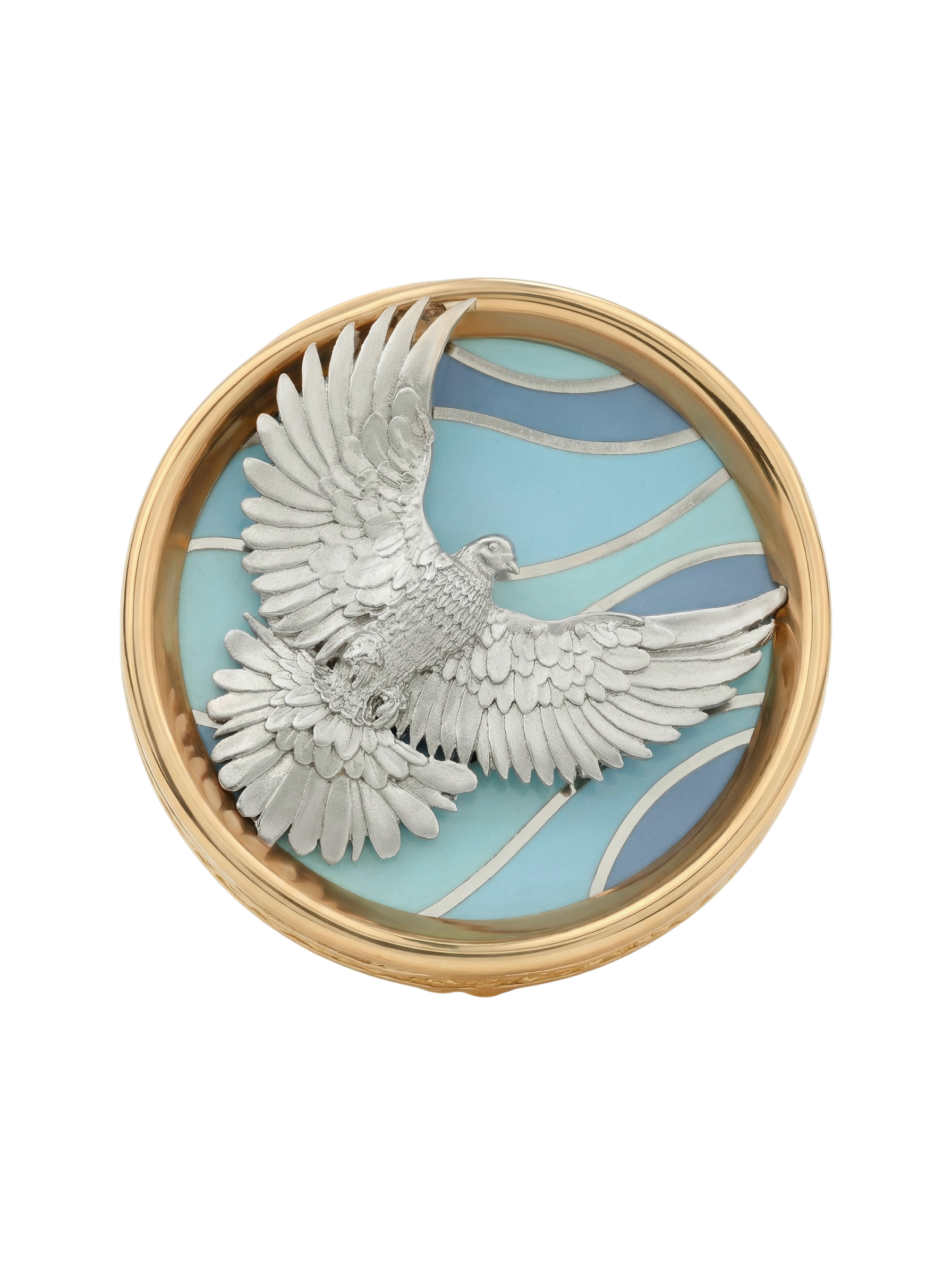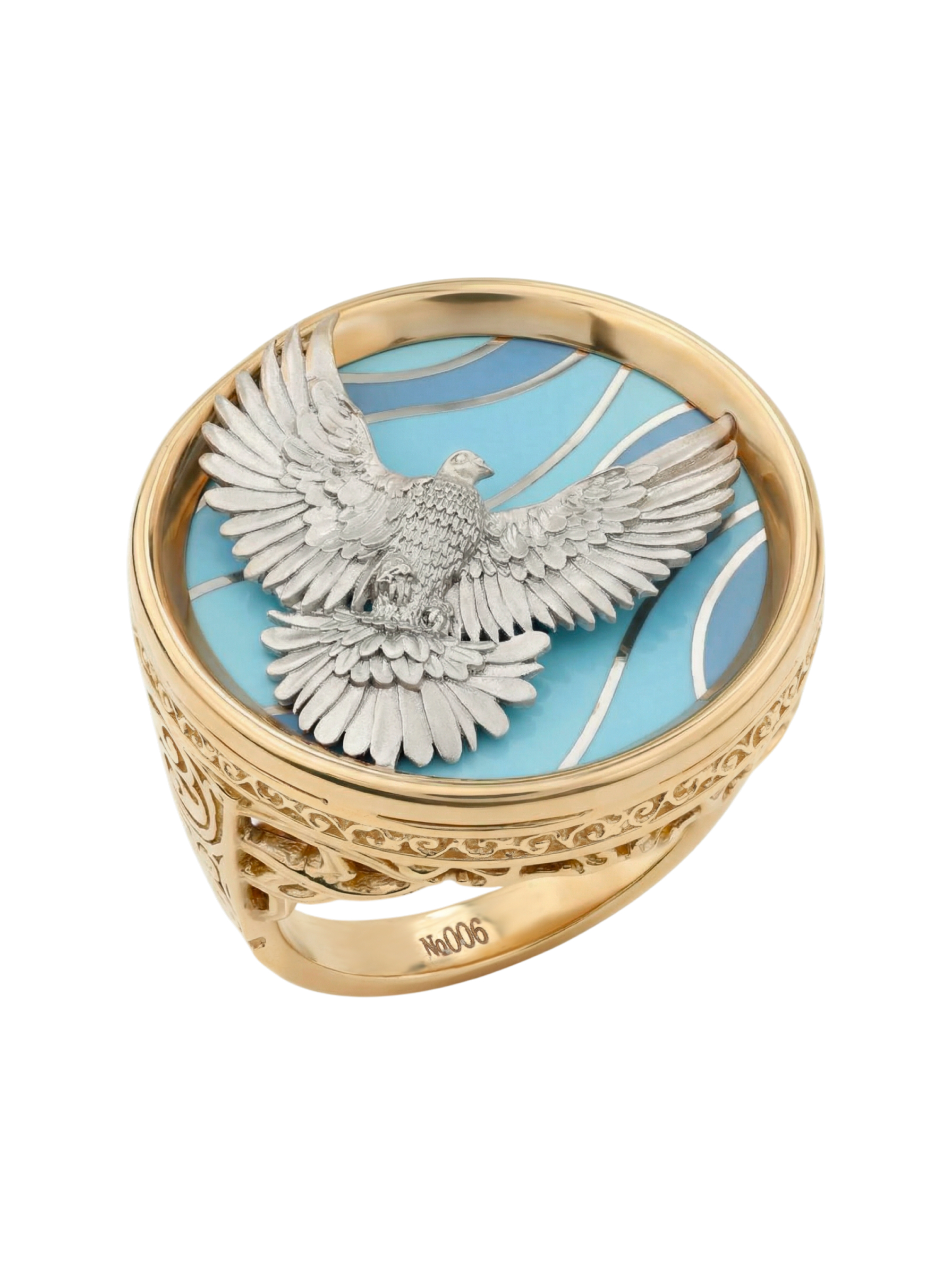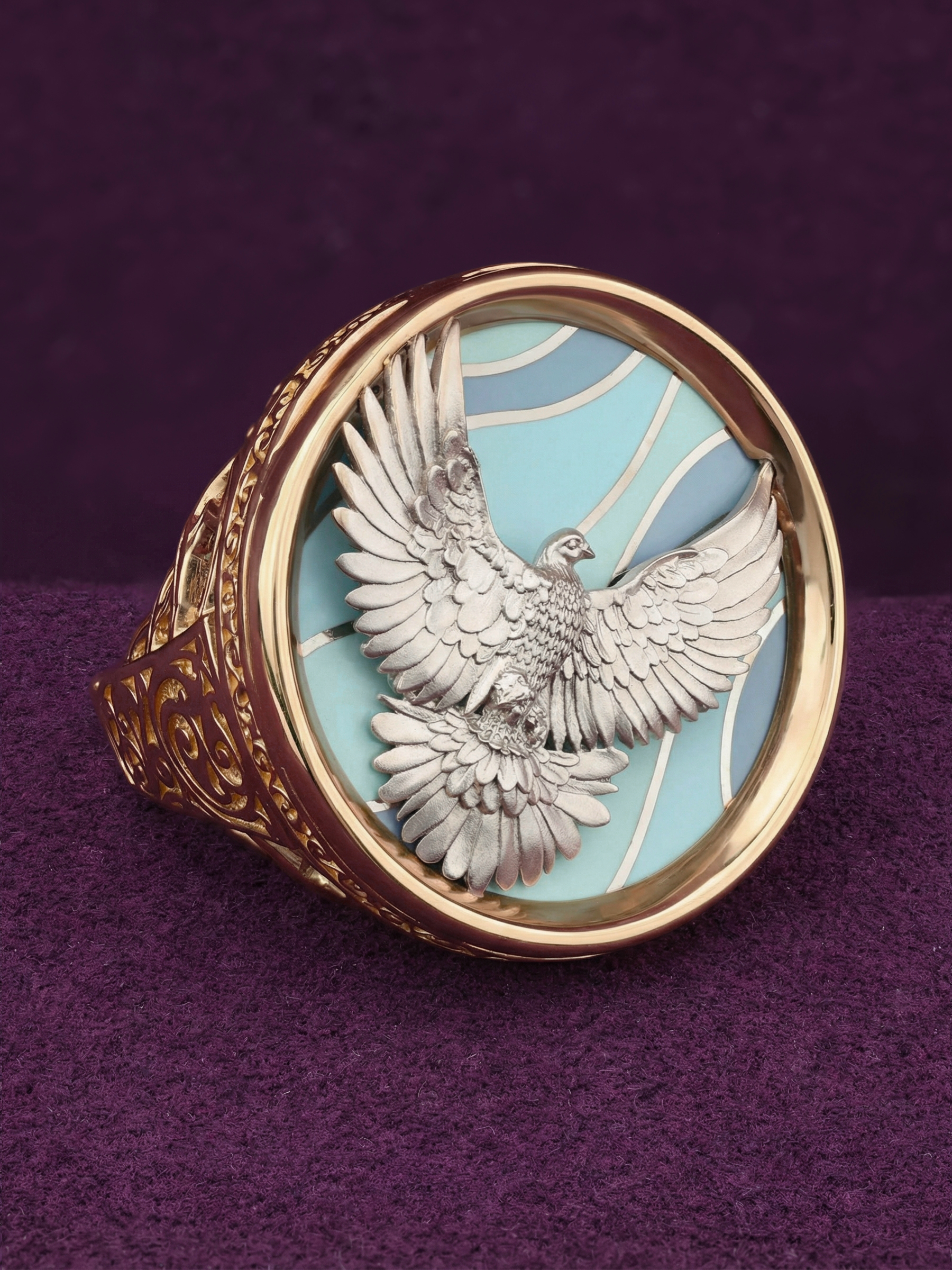 Кольцо из красного золота 585 пробы — это изысканное ювелирное украшение, которое станет ярким акцентом вашего образа. Изделие представлено в рамках коллекции De luxe Premium — Голубь мира и привлекает внимание своим глубоким смыслом и оригинальным исполнением. Центральным элементом дизайна является мастерски выполненная фигура птицы — голубя, который символизирует мир и гармонию. Детально проработанное изображение контрастирует с нежным фоном, оформленным разноцветной эмалью с плавными линиями.