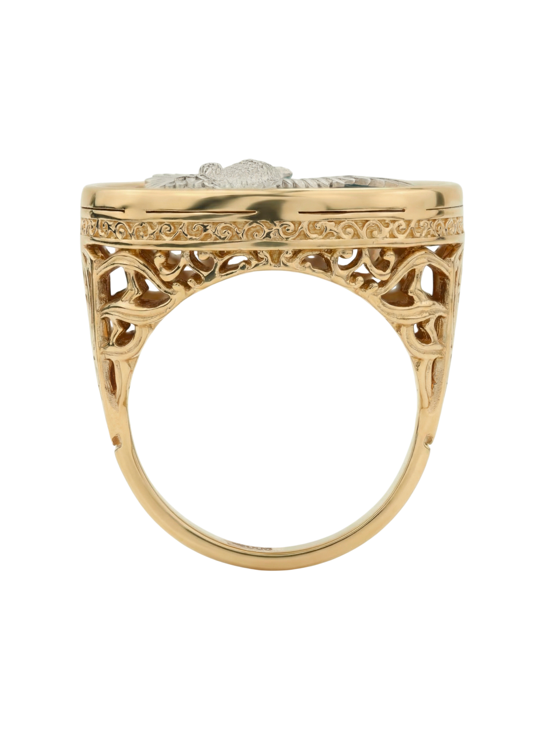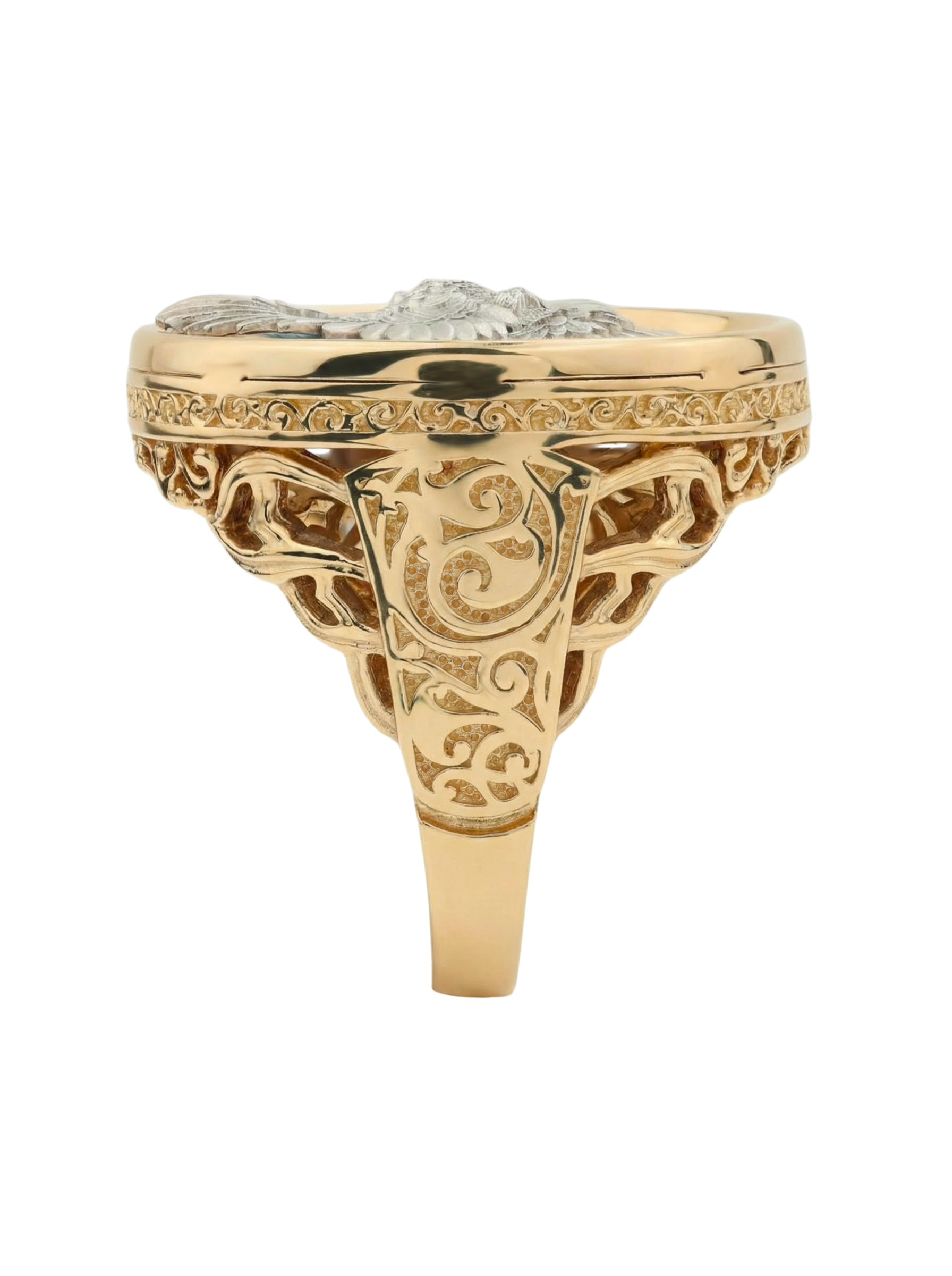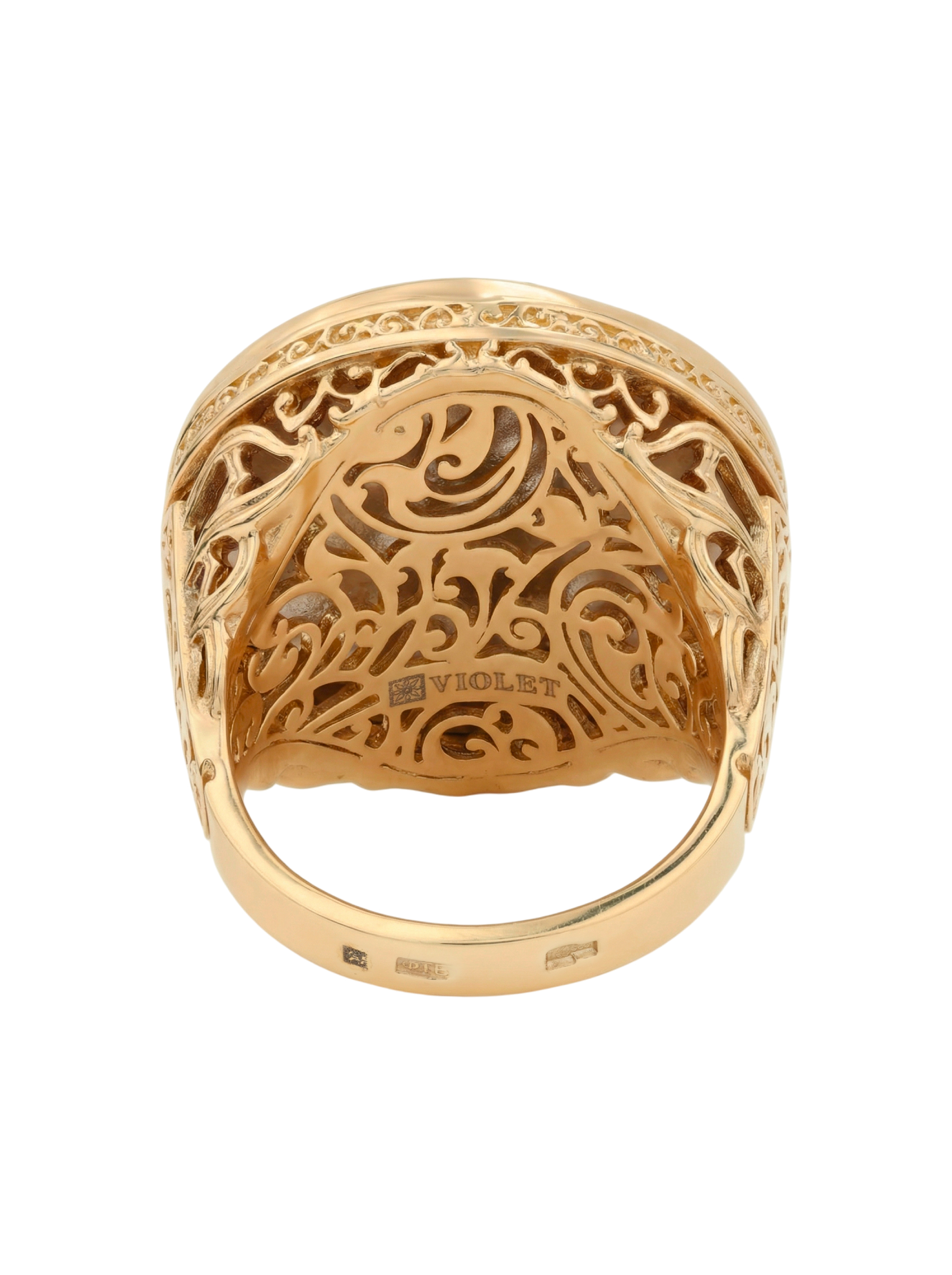 Массивный и благородный вид кольцу придает качественное красное золото, которое великолепно сочетается с ювелирной эмалью. Ажурные боковые элементы шинки подчеркивают статусность украшения и дополняют сложный художественный замысел. Это универсальный аксессуар, который одинаково гармонично смотрится как на женской, так и на мужской руке, подчеркивая индивидуальность владельца.