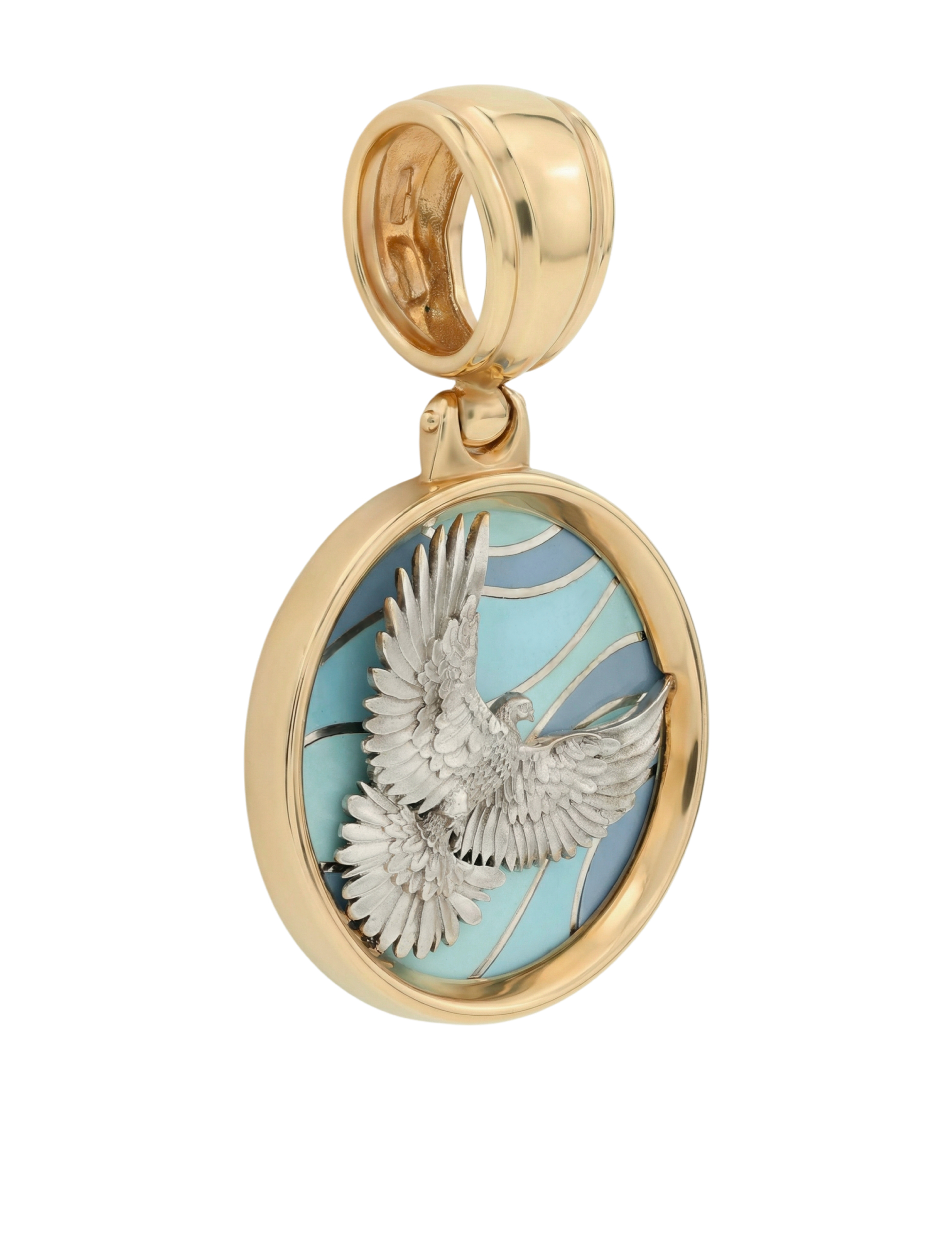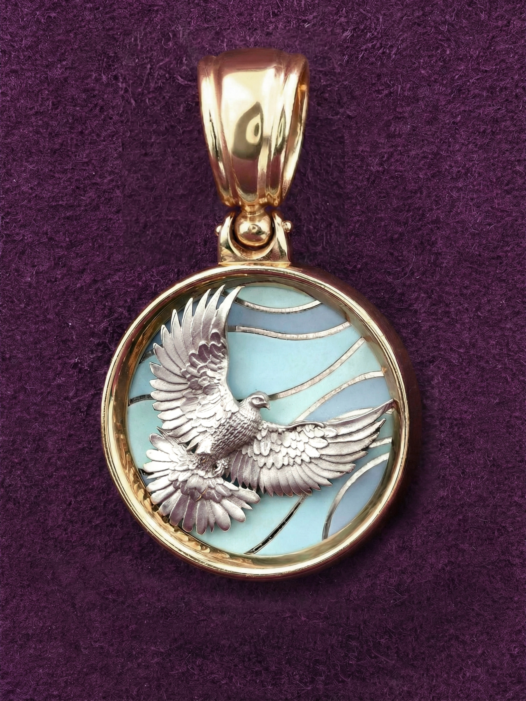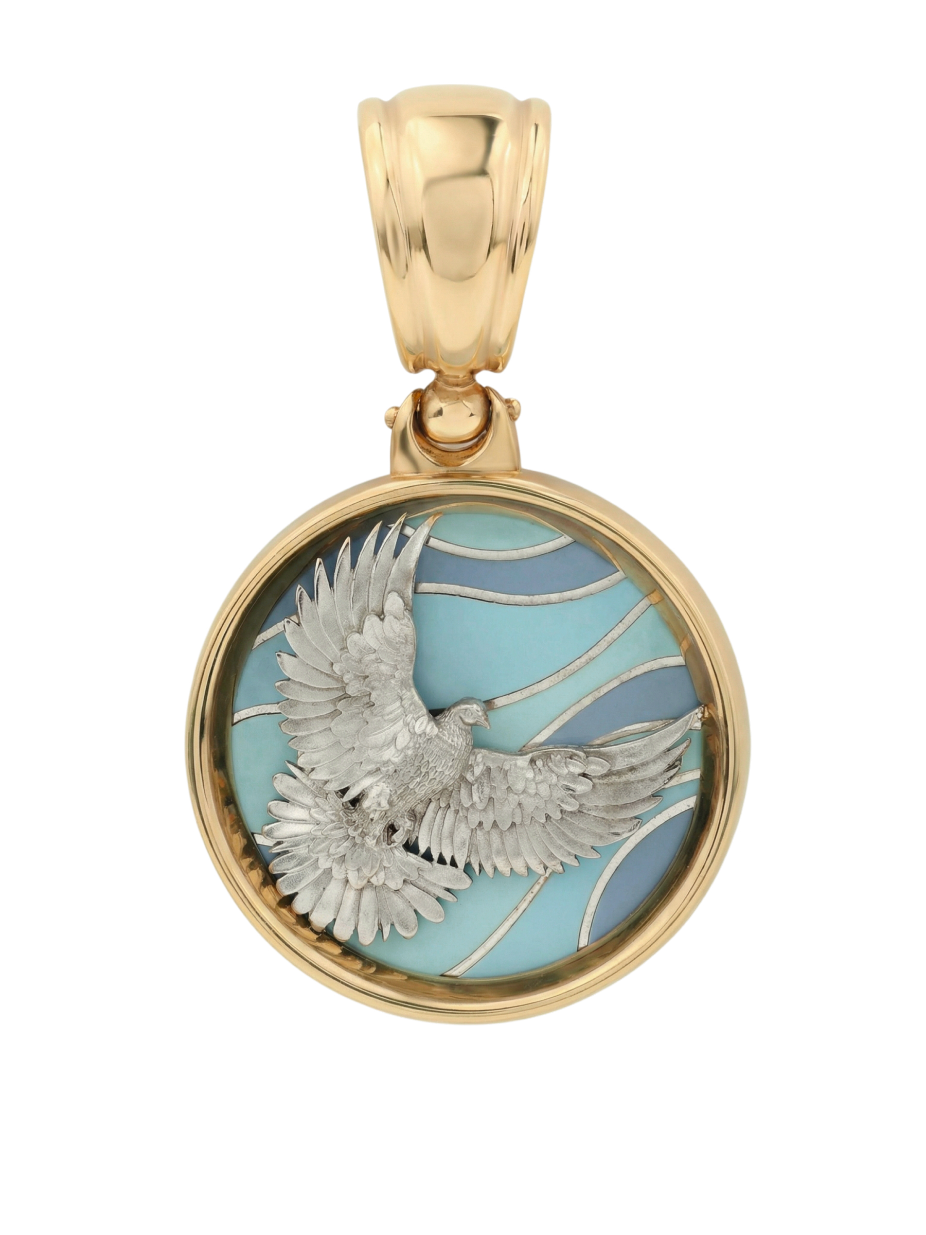 Подвеска из золота с эмалью — изящное украшение, воплощающее глубокий смысл и безупречное мастерство исполнения. Изделие входит в коллекцию De luxe Premium — Голубь мира, вдохновленную символом мира и гармонии. Центральным элементом композиции является искусная фигура птицы, выполненная в детальном дизайне, который подчеркивает каждый изгиб крыльев и грацию движения.