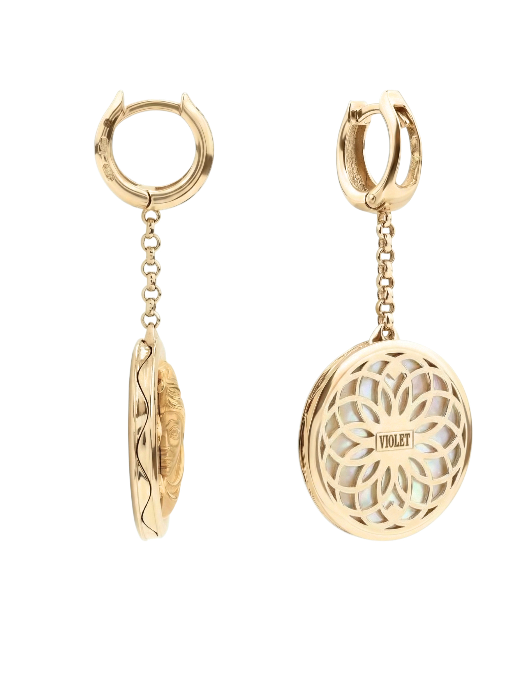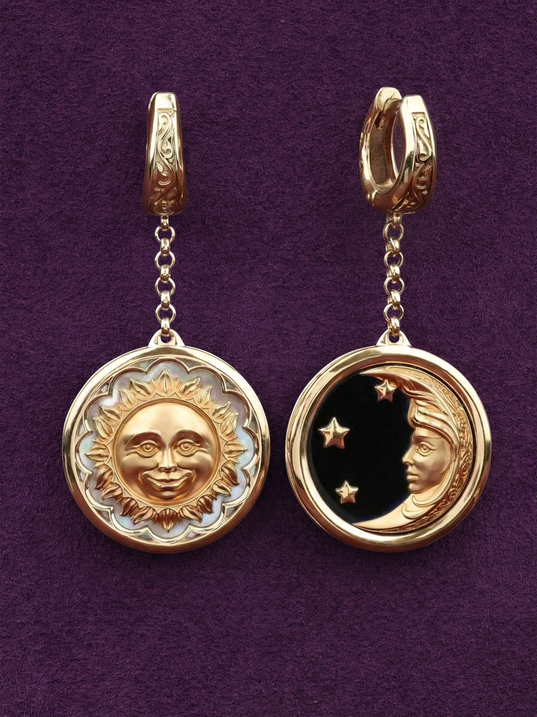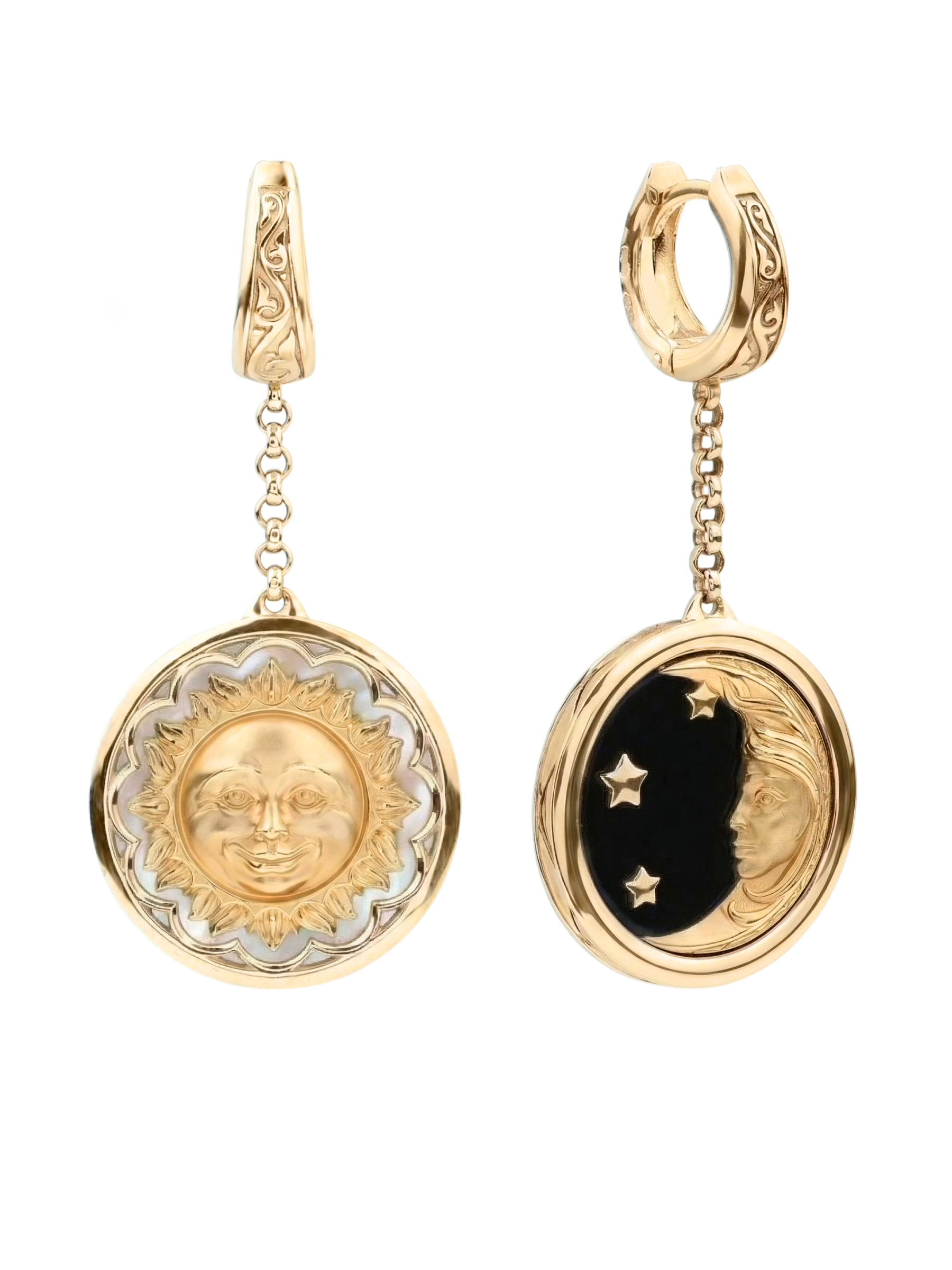 Серьги выполнены из благородного красного золота 585 пробы. Контрастное сочетание вставок делает их по-настоящему уникальными: одна серьга декорирована перламутром светлого оттенка, подчеркивающим сияние дневного светила, а другая — глубоким черным ониксом, на фоне которого особенно эффектно смотрятся контуры луны и звезд. Использование круглых вставок гармонично завершает композицию, придавая украшению завершенность и эстетическую стройность.