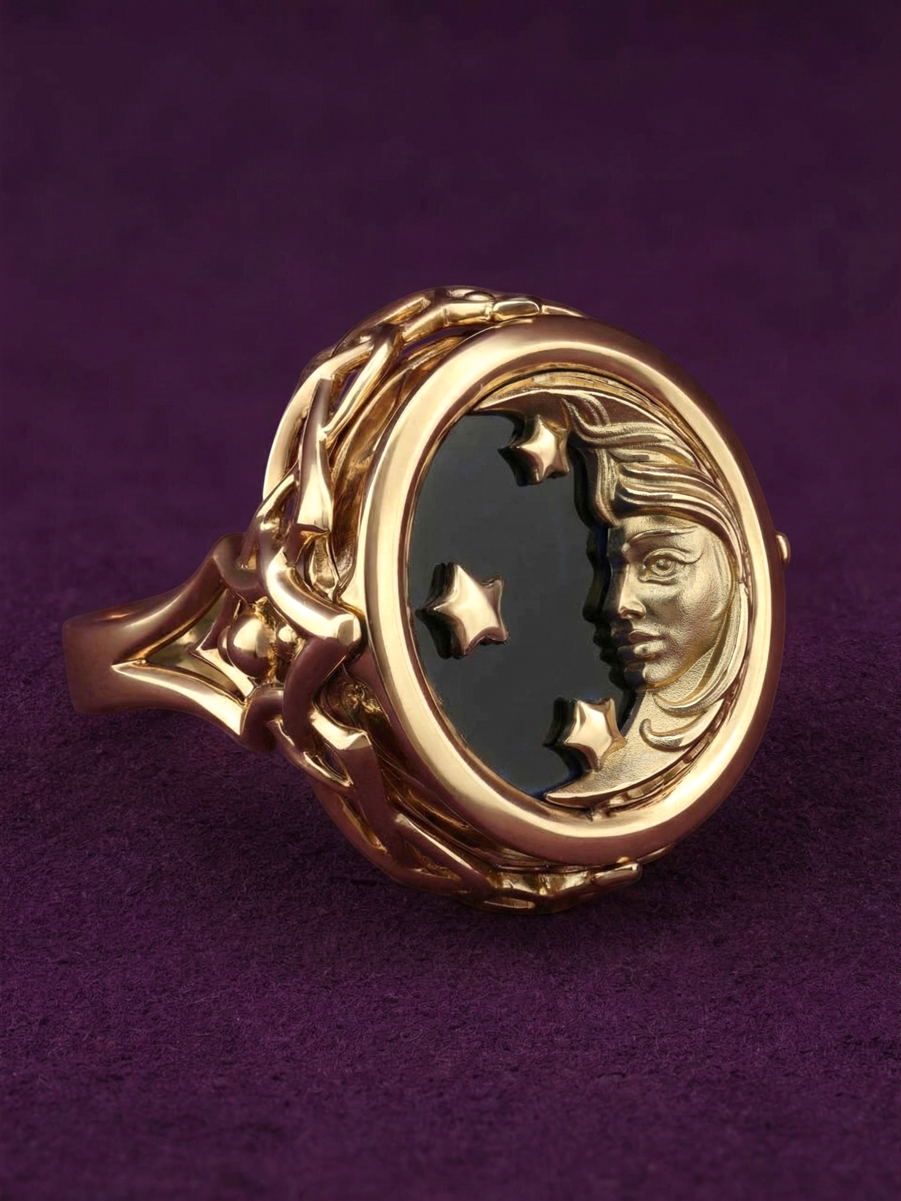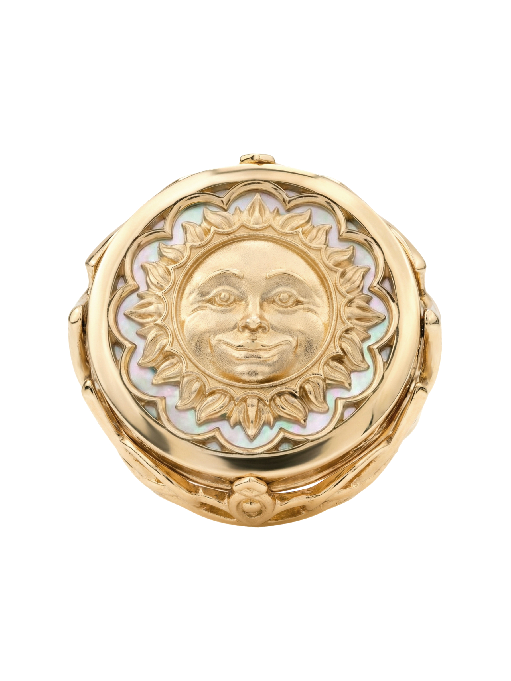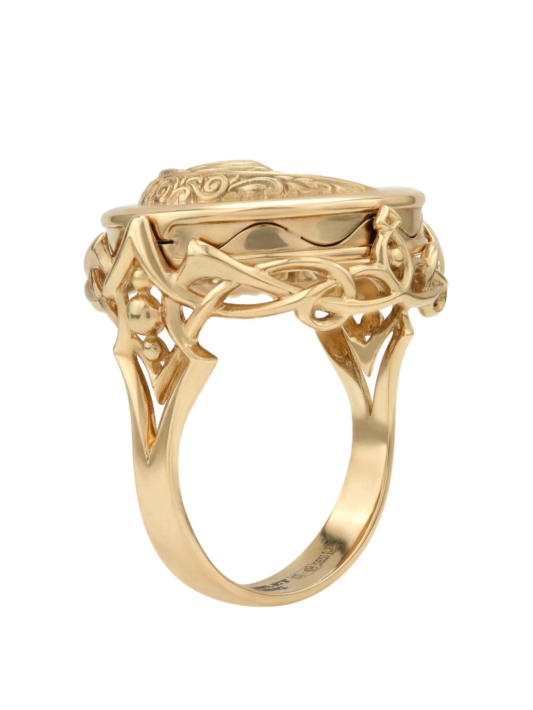 Кольцо из красного золота 585 пробы из коллекции De luxe Premium — День и ночь — это ювелирное произведение искусства, воплощающее мистическую гармонию ночи. Дизайн украшения, выполненный в тематике солнце/луна, притягивает взгляд своей глубокой символикой и филигранной детализацией. Центральным элементом композиции является вставка круглой формы, сочетающая в себе магический черный оникс и нежное сияние перламутра.