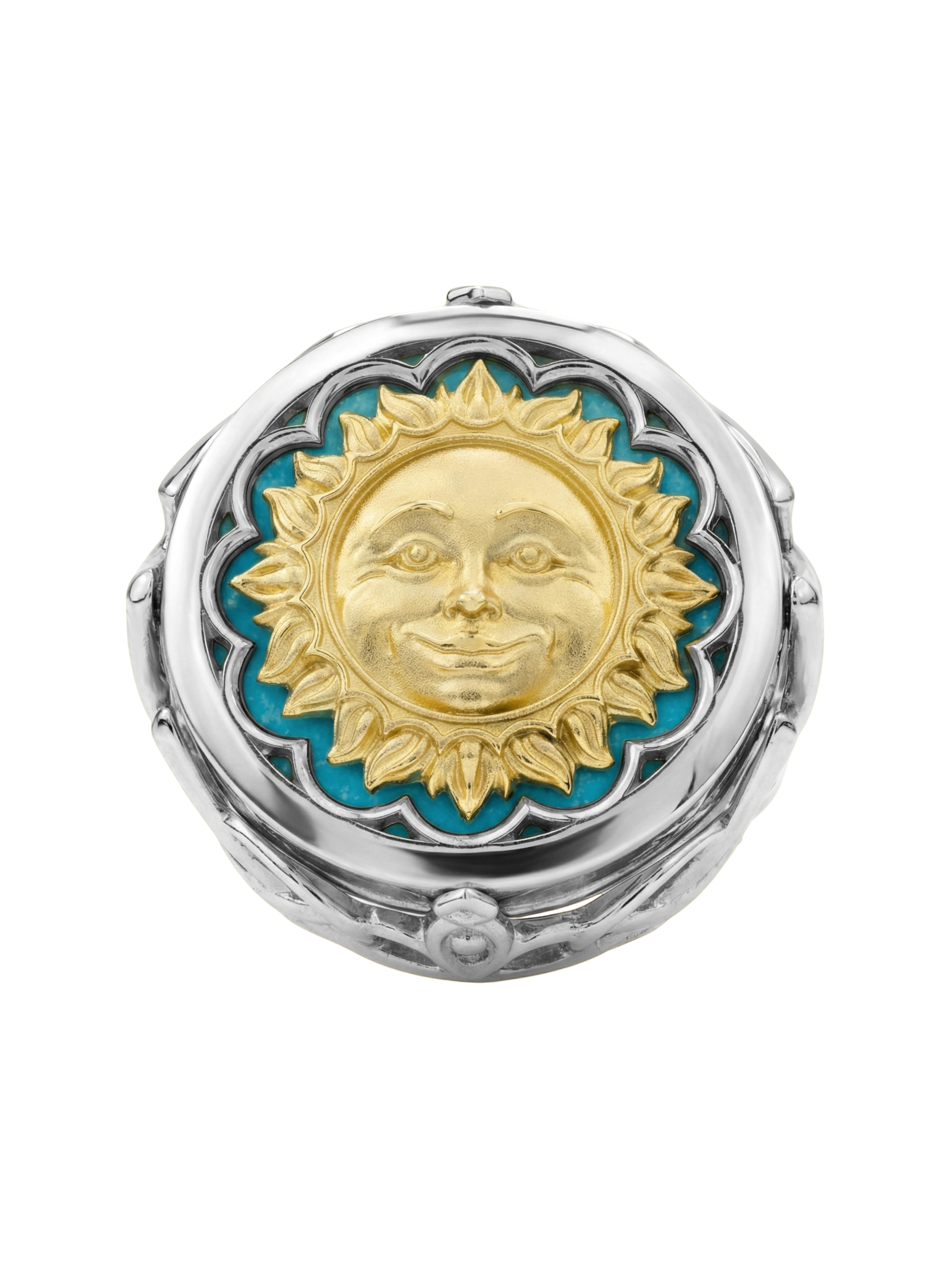 Кольцо из белого золота с бирюзой и лазуритом из коллекции De luxe Premium — День и ночь станет символичным украшением для тех, кто ценит глубокую эстетику и искусство в ювелирном исполнении. Дизайн украшения обыгрывает вечную тему солнце и луна, создавая выразительный контраст между небесными светилами и драгоценными камнями. Белое золото 585 пробы служит благородной оправой для двух вставок круглой формы: нежной бирюзы бирюзового цвета и глубокого лазурита синего оттенка.